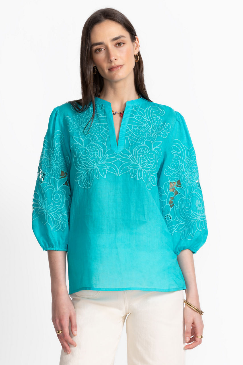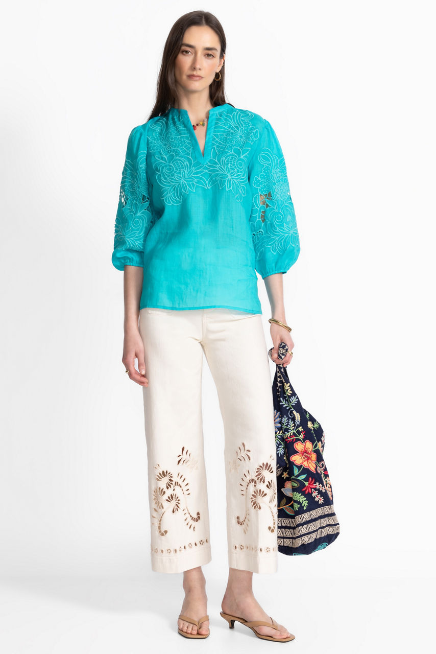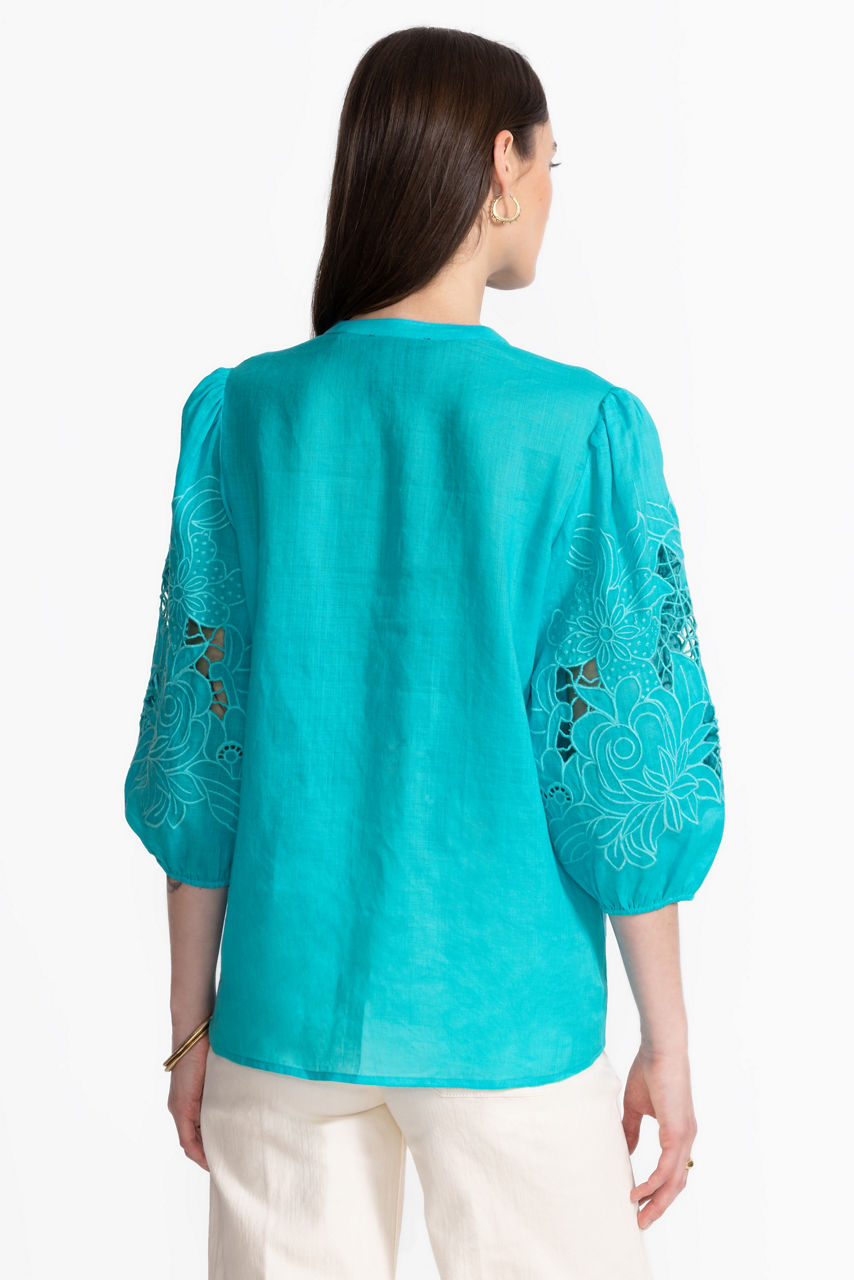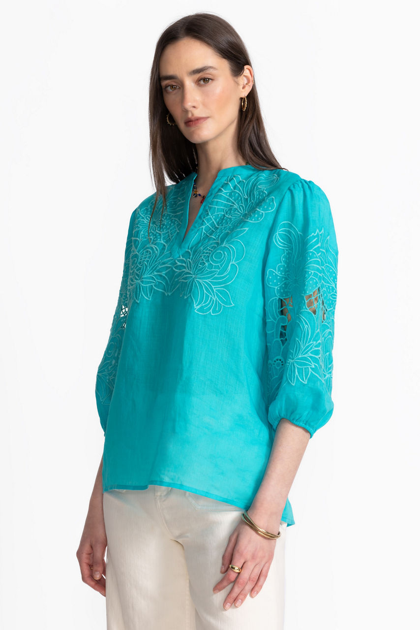 The Sadie Blouse exemplifies elevated casual style with intricate tone-on-tone embroidered floral detailing. Featuring a split V-neckline and gently puffed 3/4 bishop sleeves, this lightweight flowing blouse offers a relaxed fit and a refined curved hemline. Pair with fitted jeans and trendy ankle boots for a polished casual look.