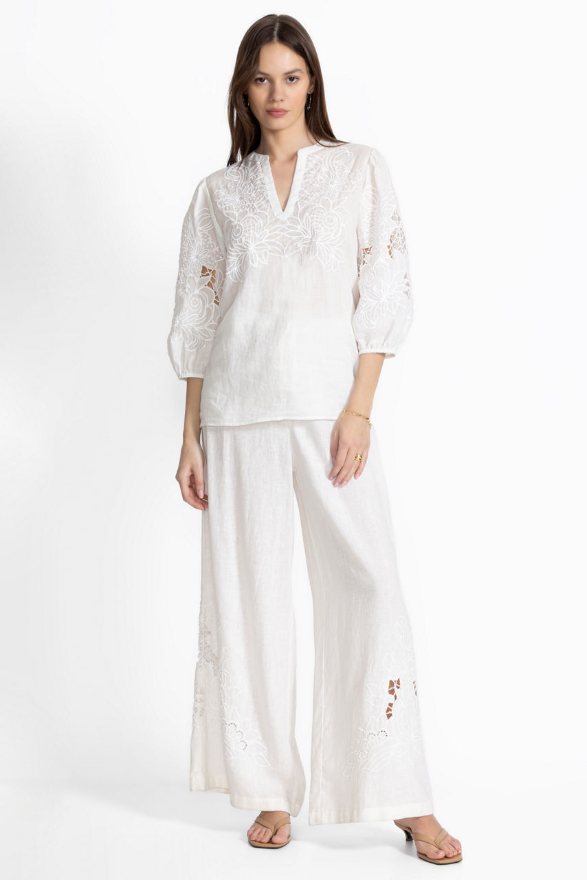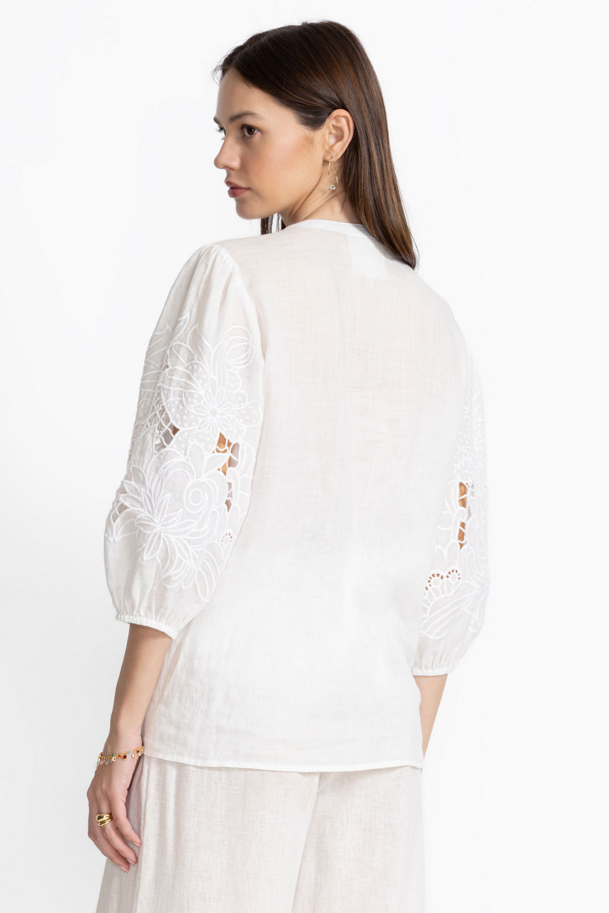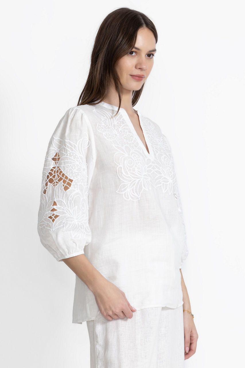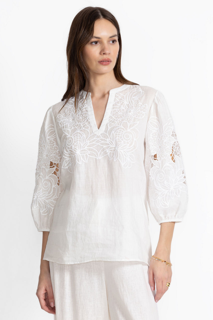 The Sadie Blouse exemplifies elevated casual style with intricate tone-on-tone embroidered floral detailing. Featuring a split V-neckline and gently puffed 3/4 bishop sleeves, this lightweight flowing blouse offers a relaxed fit and a refined curved hemline. Pair with fitted jeans and trendy ankle boots for a polished casual look.