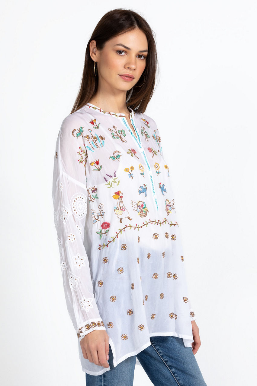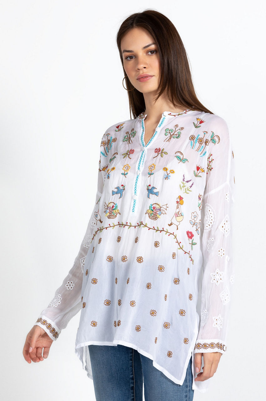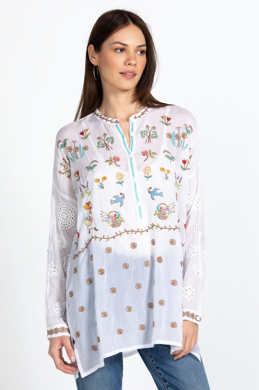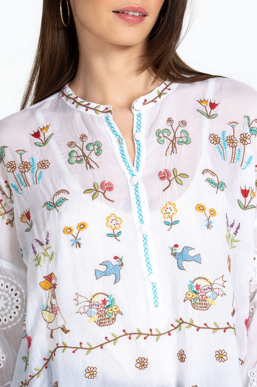 Flower-dotted and joyful, the Sami Tunic brings to mind summer memories and sun-filled lazy afternoons. Spun from smooth rayon with eyelet detailing at the sleeves, this blouse features a round neck, a front button fastening, long sleeves, and a placement embroidery consisting of lively, vibrant florals. Style with a skirt on your next vacation or pair with pants for a stylish wear-anywhere look.