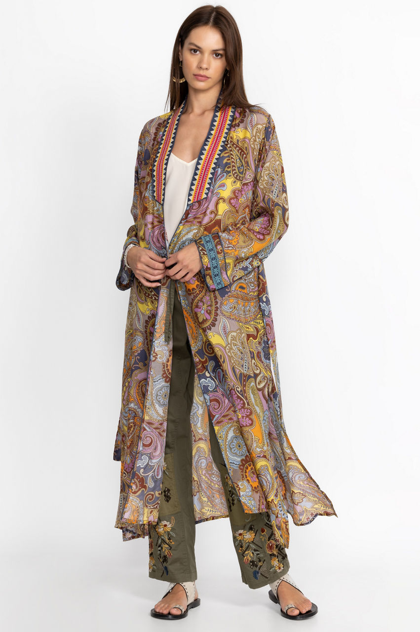 Mesmerizing patterns decorate the Sandalwood Tove Kimono for a stunning take on wearable luxury. Elevate your lounging experience with this intricately designed full-length kimono crafted from 100% spun silk and featuring roomy side pockets. Layer over coordinating Sandalwood sleepwear or your own lounging favorites along with cozy slippers for an evening in.