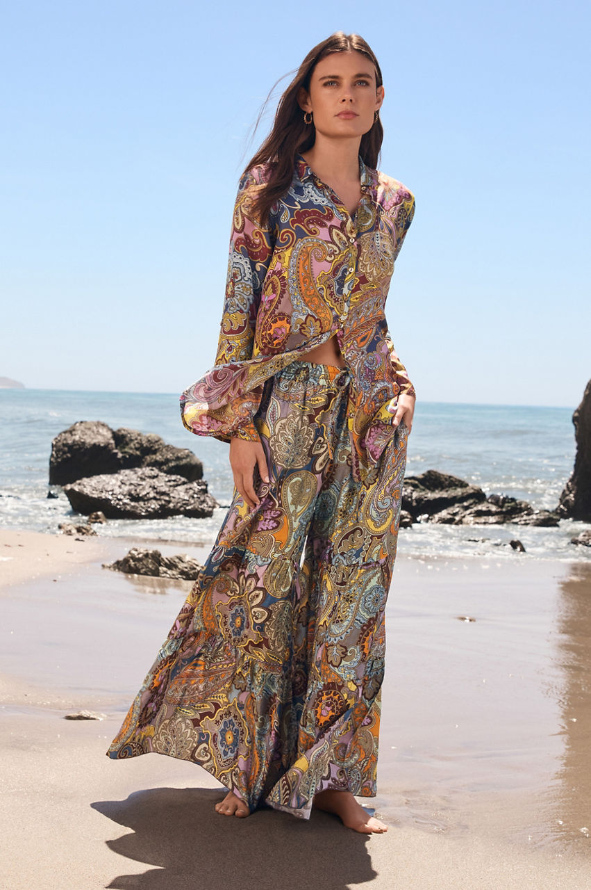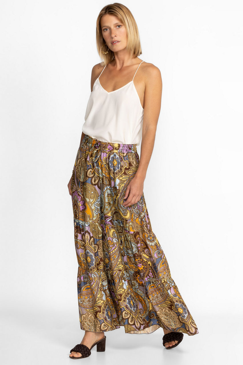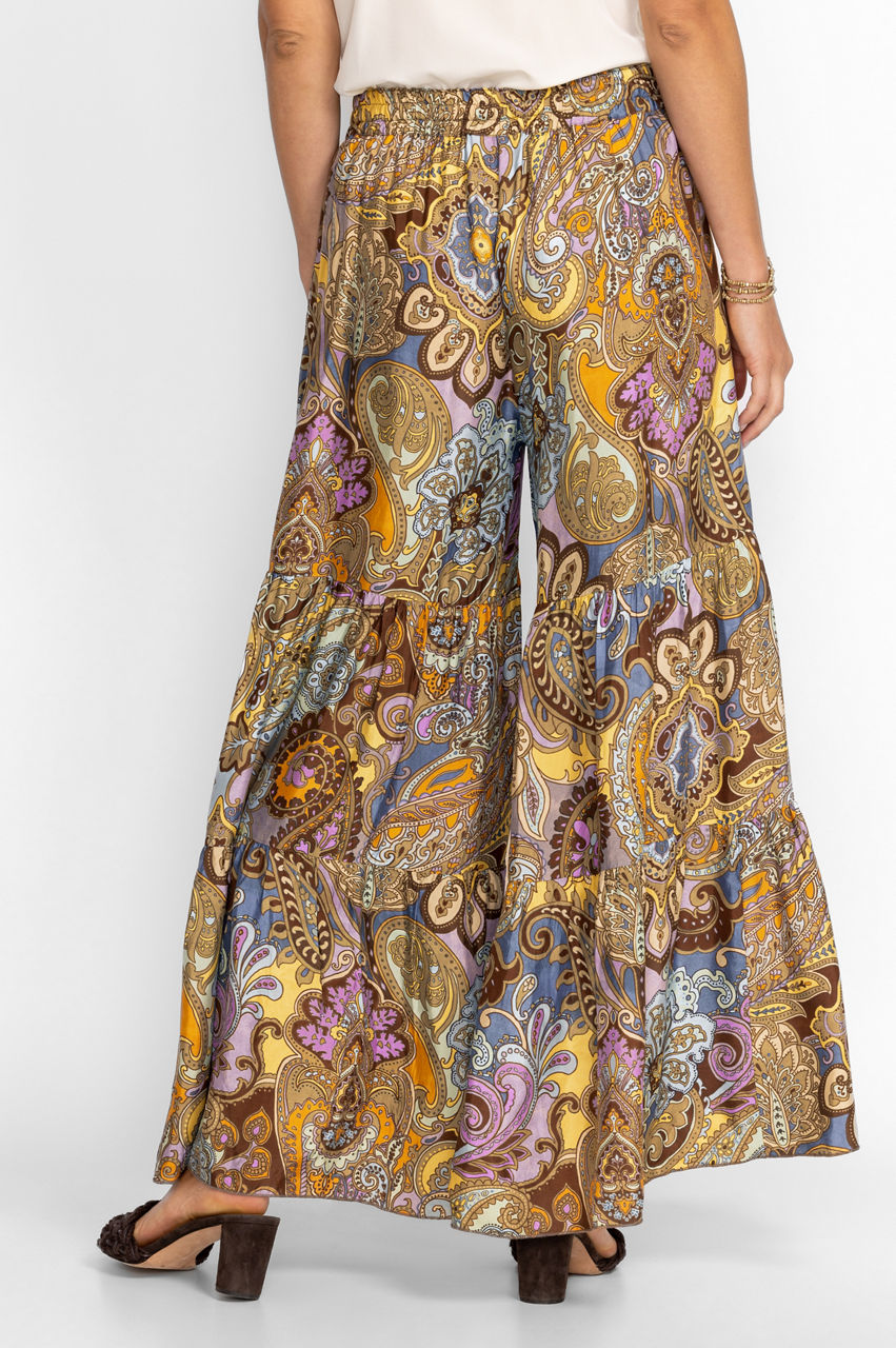 Presenting a rich color palette with a Bohemian flair, the Sandalwood Viola Pant is a free-spirited take on a traditional trouser. Featuring a tiered palazzo style leg line and a casual merrow hem edge, these pants offer freedom from traditional silhouettes. Pair with a fitted top and denim jacket for a multi-season ensemble.