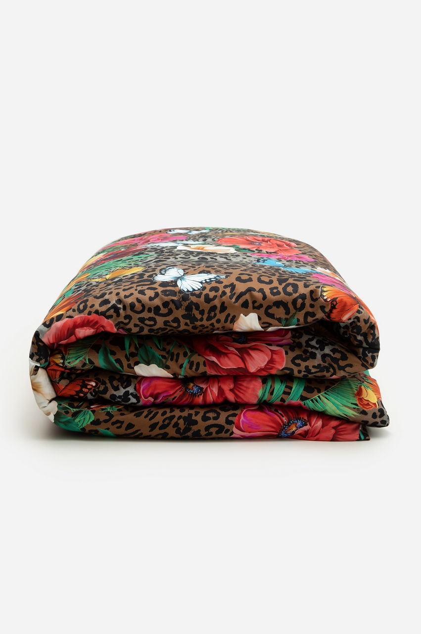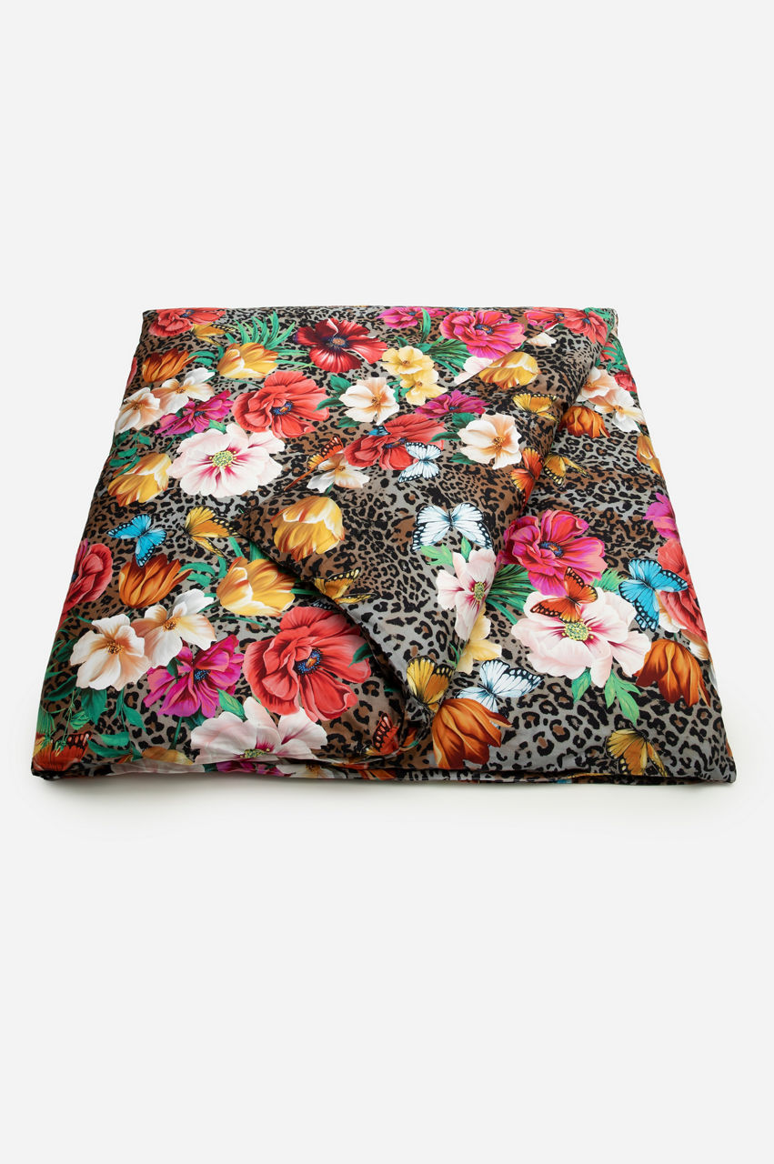 Make a statement with this elegant and colorful duvet. This original piece mixes floral elements with a leopard print for a stunning result. The contrast makes the color of the flowers pop, while the leopard print introduces a unique pattern. Pair it with other animal-inspired bedding items, or add a few houseplants that complement the floral print.
