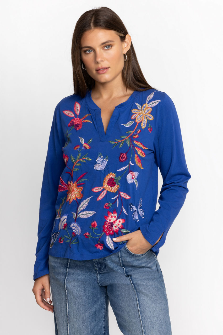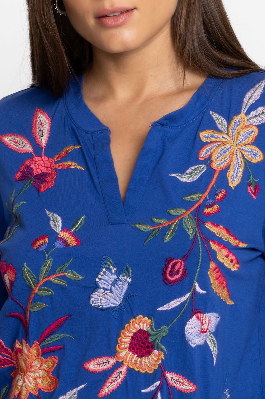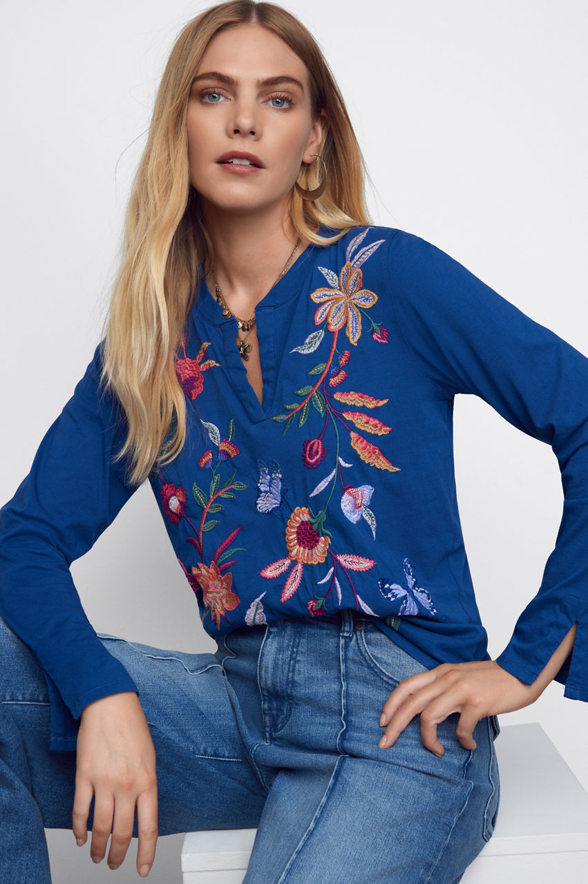 Displaying brilliant fresh floral bouquets on a classic casual silhouette, the Sandra Split Jersey Tee is a transitional season wardrobe must-have. Crafted from 100% cotton and intricately detailed with eye-catching embroidery, this casual top lends a feminine touch to a traditional wardrobe staple. Pair with leggings and fashion sneakers for a casual weekend look with added flair.