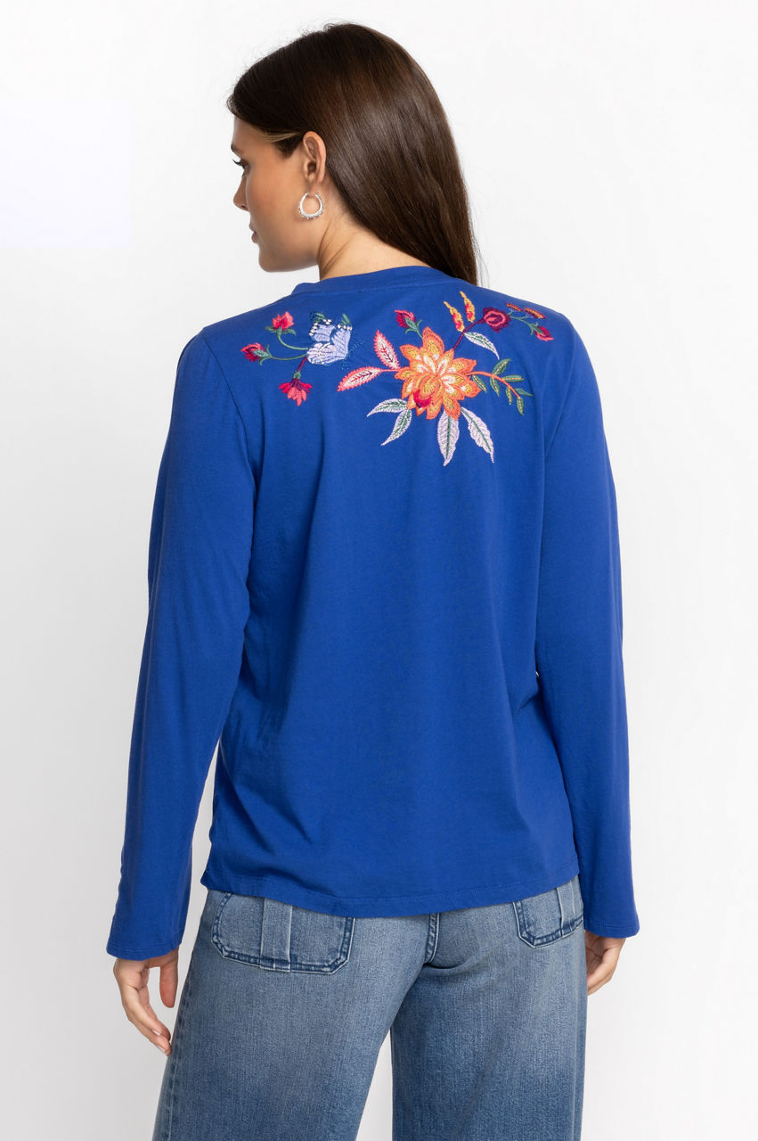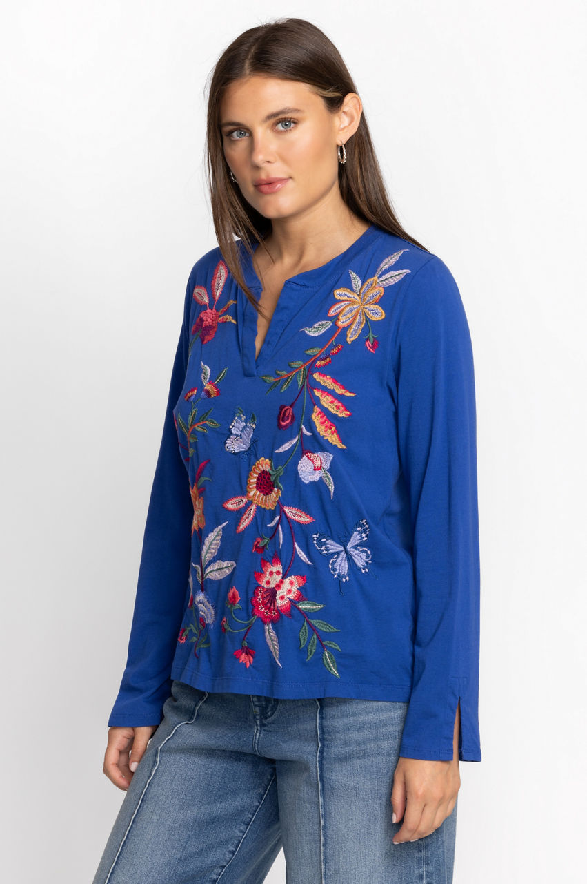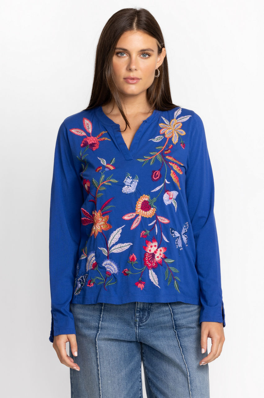 Displaying brilliant fresh floral bouquets on a classic casual silhouette, the Sandra Split Jersey Tee is a transitional season wardrobe must-have. Crafted from 100% cotton and intricately detailed with eye-catching embroidery, this casual top lends a feminine touch to a traditional wardrobe staple. Pair with leggings and fashion sneakers for a casual weekend look with added flair.