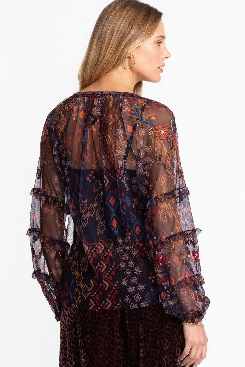 The Sapphire Mesh Blouse is crafted from a lightweight breathable mesh fabric and embellished with brilliant color and pattern. Designed with a split V-neck with a tassel closure, this slip-lined top is embellished with bishop sleeves and intricate ruffle details. Pair with wide-leg trouser jeans and wedge heels for a modern daytime ensemble.