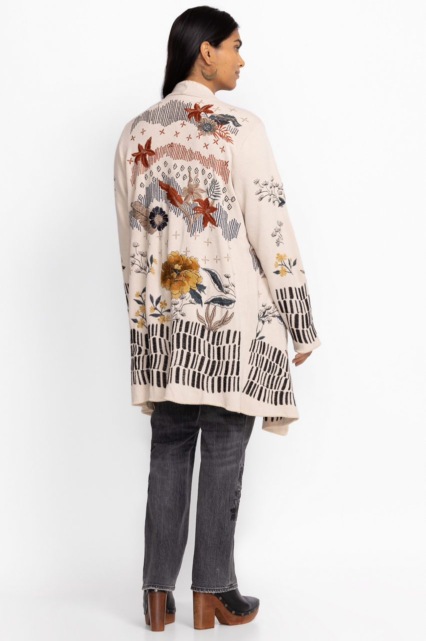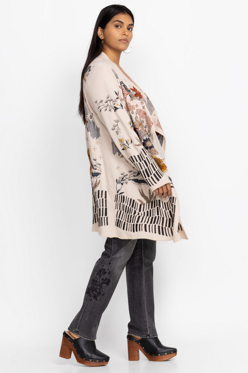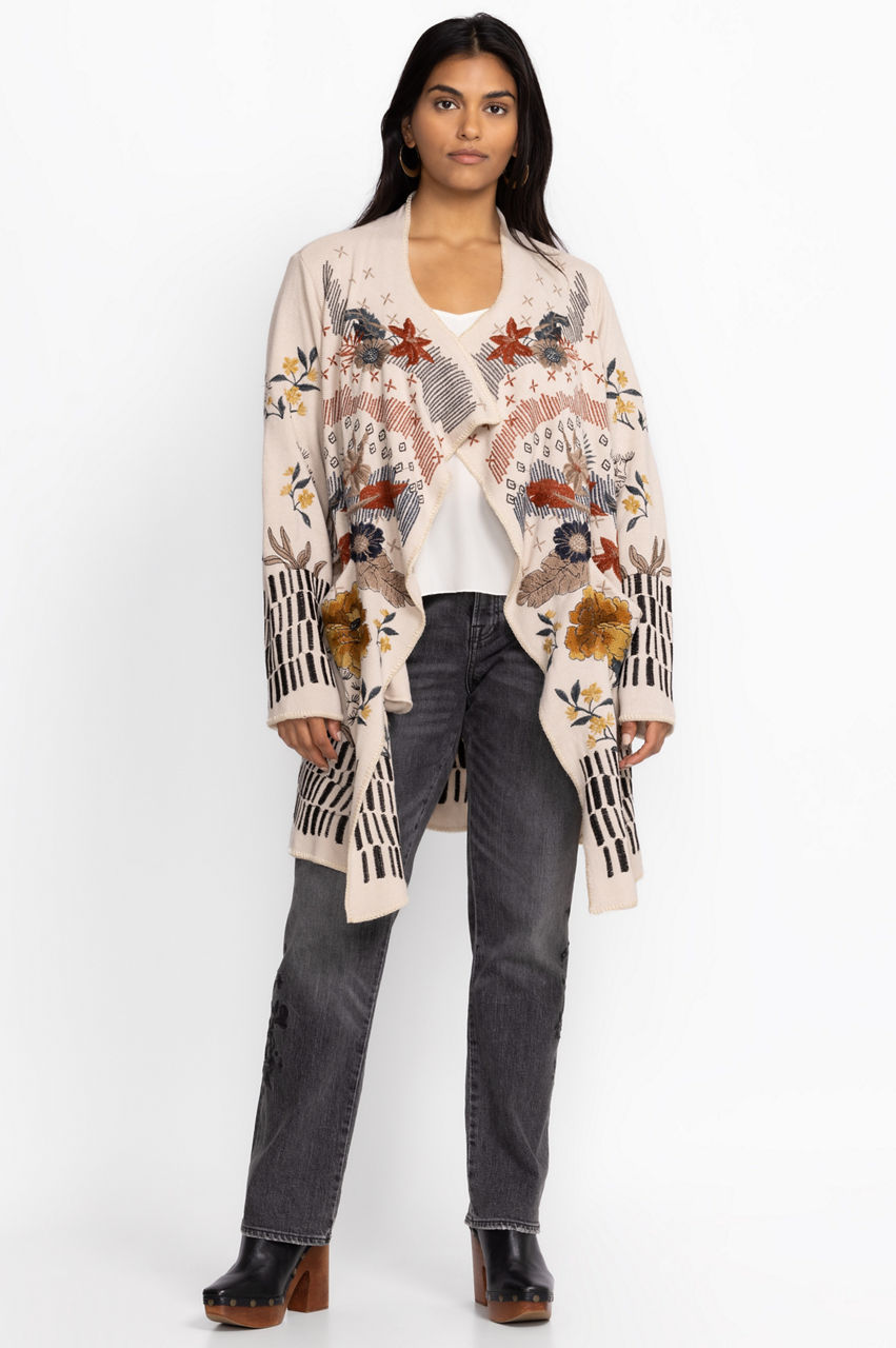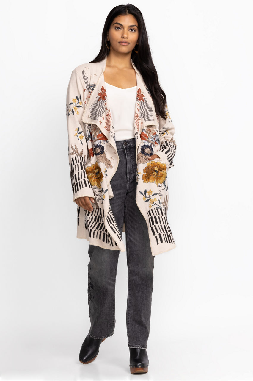 Take your new season wardrobe in a chic direction with the Sarina Wrap Sweater. A practical layer, this wrap sweater is made from a comfortable material and features a wrap style front, front pockets, long sleeves, and an intricate placement embroidery comprising opened blooms in contrasting tones. Layer this sweater over a tee or dress up with a blouse and smart pants.