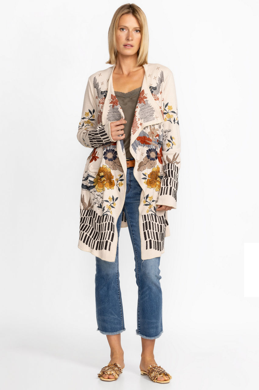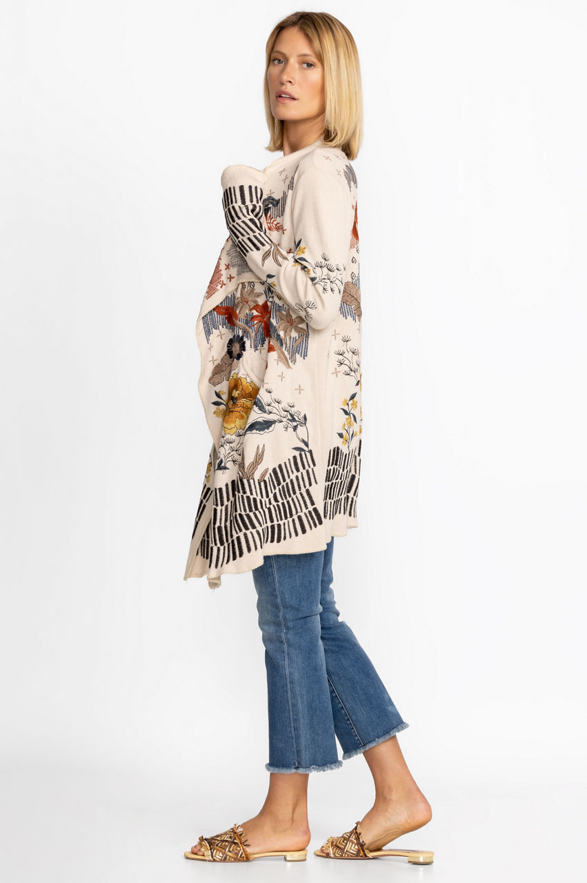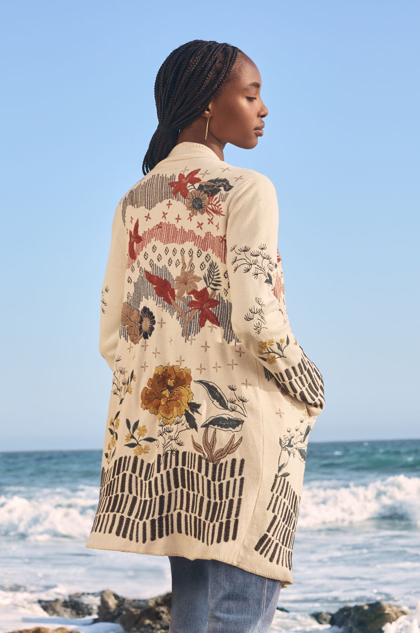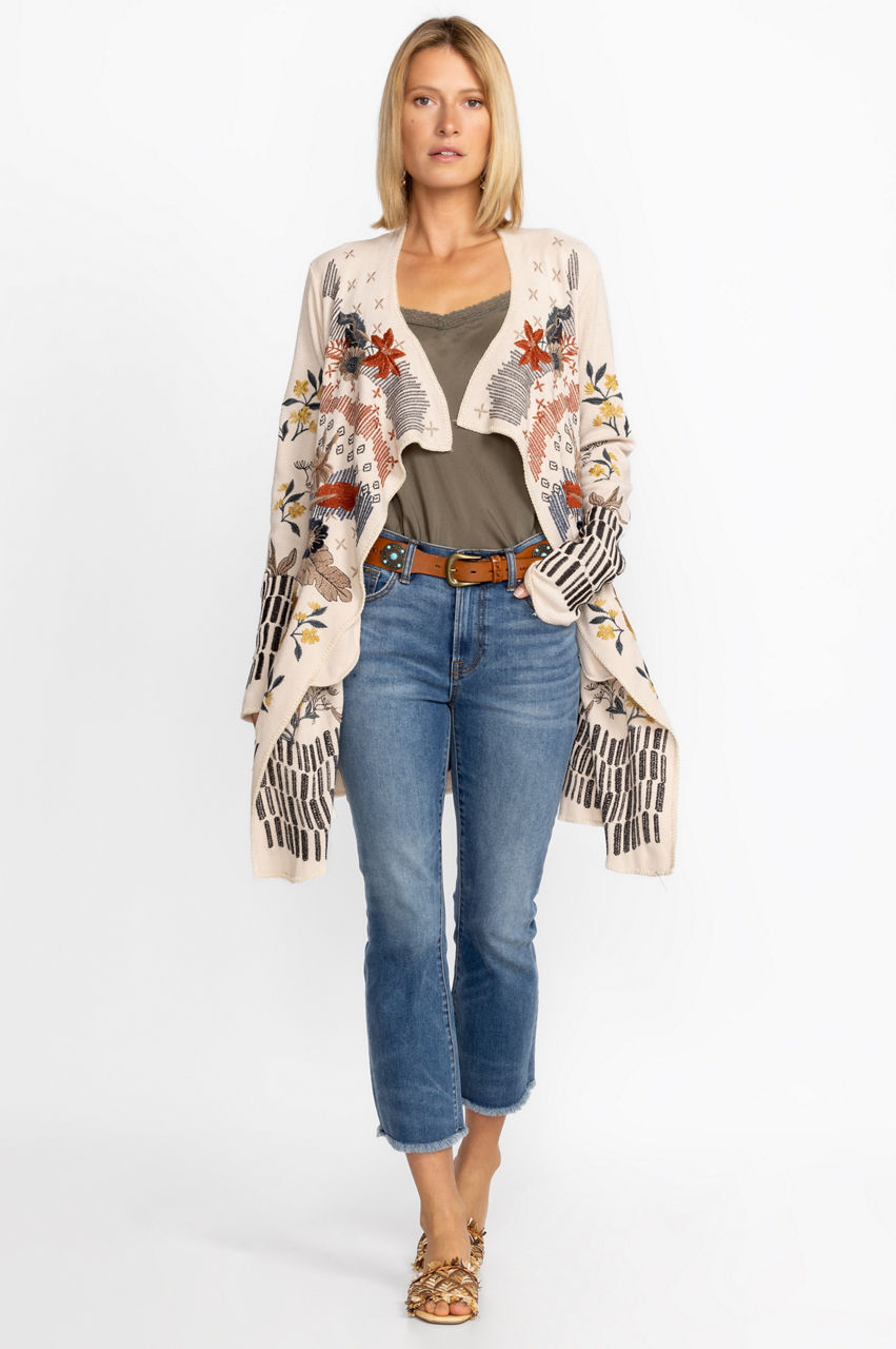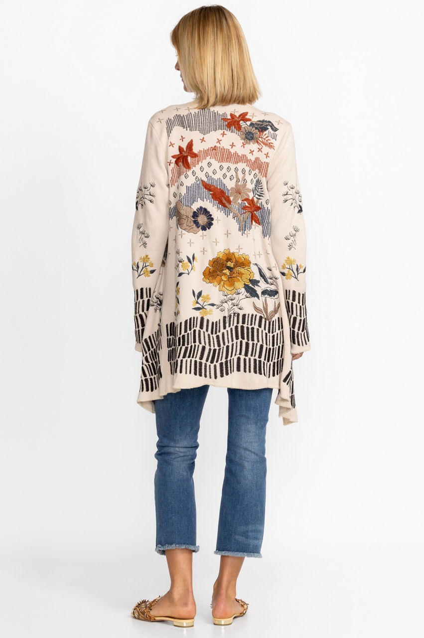Take your new season wardrobe in a chic direction with the Sarina Wrap Sweater. A practical layer, this wrap sweater is made from a comfortable material and features a wrap style front, front pockets, long sleeves, and an intricate placement embroidery comprising opened blooms in contrasting tones. Layer this sweater over a tee or dress up with a blouse and smart pants.