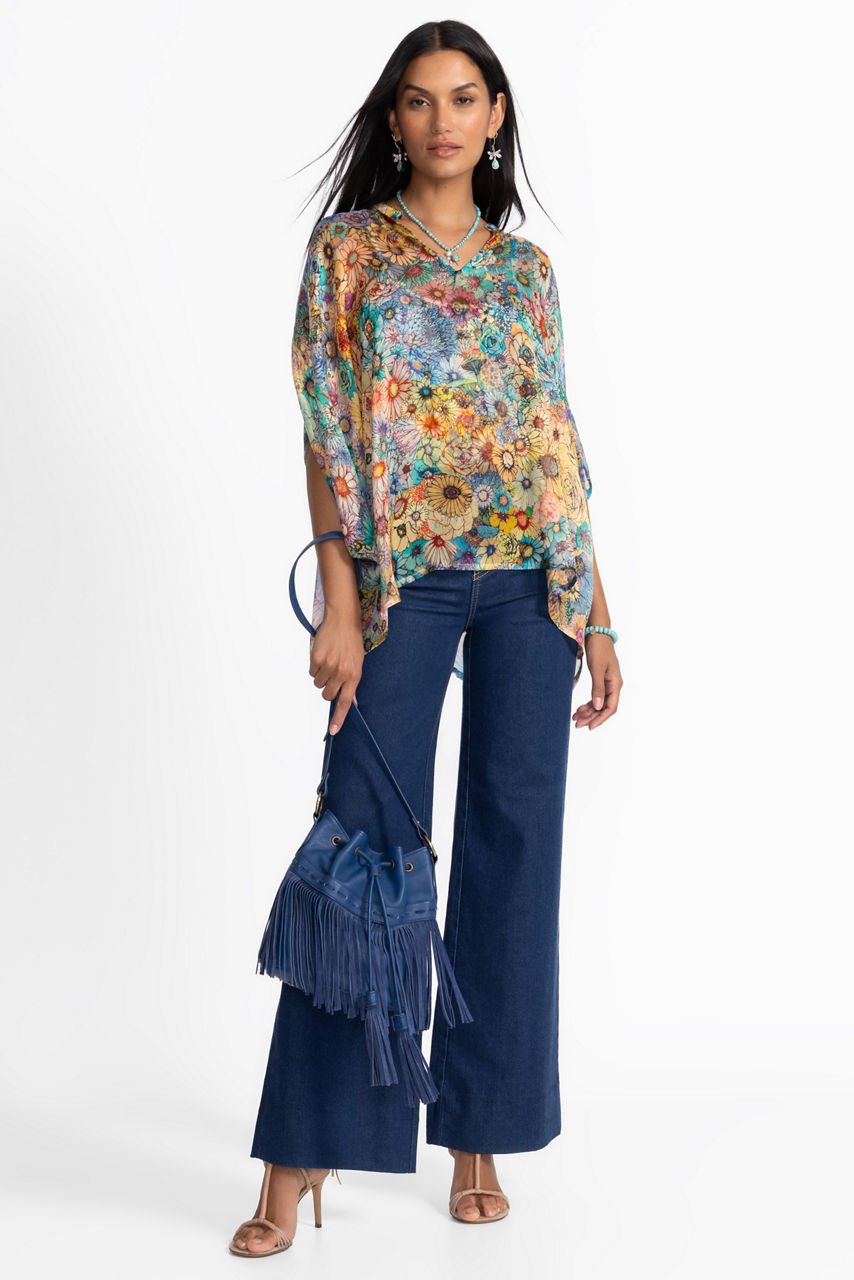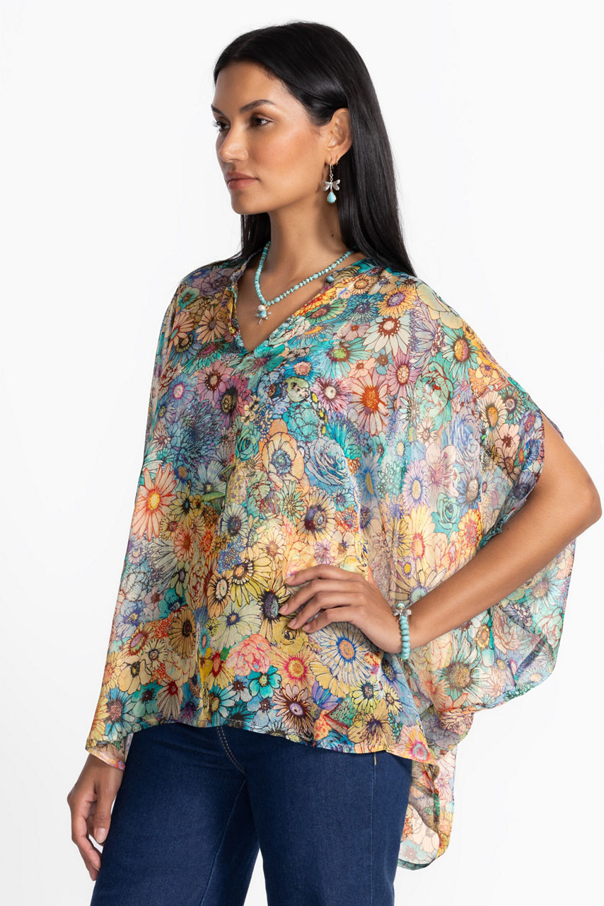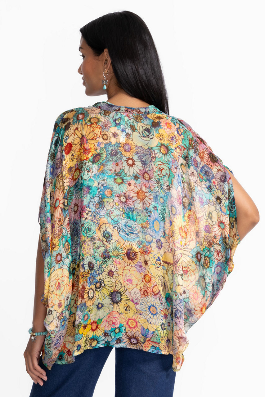 Crafted from 100% luxurious silk, the Sascha Poncho is embellished with a vibrant watercolor floral design. Featuring a keyhole neckline with a top button closure, this slip-lined blouse is finished with dramatic batwing sleeves for a flowing silhouette. Pair with fitted pants and bold jewelry for a festive floral look.