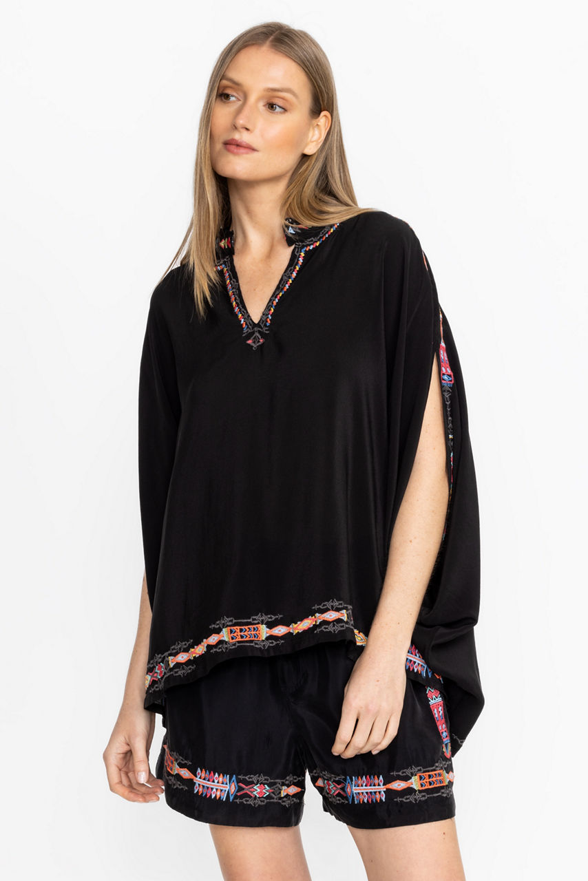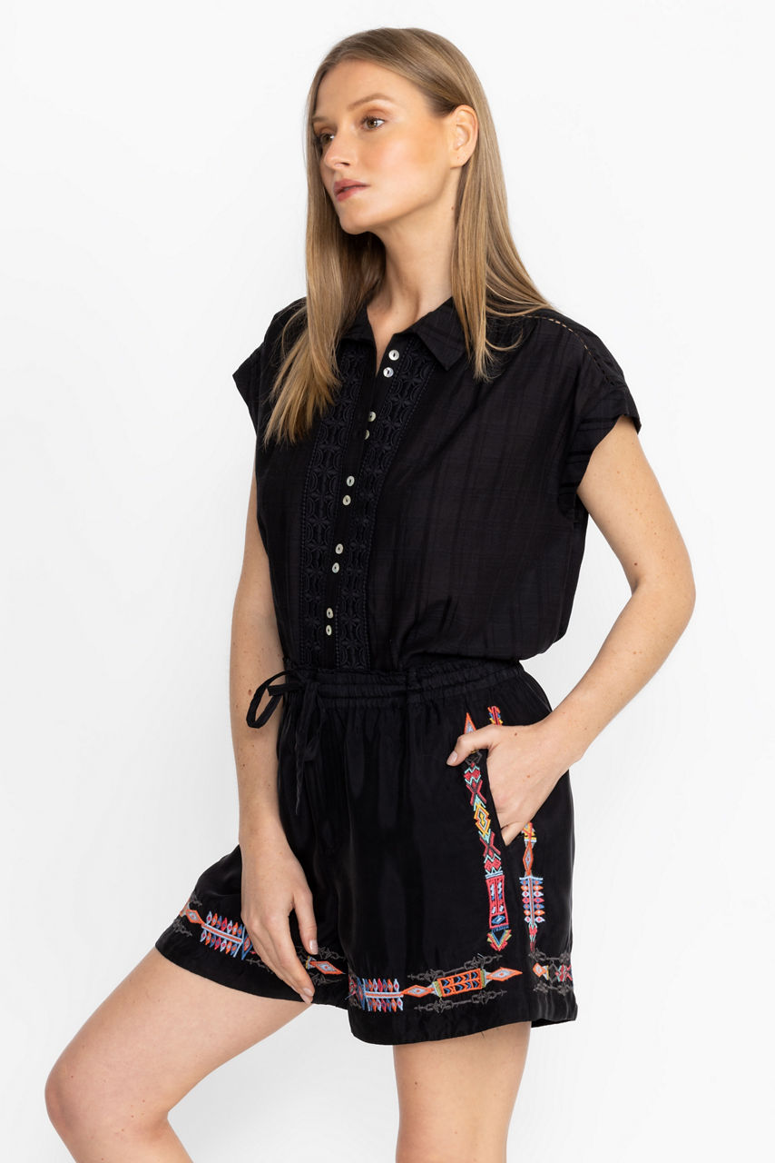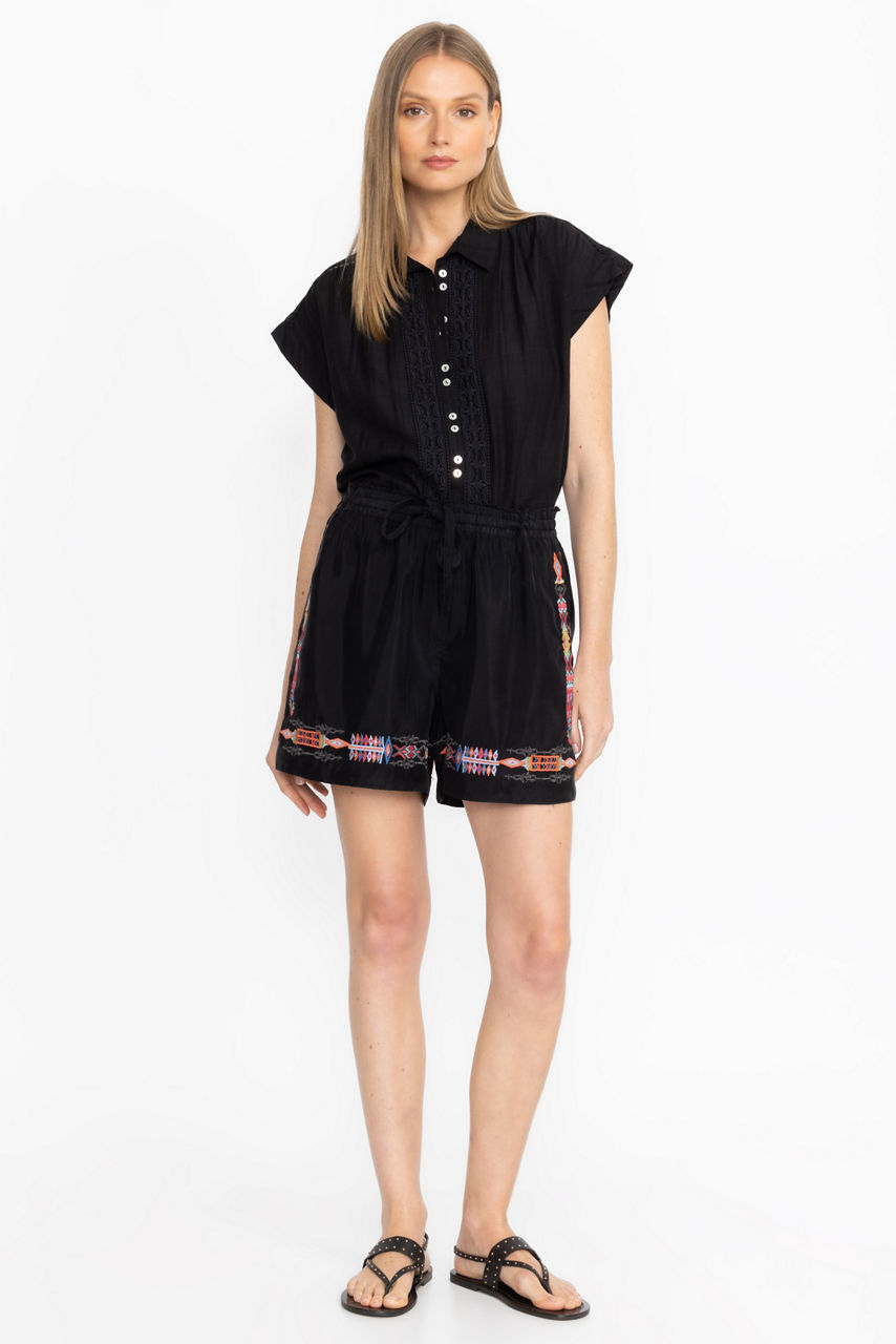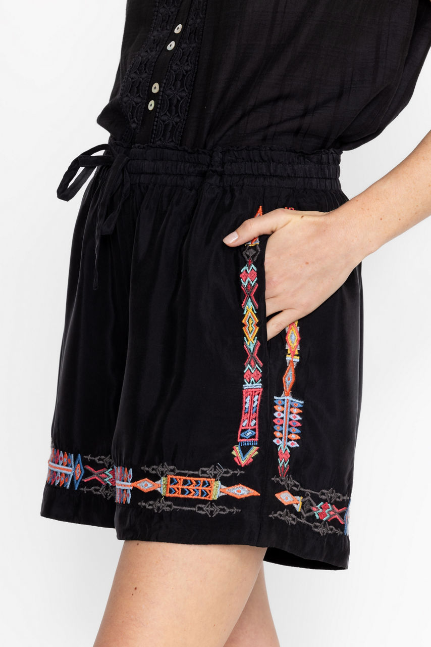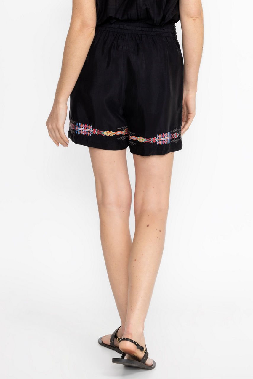 Crafted from a lightweight, flowy fabric the Sascha Shorts offer an elevated way to stay cool. Featuring an elastic waist and slip pockets at the sides, these unique shorts are finished with intricate embroidered detailing. Pair with the Sascha Poncho for a perfectly coordinated look that is perfect for an evening on the beach.