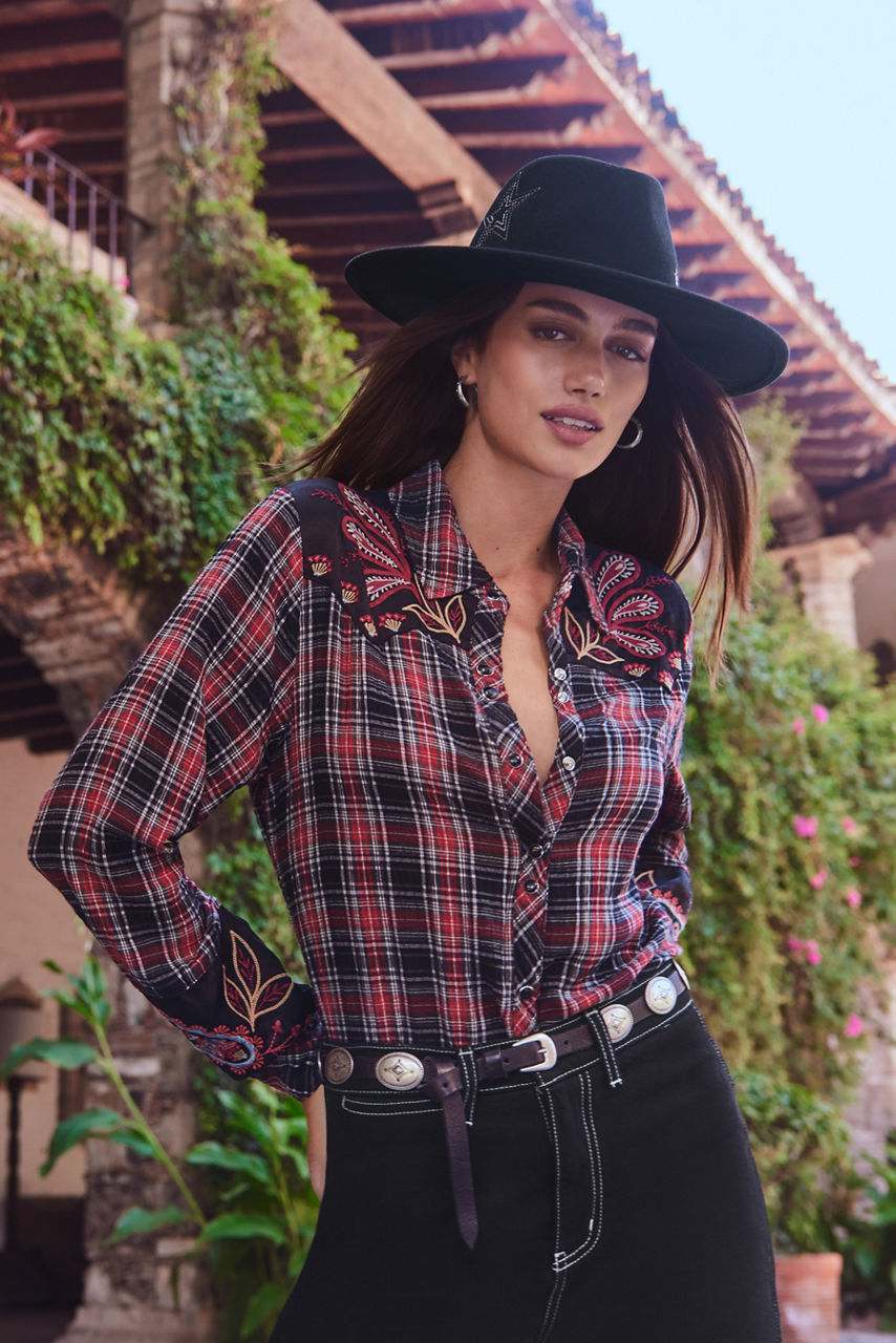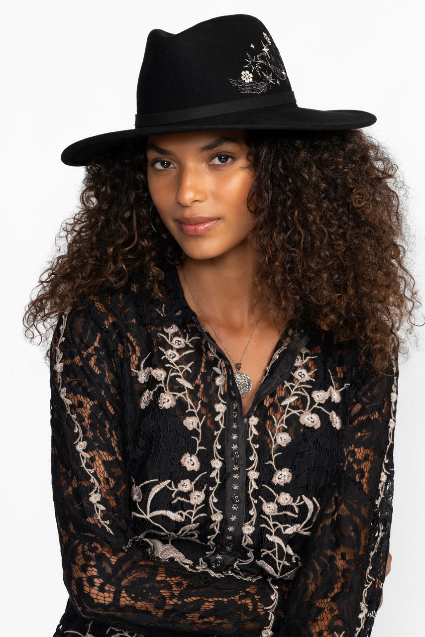 Crafted from rich 100% wool, the Saturn Astro Hat offers a modern take on a traditional Western staple. Designed in a deep inky black tone, this structured hat is finished with intricate placement embroidery that mimics celestial bodies in the night sky. Pair with a maxi skirt and a crisp button-down for an eclectic look.