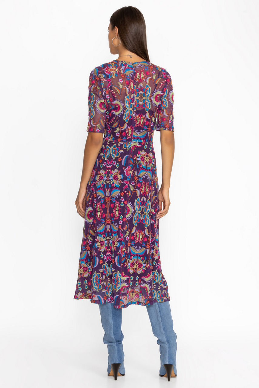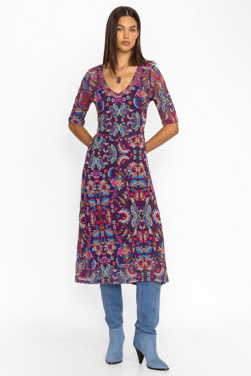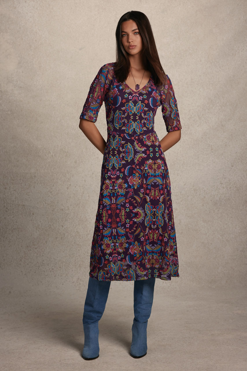 Crafted from a lightweight mesh fabric with a hint of stretch, the Sayler Mesh midi Dress is embellished with bold floral embroidery. Featuring a V-neckline and a back zippered closure, this slip-lined dress is finished with half-sleeves and a flowing A-line skirt. Pair with strappy heels and delicate jewelry for a night out with friends.