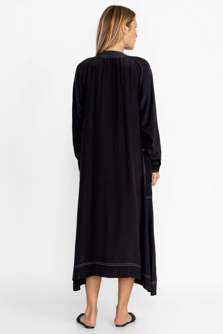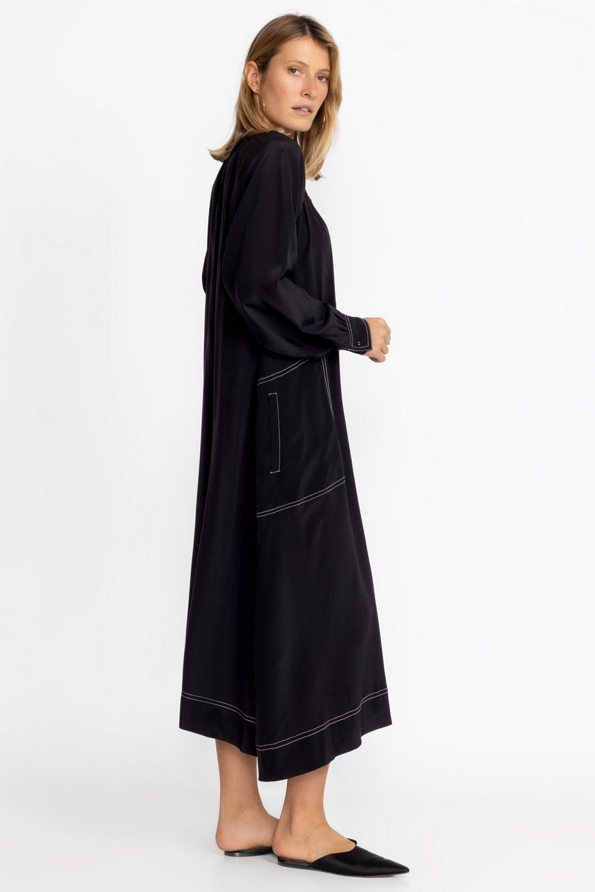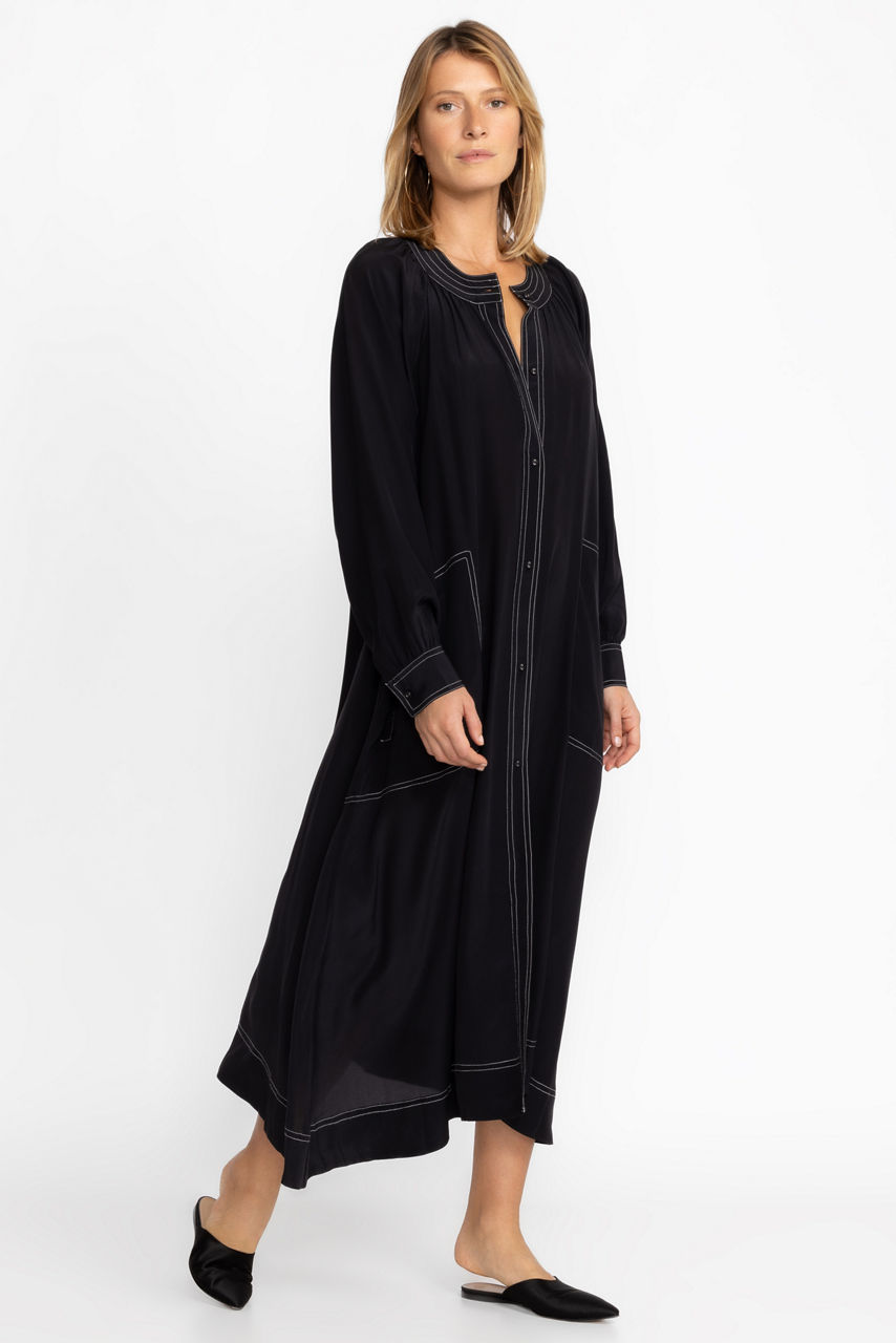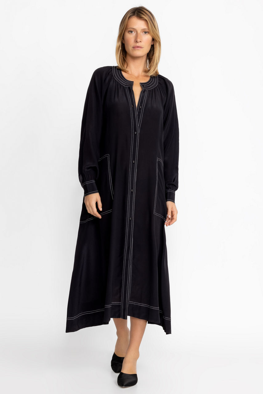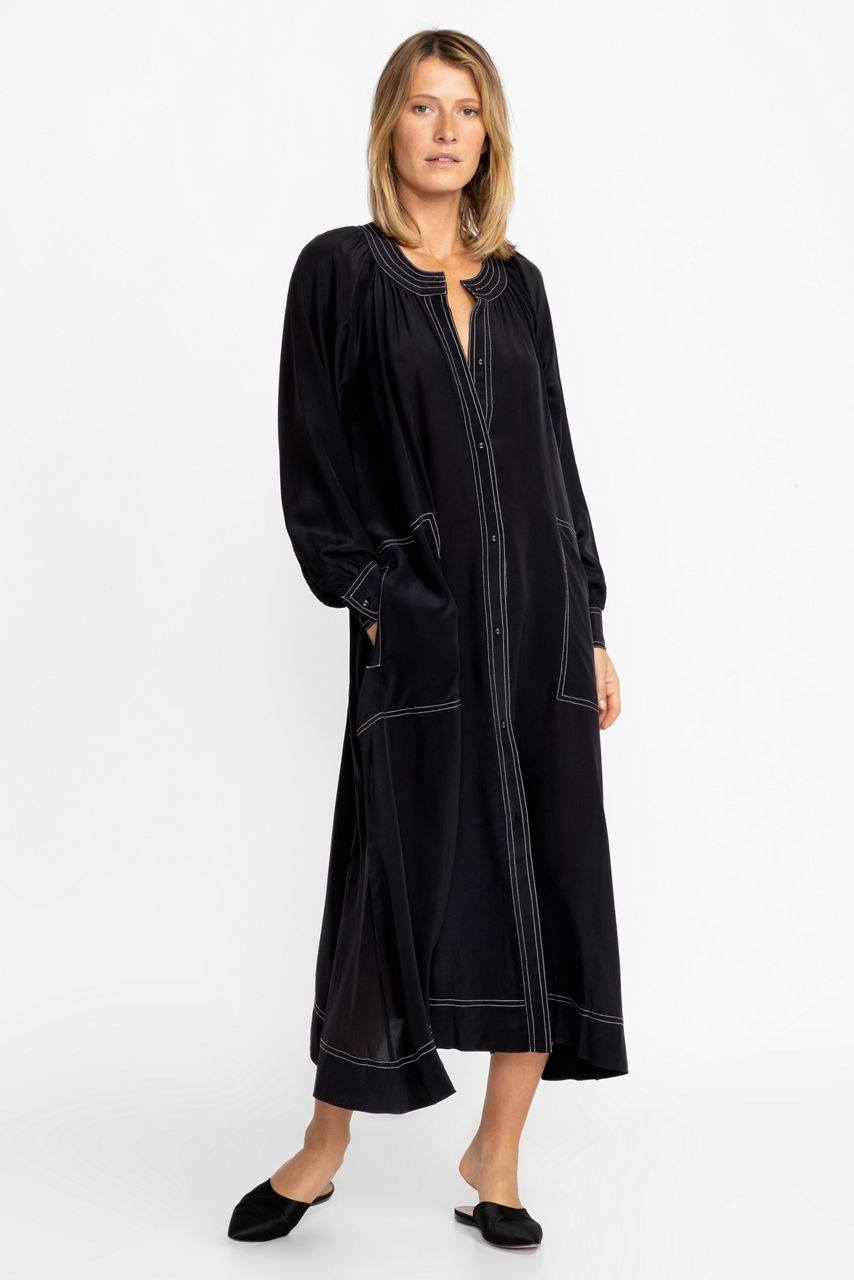 A refined silhouette, the Scoop Neck Button Down Midi is a versatile style for all seasons. Crafted from 100% silk and featuring welt pockets at the front and gently puffed sleeves with button cuffs, this elegant dress comes complete with a separate slip. Pair with color flats and glittering accessories for an evening look with a bit of polish.