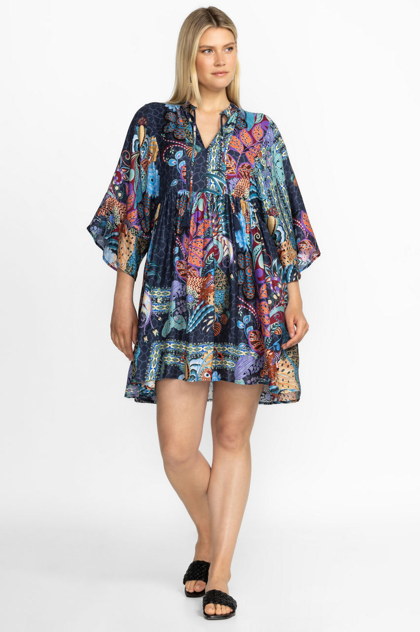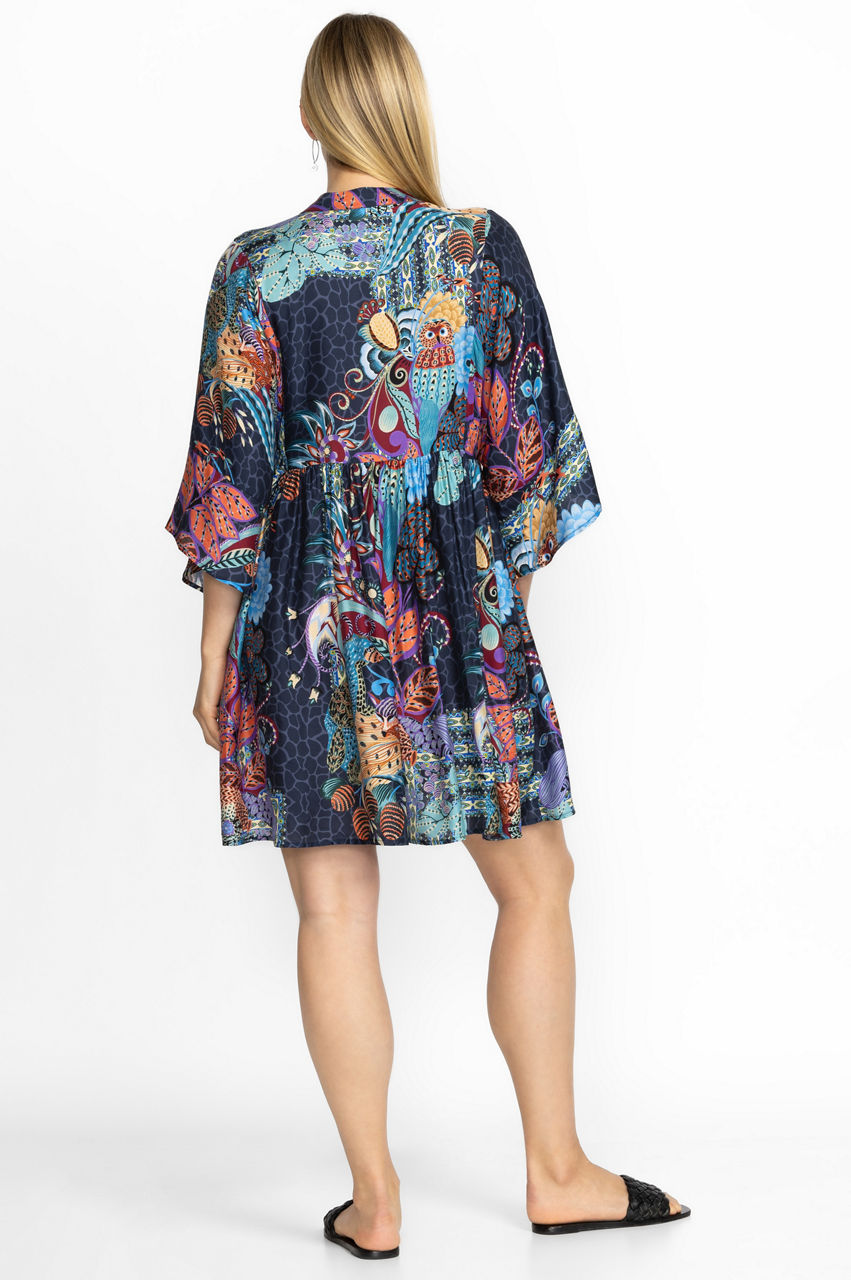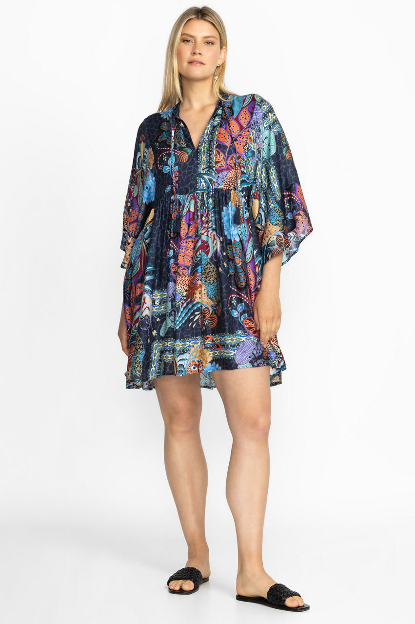 Crafted from a lightweight silk mix, the Sea Owl Short Kaftan Dress is an effortless layer for sublime, sun-drenched destinations. A statement take on a throw-on-and-go style, this kaftan dress features a collar, ties with tassels, and an unexpected print comprising owl and floral motifs. Team with ready-to-wander slides and woven accessories to channel an exotic vacation look.
