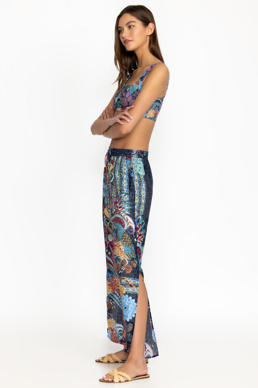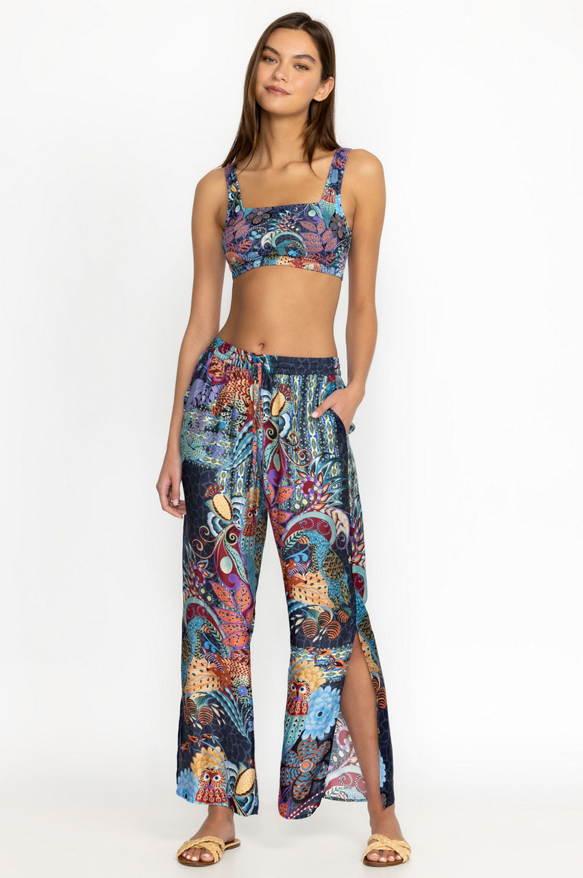 Unique animal motifs and a rich color combination punctuate the Sea Owl Split Pants. Made for meanders along exotic coastlines, these pants are spun from a lightweight silk blend that promises comfort and breathability in warmer climes. Finished with a drawcord elastic waistband and a vivid owl and floral pattern, these pants can be worn with a shirt for an effortless beach-to-bar look.