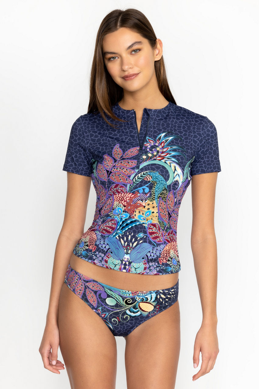 Crashing waves and the salty sea air form the perfect setting for the Sea Owl Surf Shirt. Equal parts practical and fashion-forward, this surf shirt is crafted from a quick-drying material, making it the perfect choice for a range of water-based activities. Finished with a round neck, short sleeves, and a mesmerizing owl and floral pattern, this surf shirt can be paired with the matching bottoms for an ocean-ready look.