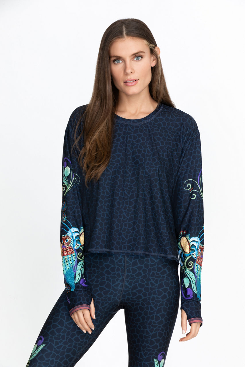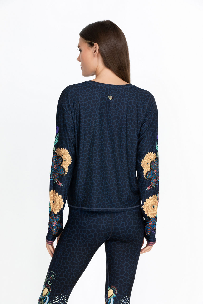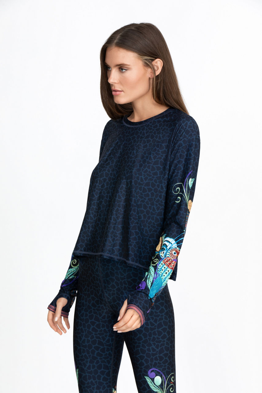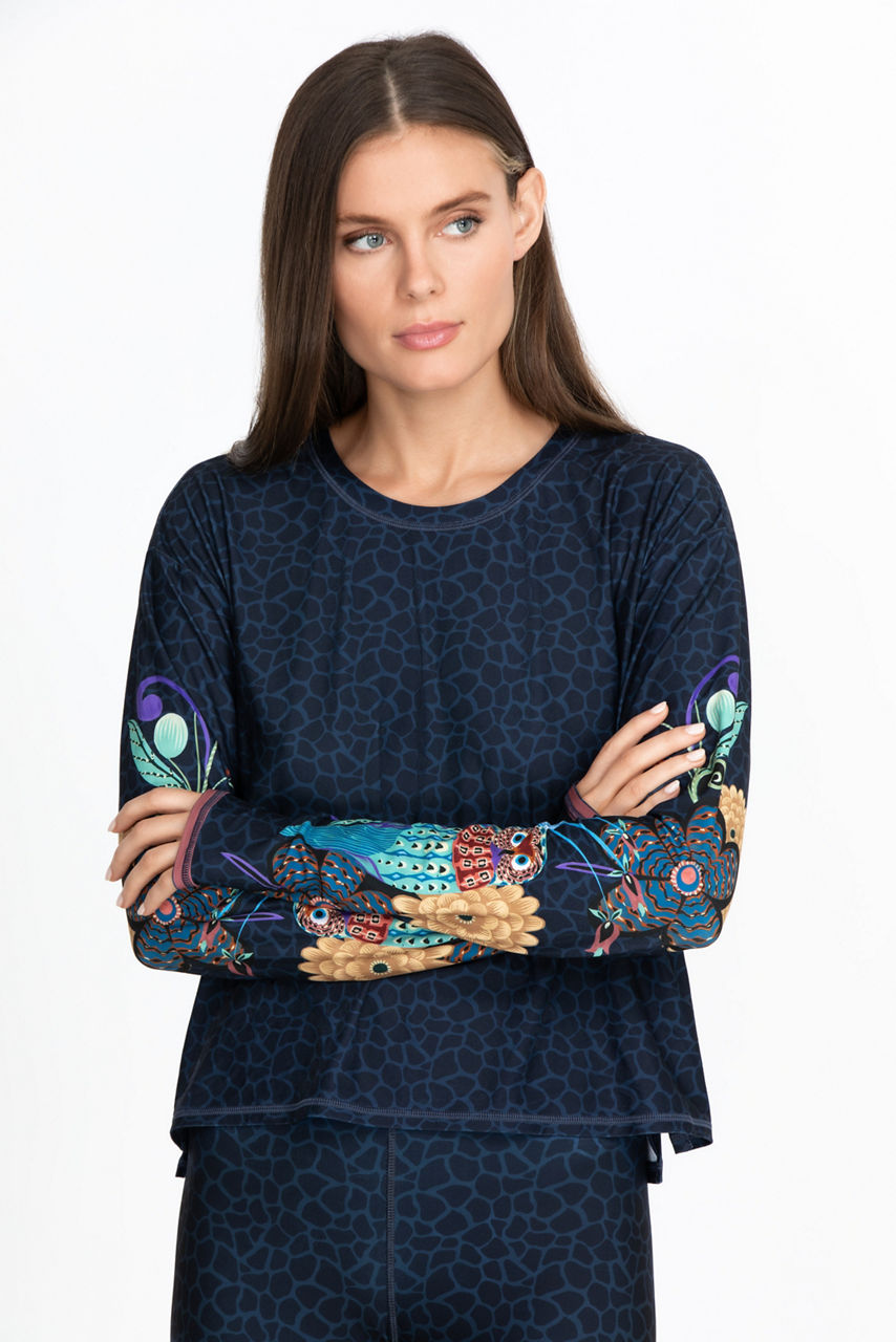This stylish and comfortable top will quickly become a favorite with its embellished sleeve and discreet all-over print. The floral details on the sleeves and step hem design create an interesting structure for this top, while the delicate blue tone makes it versatile. Style this top with a flowy skirt and a floral bag for a chic effect.