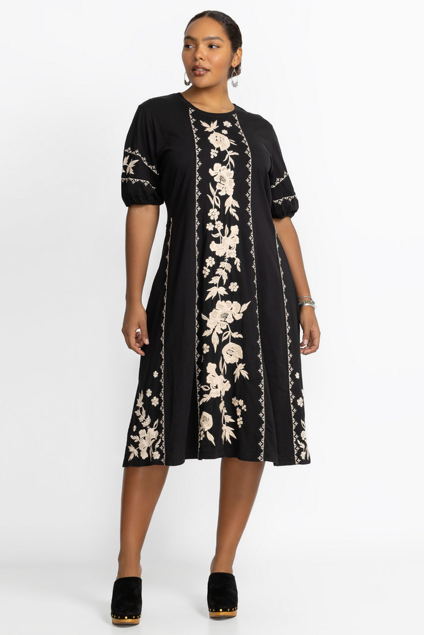 Boldly adorned with a fresh floral pattern, the Seamed Knit Dress is equal parts comfort and unmistakable style. Crafted from 100% cotton, this dress features a crew neckline and gently puffed sleeves and is embellished with a bold contrasting panel at the front lined with classic princess seams. Pair with heels and pearl jewelry for a distinctive feminine look.