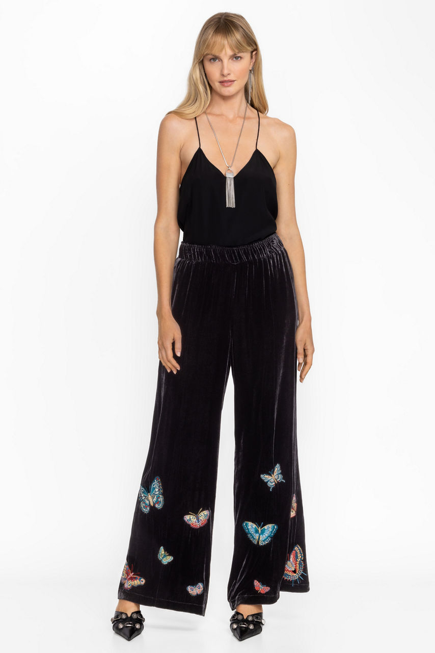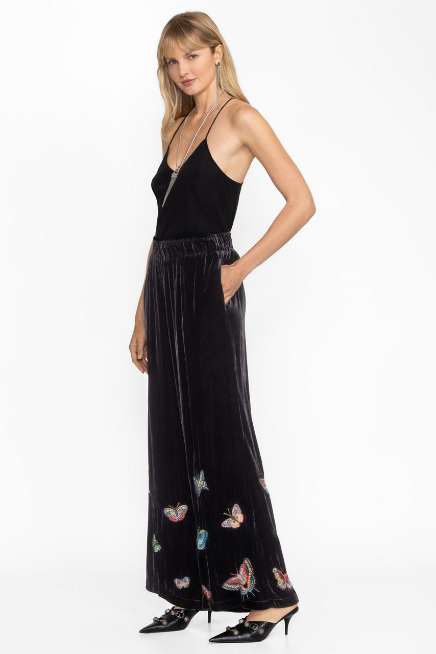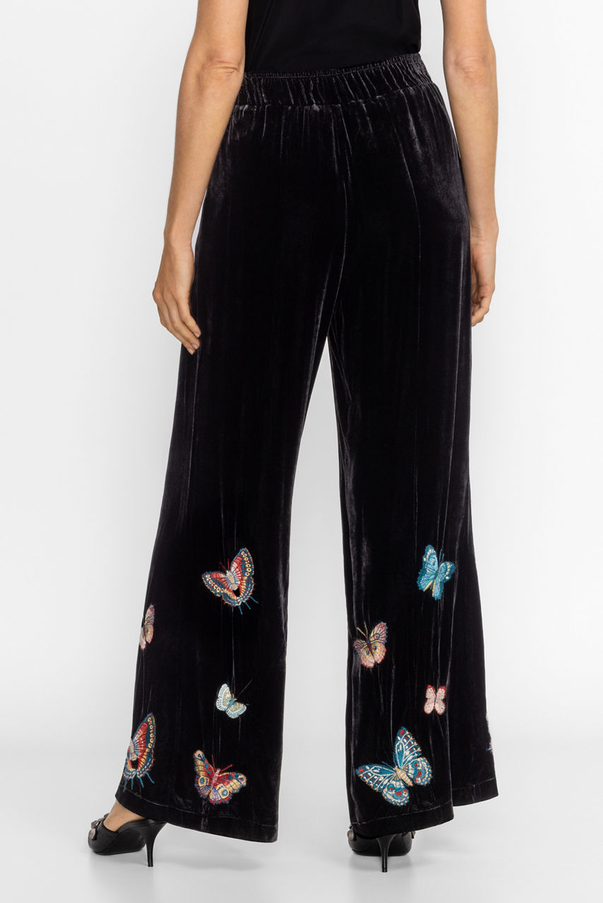 Crafted from 100% luxurious silk, the Seamed Wide Leg Pants are embellished with whimsical embroidered butterflies. Featuring an elastic waist and side pockets, these pants are finished with a raised seam at the crease and enhanced with a flowing, wide-leg silhouette.