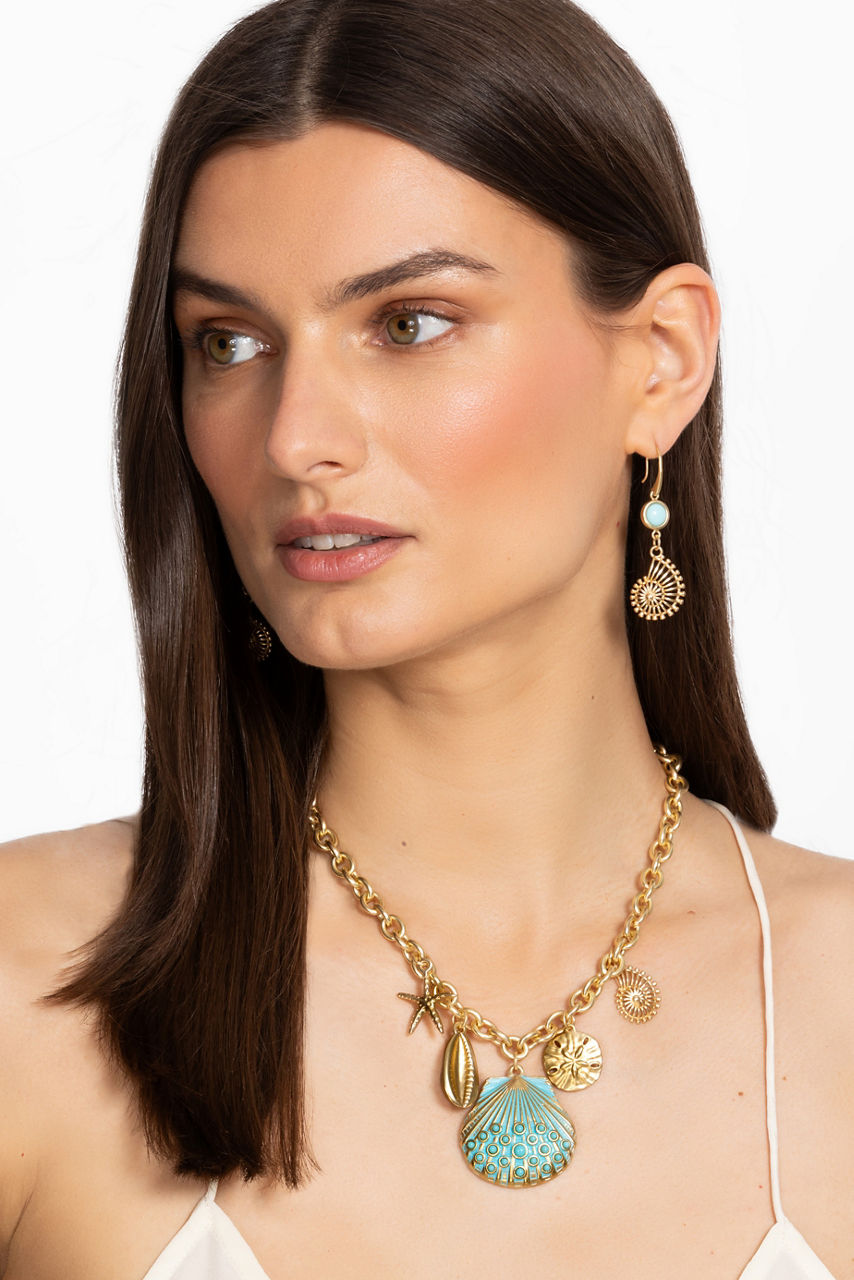 A beautiful reminder of the vastness of the sea, the Seascape Charm Necklace offers a collection of charms paying homage to the ocean. Designed with a clasp closure with an adjustable length this bold jewelry piece is embellished with unique charms crafted from glass stone and resin. Pair with the Seascape Charm Bracelet and a white linen dress for a perfectly coordinated look.