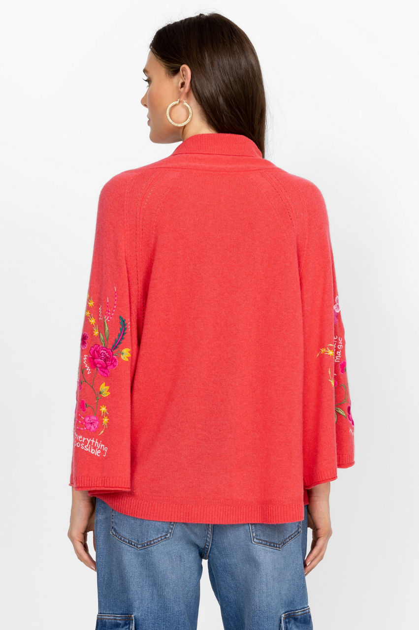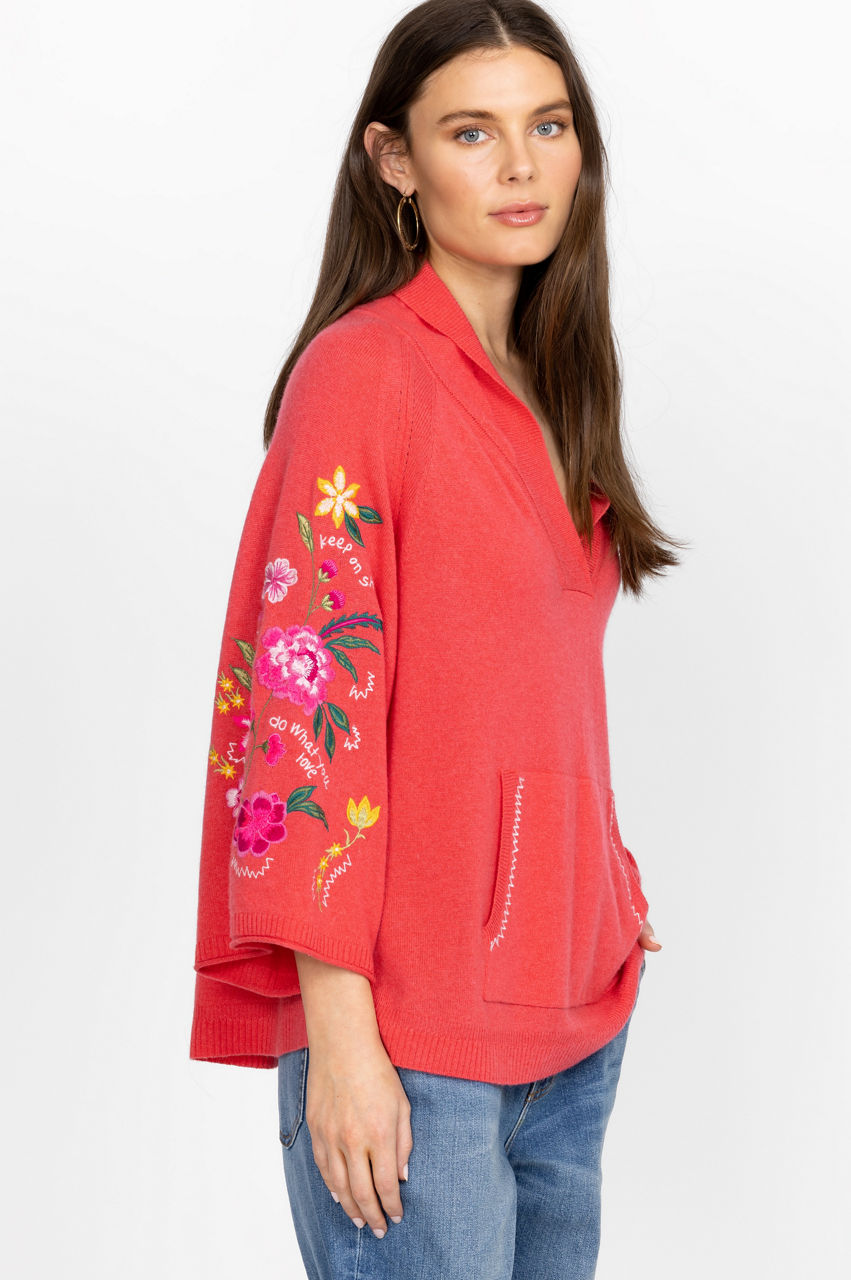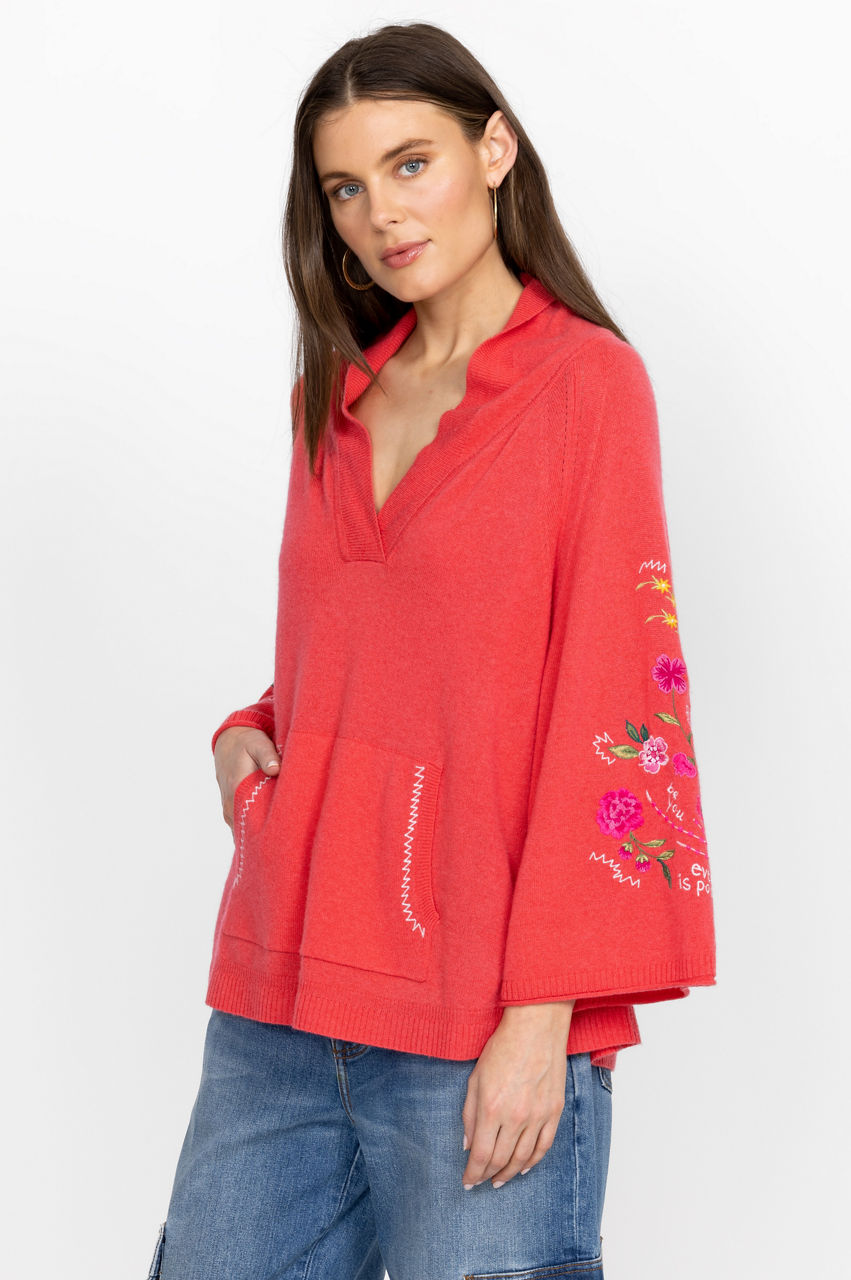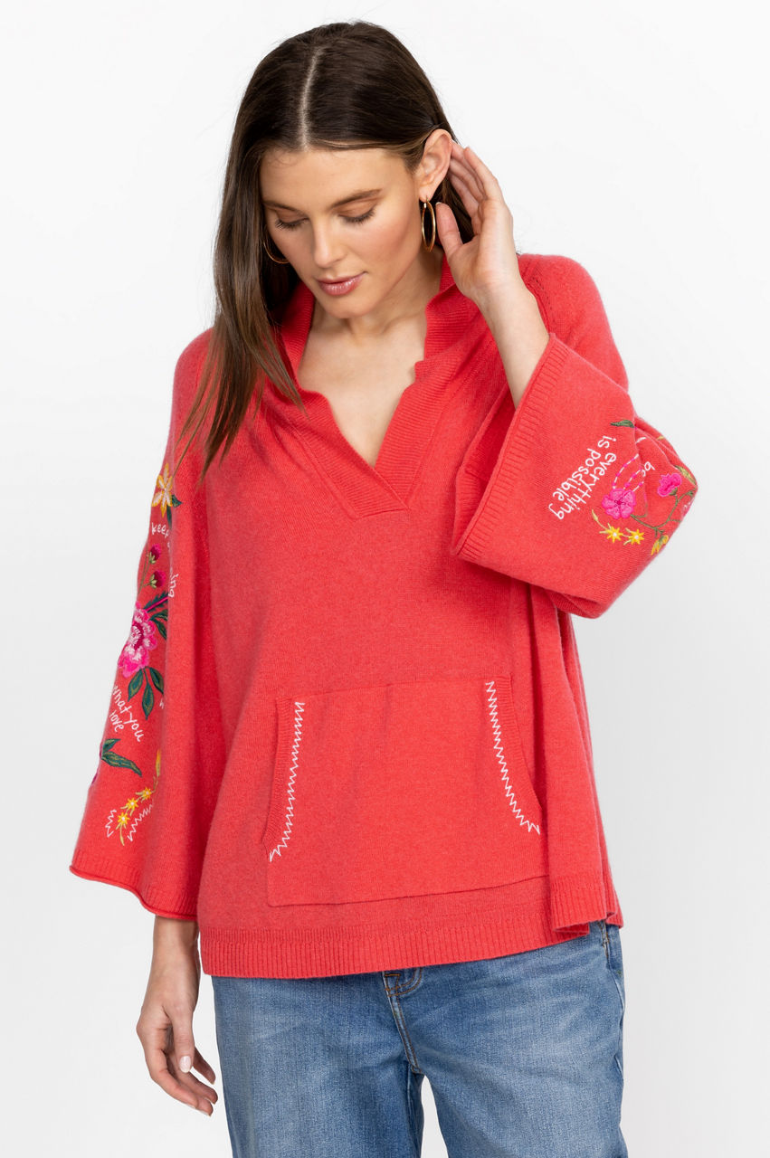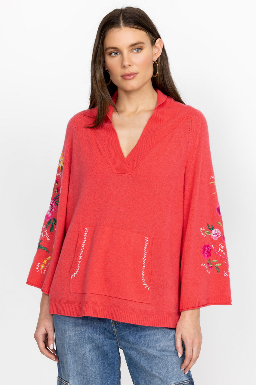 Crafted from a luxe wool cashmere mix, the Sedona Patch Pocket Sweater puts a joyous spin on a cold-weather favorite. Adopting a warm red colorway, this cozy knitted sweater is enhanced by a bright floral placement embroidery and features a V-neck, long sleeves, and a practical kangaroo pocket at the front. Pair with jeans or style with joggers at home.