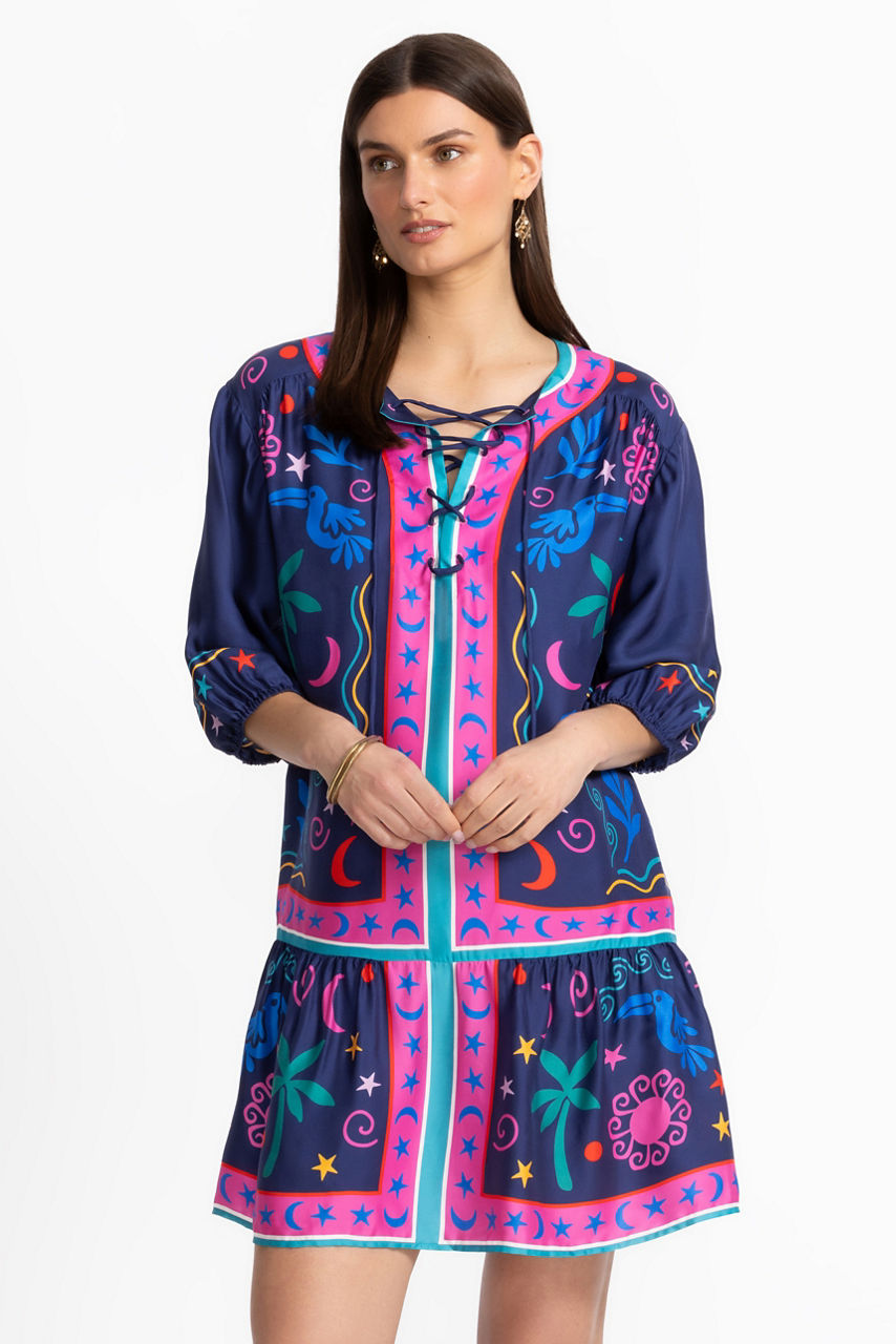 Crafted from a rich silk blend, the Selena Mini Dress is beautifully adorned with bold color and island iconography. Featuring a rounded neckline with a lace-up front placket, this dress offers elbow length sleeves and elastic cuff and is finished with a drop-waist skirt accented by a contrasting trim. Pair with bold flats and sparkling jewelry for a polished daytime look.