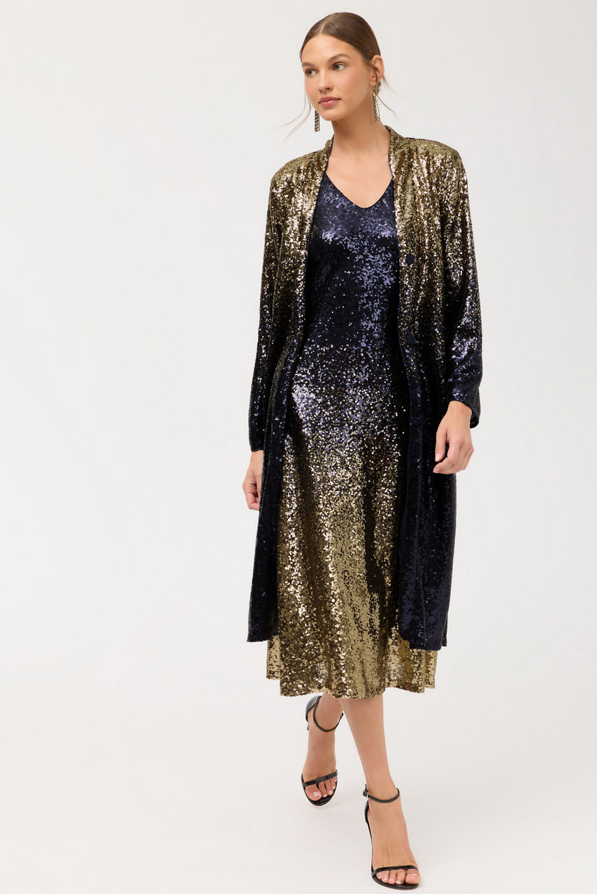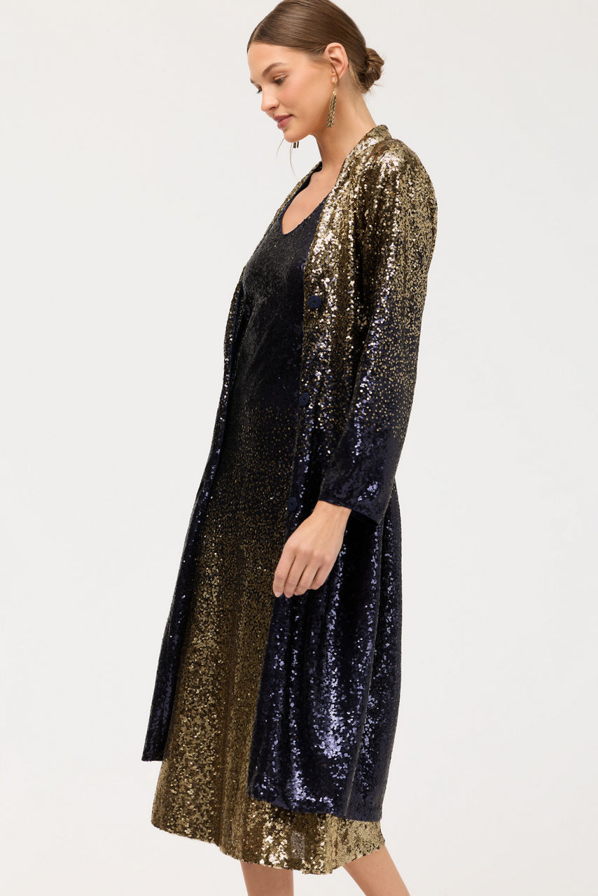 Beautifully embellished with ombre sequin detailing, the Selya Sequin Duster transitions beautifully from brilliant gold to deep navy. Designed with a button-front closure and long sleeves, this elegant duster is finished with pockets and side slits for a flowing silhouette. Layer over the Selya Sequin Midi Dress and pair with metallic heels for a sparkling evening look destined to be the center of attention.