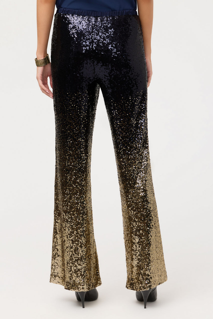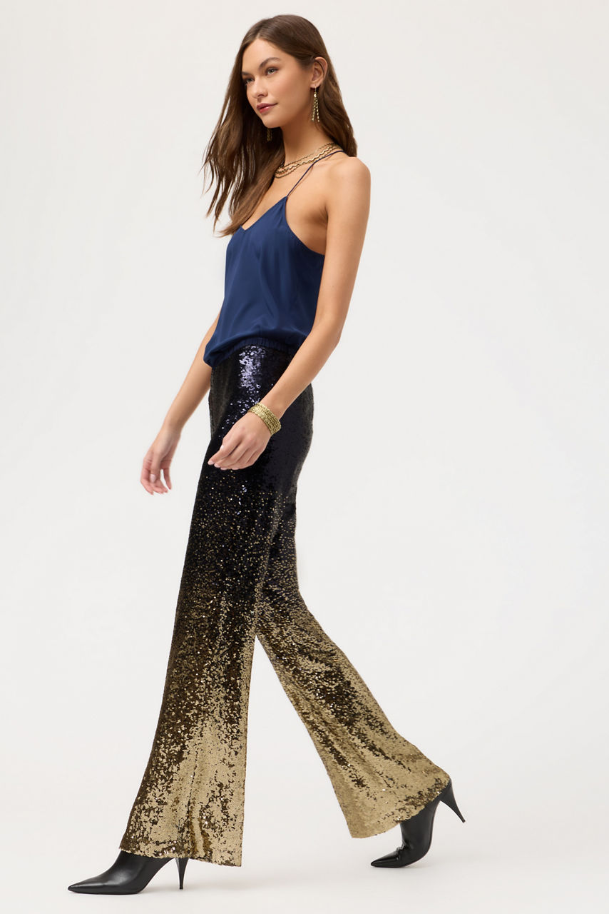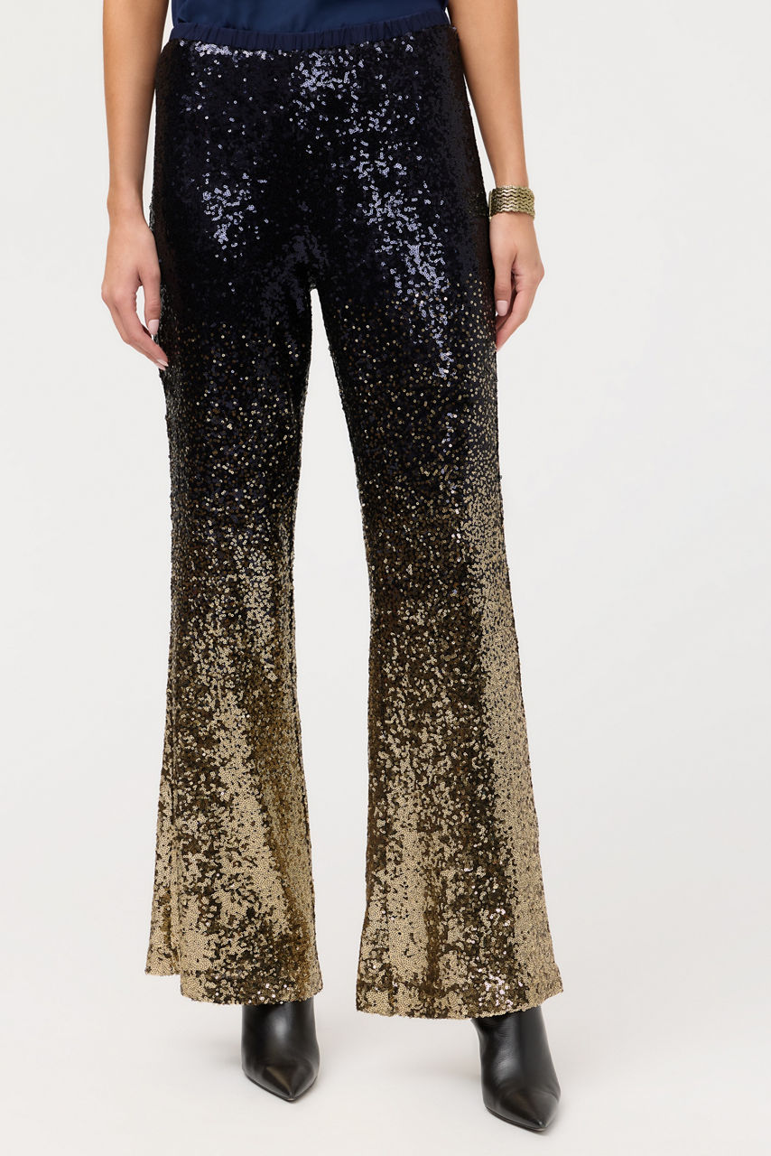 Beautifully embellished with glittering sequin accents, the Selya Sequin Pants are washed in an ombre color pattern blending deep navy and glittering gold. Designed with an elastic waist, these pants are cut with a flared leg. Pair with the Selya Sequin Tie Shirt and heels for an elegant evening out.