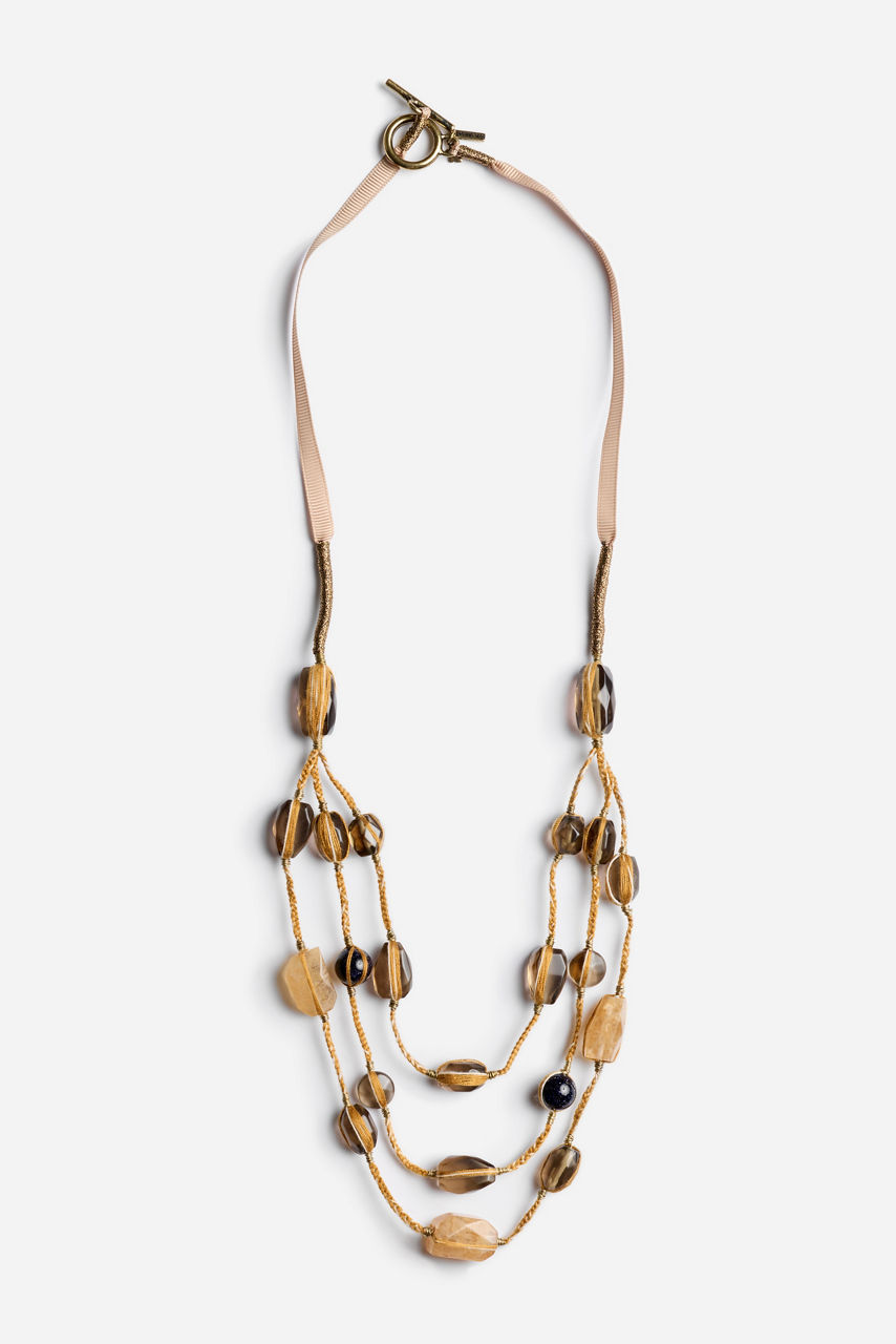 The Semiprecious Beaded Ribbon Necklace combines the luster of metal with the natural beauty of semi-precious stones. Designed with multiple strands, it showcases rich, earthy neutral tones that bring depth and texture to any look. Wear it with a flowing blouse or a sleek dress to elevate everyday elegance.