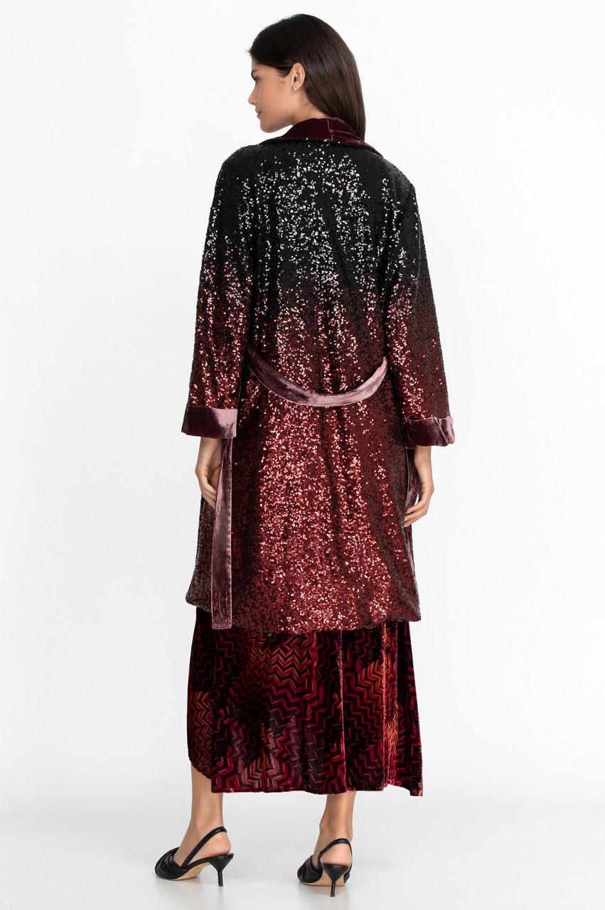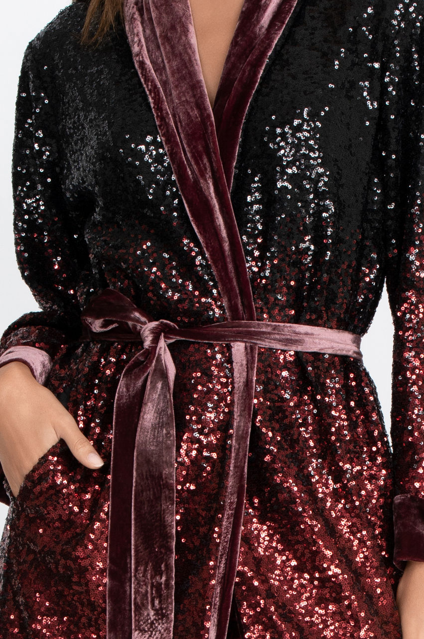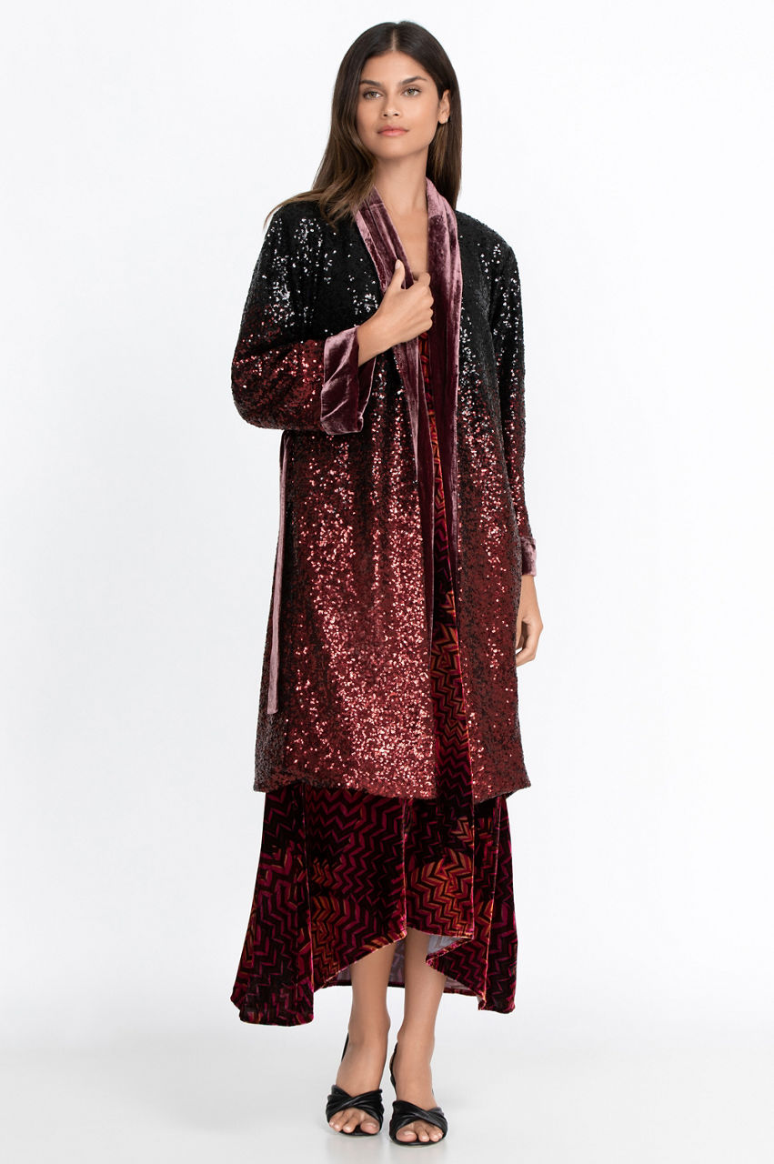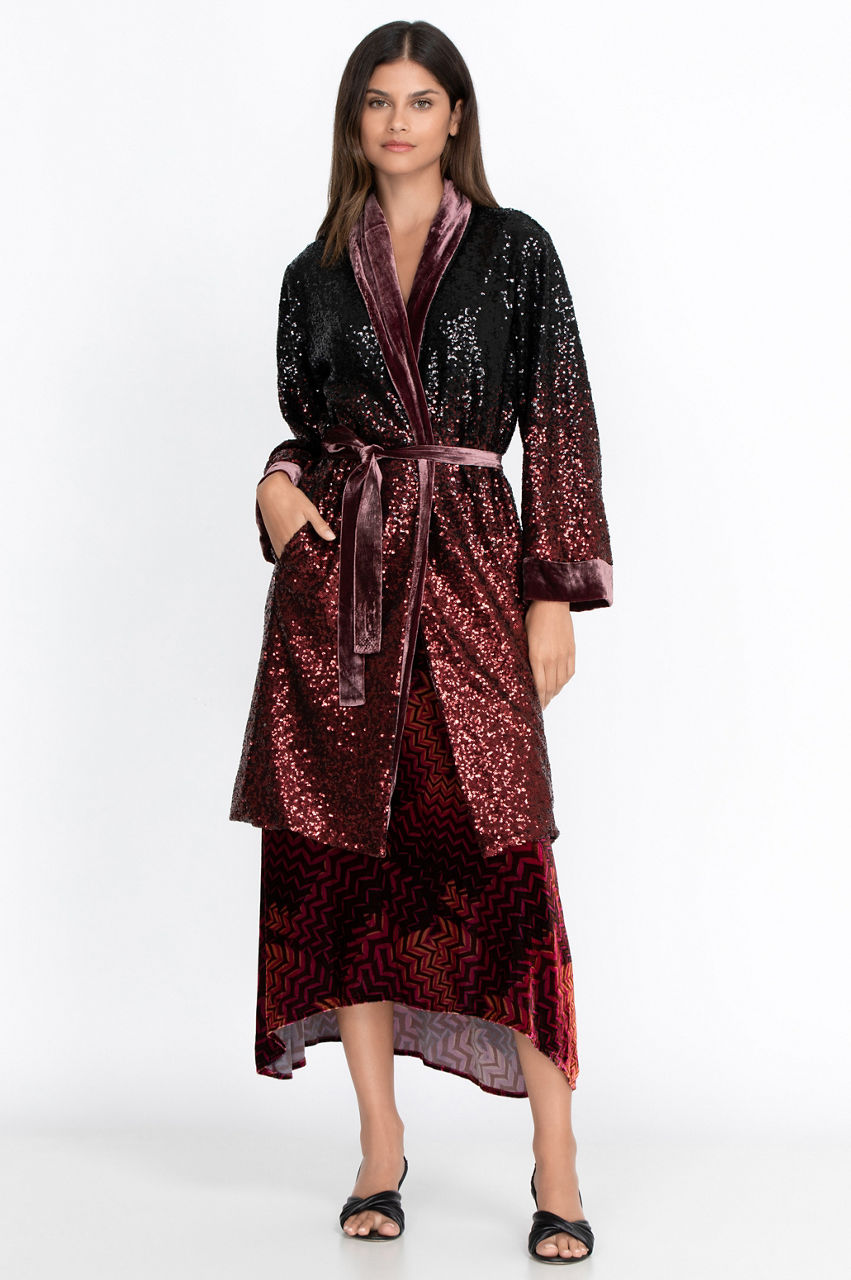 The sequins elevate this gorgeous kimono and turn it into an elegant statement piece. The sequins contrast with the belt, lapel, and cuffs for a structured effect. This kimono is a must-have piece for lounging in style or playing with layered and draped effects. Play with textures by styling it with a silk pajama set or a comfortable cotton tee.