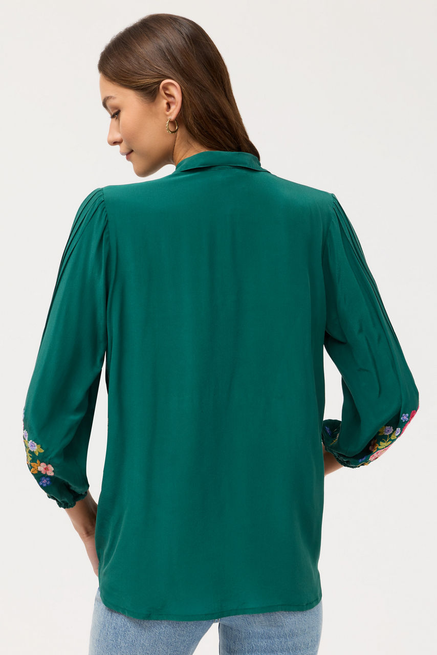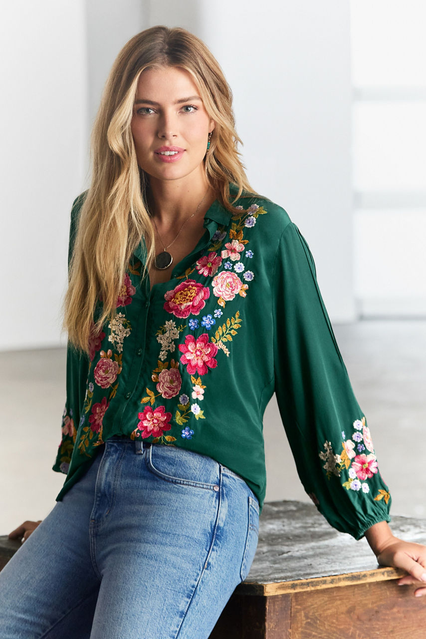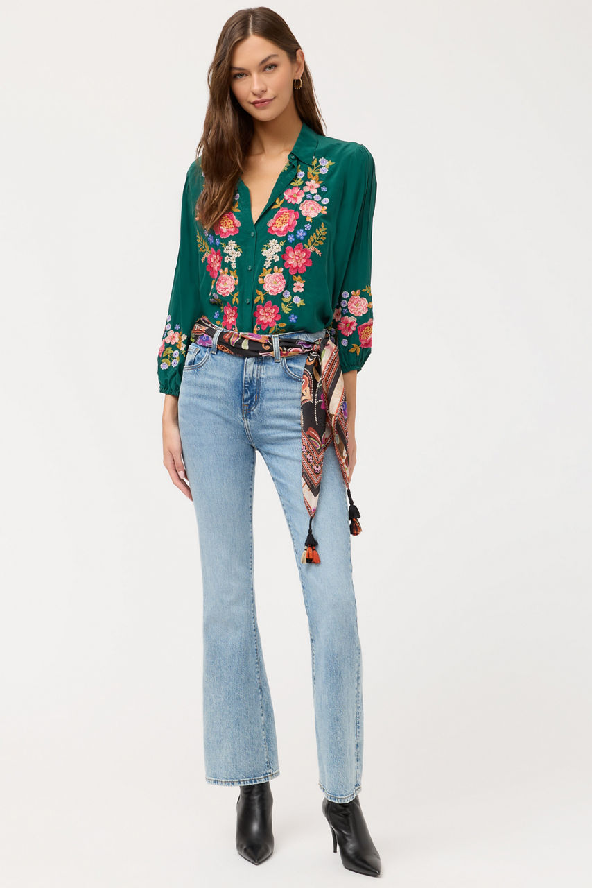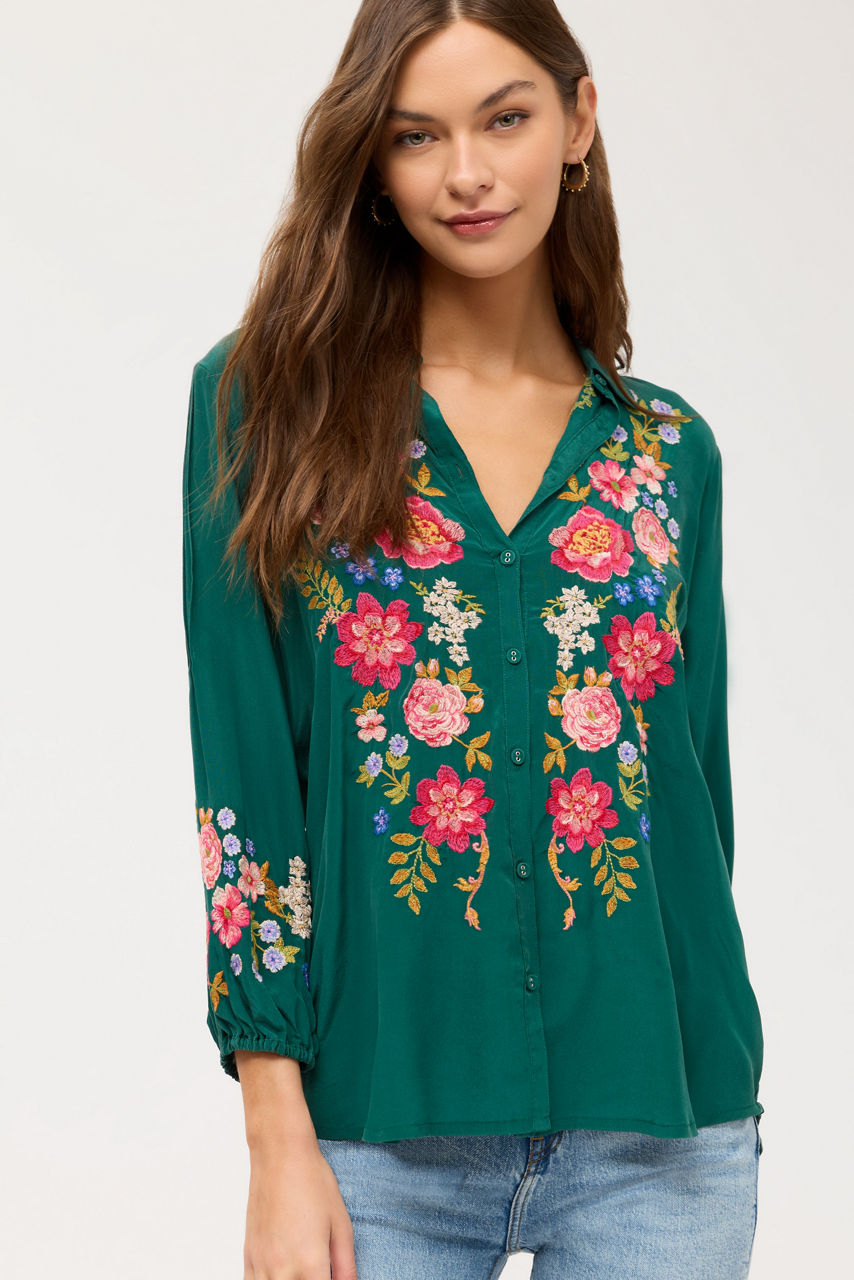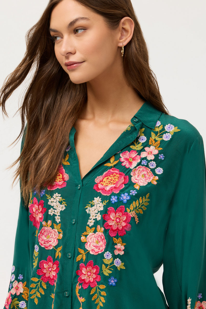 Crafted from 100% sumptuous silk, the Seren Shirt is embellished with intricately embroidered floral detailing in vibrant color. Designed with a collared button-front and flowing Bishop Sleeves, this elegant blouse is finished with pintuck detailing at the shoulders. Pair with dark-wash denim and casual loafers for a relaxing weekend with family and friends.