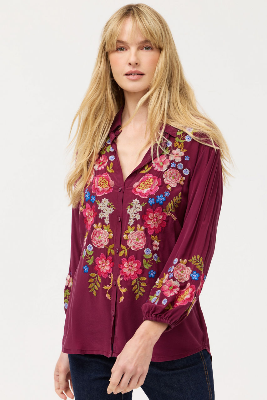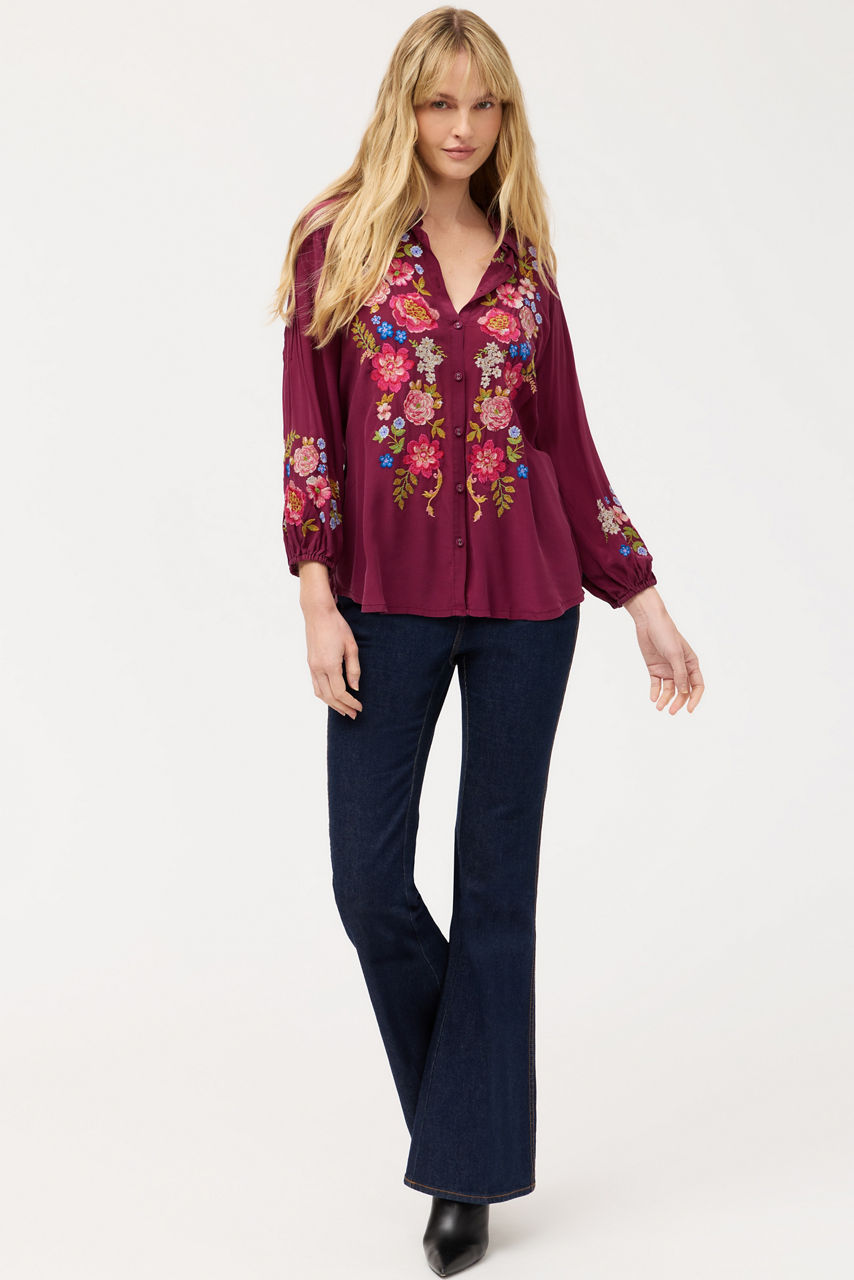 Crafted from 100% sumptuous silk, the Seren Shirt is embellished with intricately embroidered floral detailing in vibrant color. Designed with a collared button-front and flowing Bishop Sleeves, this elegant blouse is finished with pintuck detailing at the shoulders. Pair with dark-wash denim and casual loafers for a relaxing weekend with family and friends.