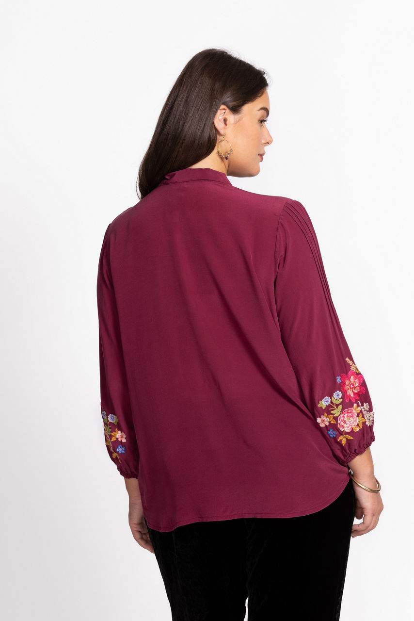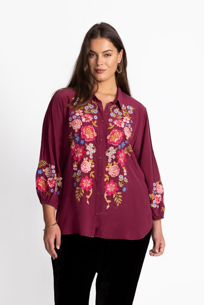 Crafted from 100% sumptuous silk, the Seren Shirt is embellished with intricately embroidered floral detailing in vibrant color. Designed with a collared button-front and flowing Bishop Sleeves, this elegant blouse is finished with pintuck detailing at the shoulders. Pair with dark-wash denim and casual loafers for a relaxing weekend with family and friends.