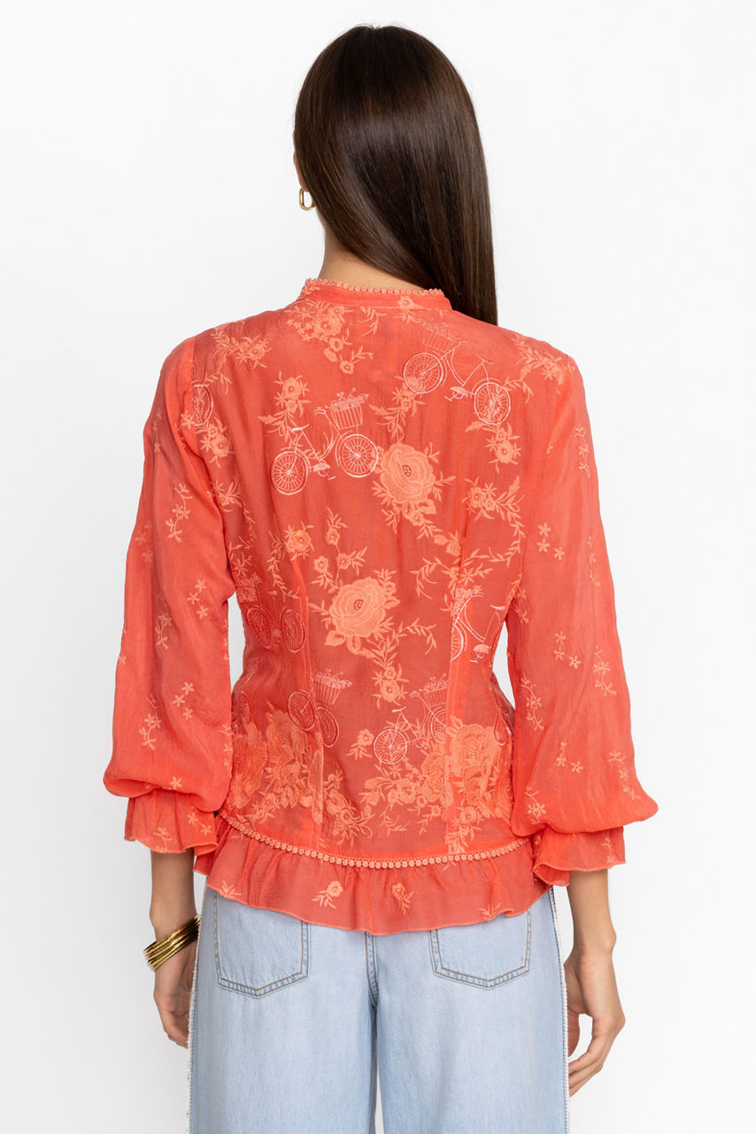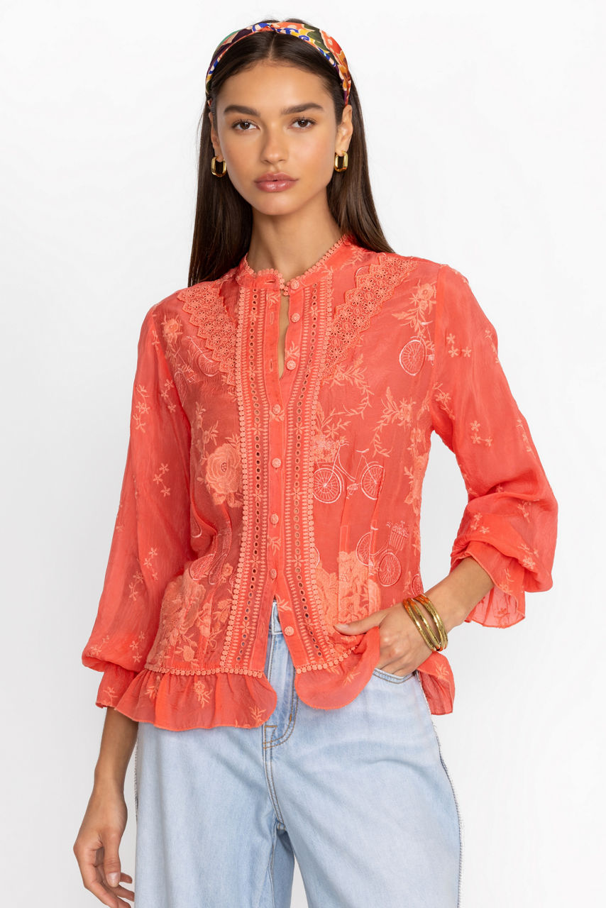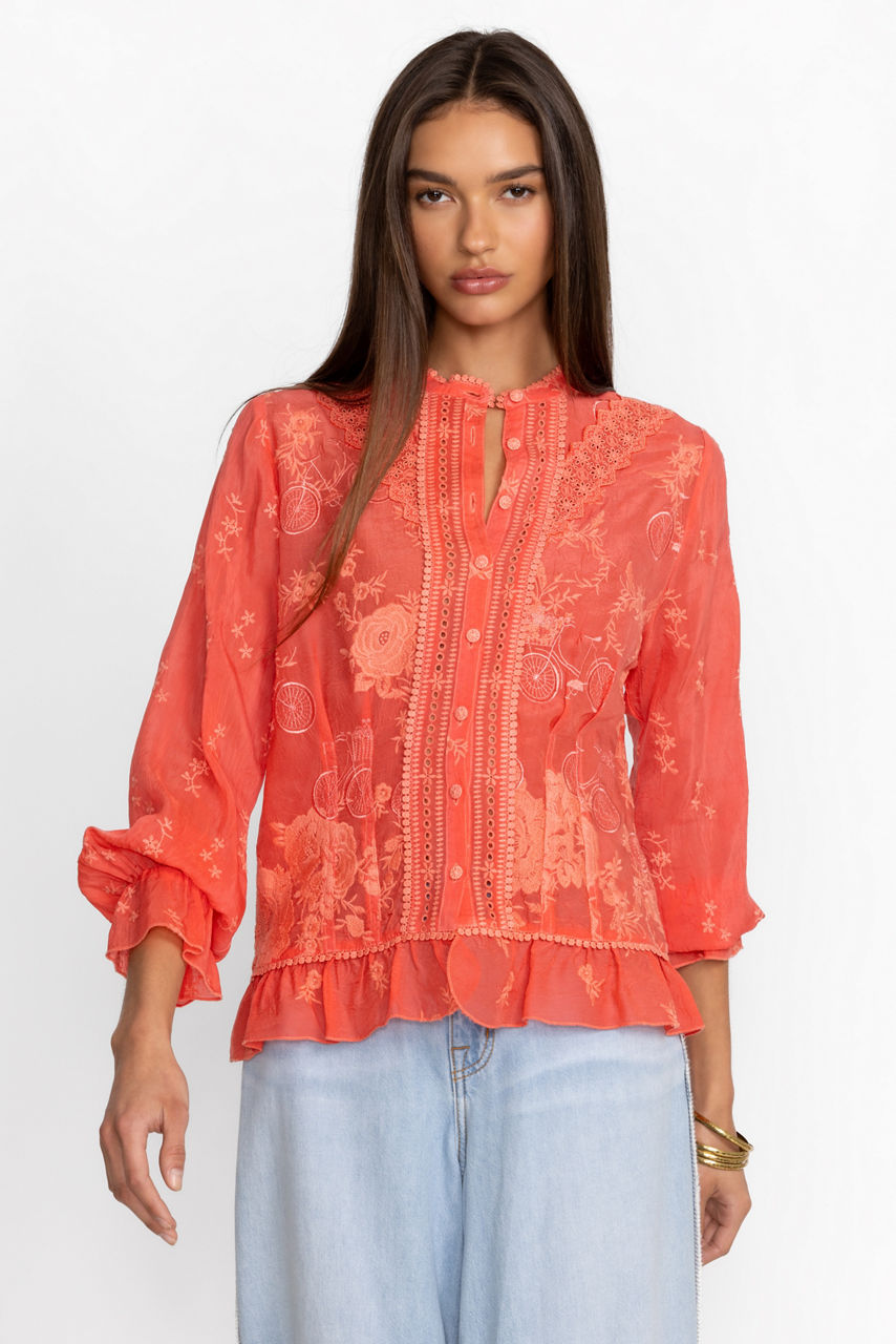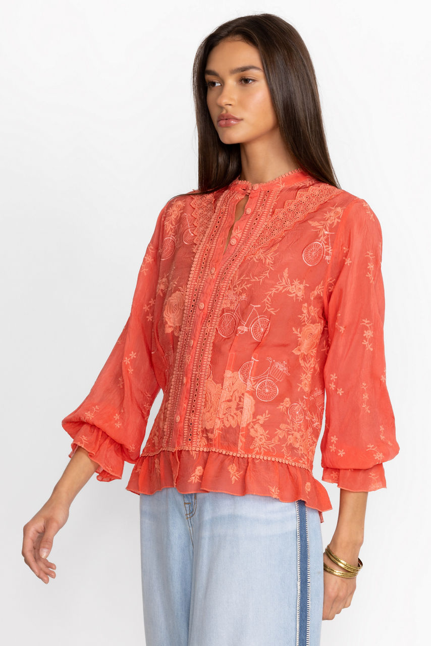Crafted from a flowing lightweight material, the Serene Ryder Blouse offers a modern take on a vintage style. Featuring a high rounded collar and button front, this blouse boasts delicate embroidery and feminine ruffles at the cuff and hem. Pair with sleek pants and kitten heels to allow this blouse to be the center of attention.