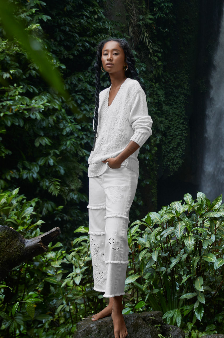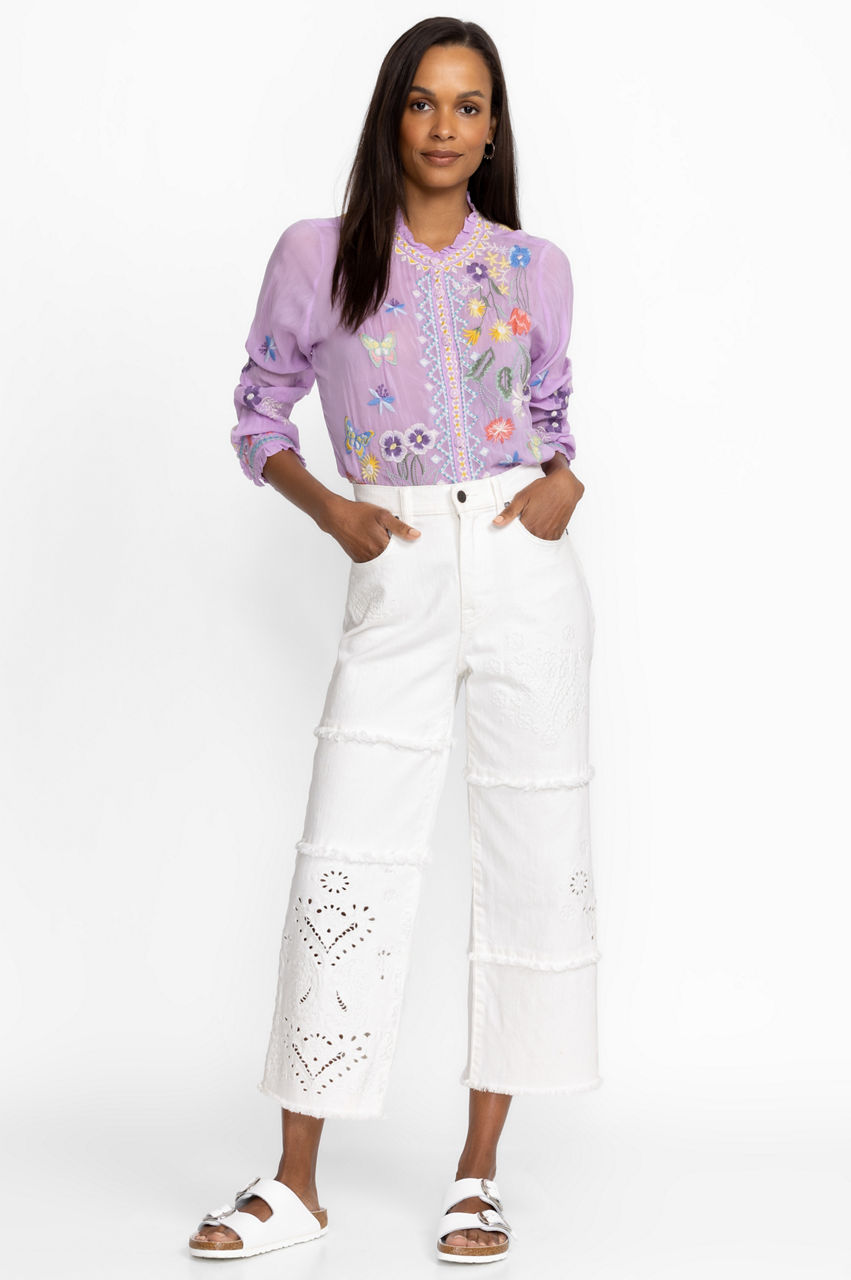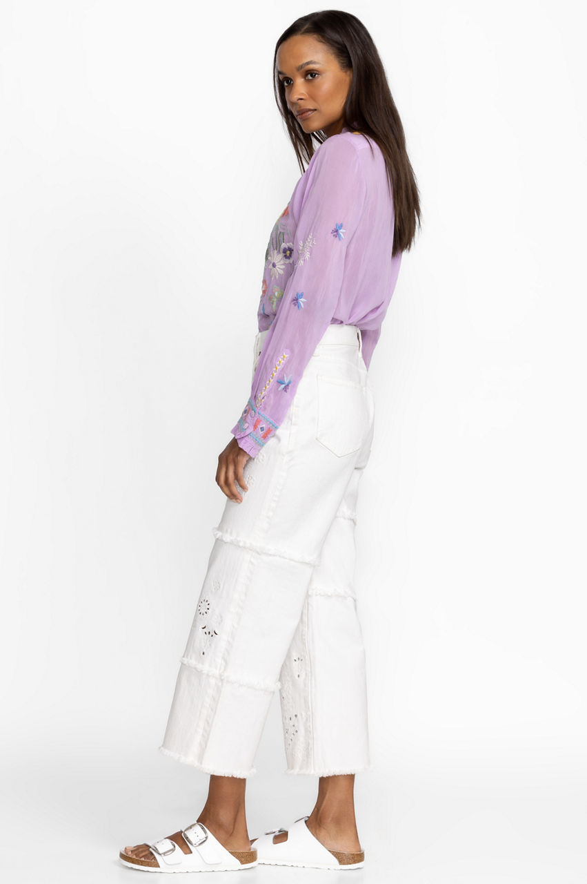 These Sevilla Cropped Wide Leg Denim Jeans encapsulate the spirit of warmer days thanks to their joyful patchwork design. These jeans are made from durable cotton with added stretch and feature a front closure, belt loops, a cropped wide leg, and a placement embroidery comprising eye-catching patterns. Style these jeans with a plain tee and a leather tote for a casual wear-anywhere ensemble.