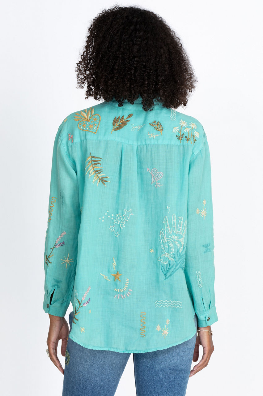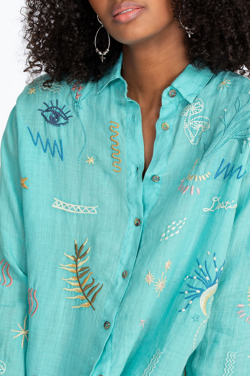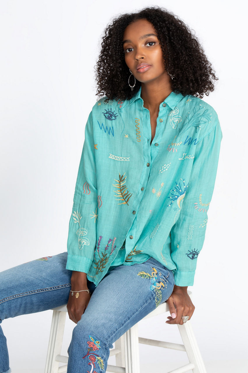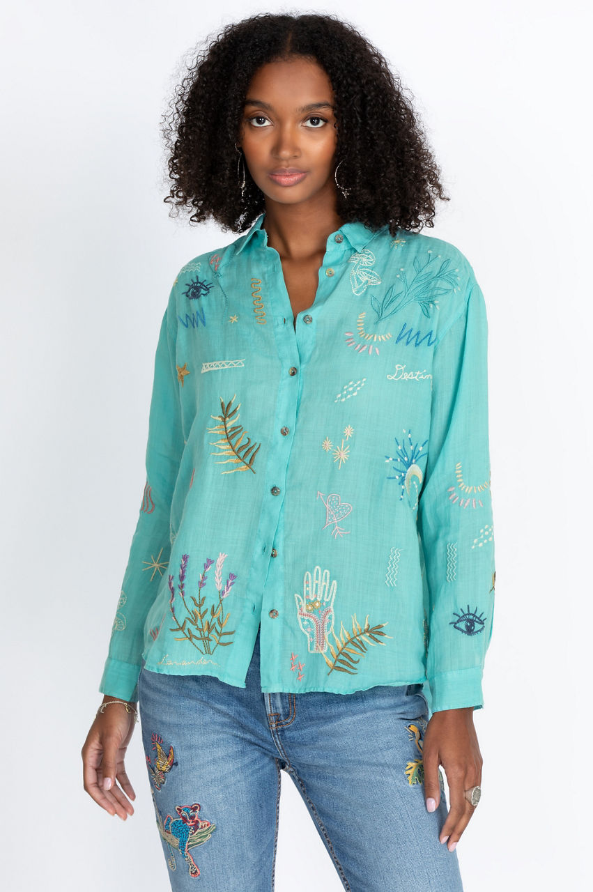 Our gorgeous, button-down Sezane Oversized Shirt is the perfect addition to any wardrobe. Constructed with exquisite artisan embroidery and having an effortless fit, this button-down shirt has a boho-chic look. This shirt can be paired with artisan boots, tapered trousers, or worn with a dress for the on-trend look. Complete the boho-chic look by adding an artisan leather tote, favorite hat or scarf, and layered jewelry.