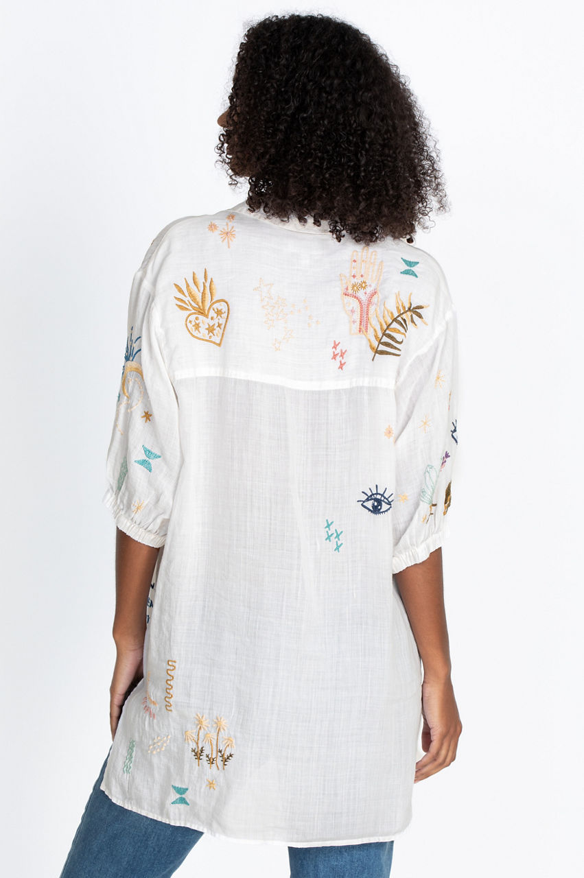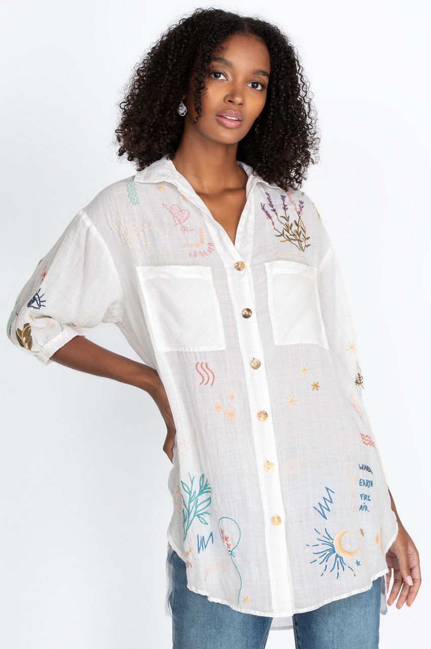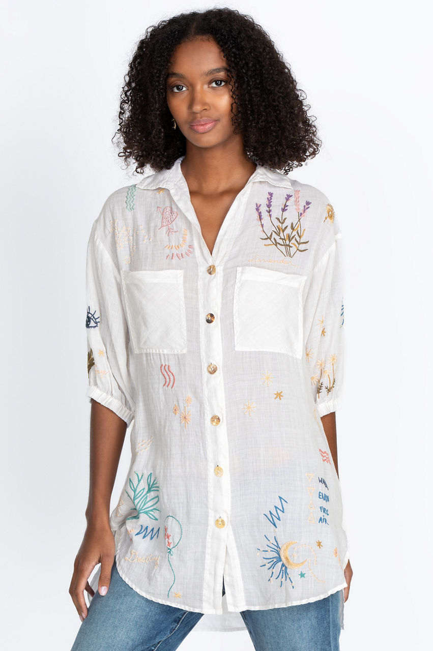 The effortless fit and chic design of our Sezanne Weekend Shirt Tunic makes it a must-have addition to any wardrobe. This gorgeous tunic has exquisite fabrication with signature prints and a timeless chic style with an ultra-comfortable design. The effortless tunic fabrication has a button-down front with two pockets. Wear with embroidered leggings, washed jeans, or your favorite skirt for an on-trend boho-chic look.