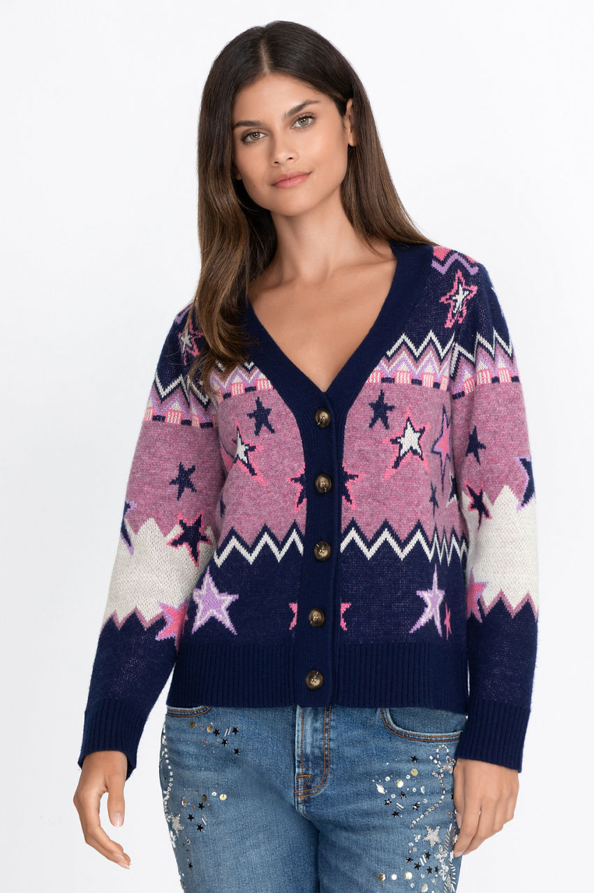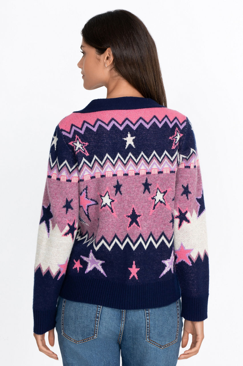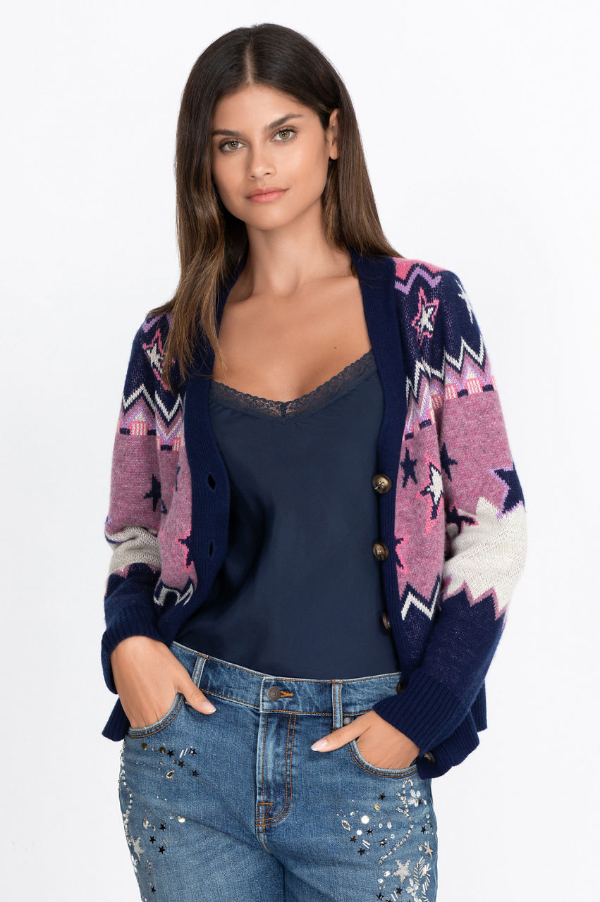 This chic cardigan is a fashion must-have with its star motif and contrasting placket. The design mixes colors and geometrical shapes for a modern and elegant effect. This piece is the ideal mix of style and comfort thanks to its comfortable wool construction. Have fun layering this stunning cardigan over a simple white tee and jeans outfit or wear it over your favorite dress.