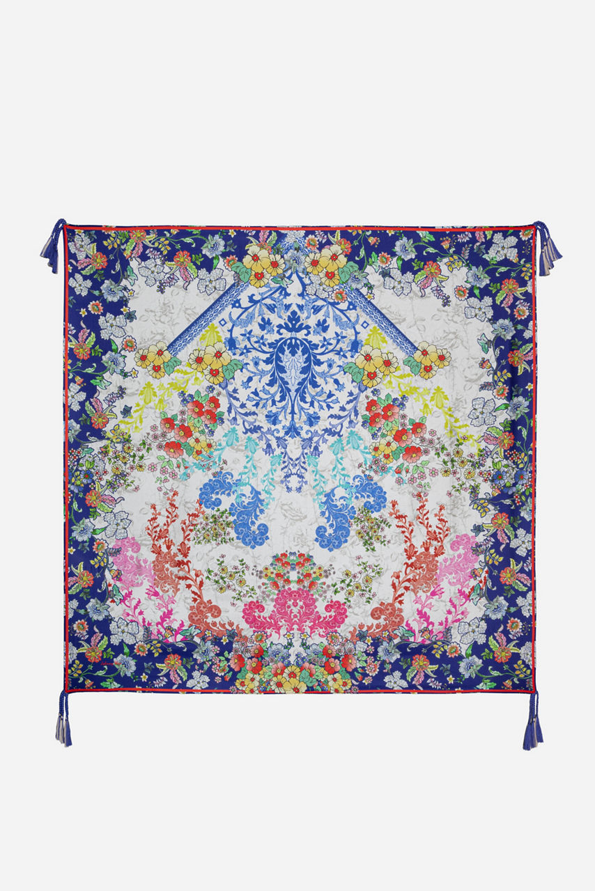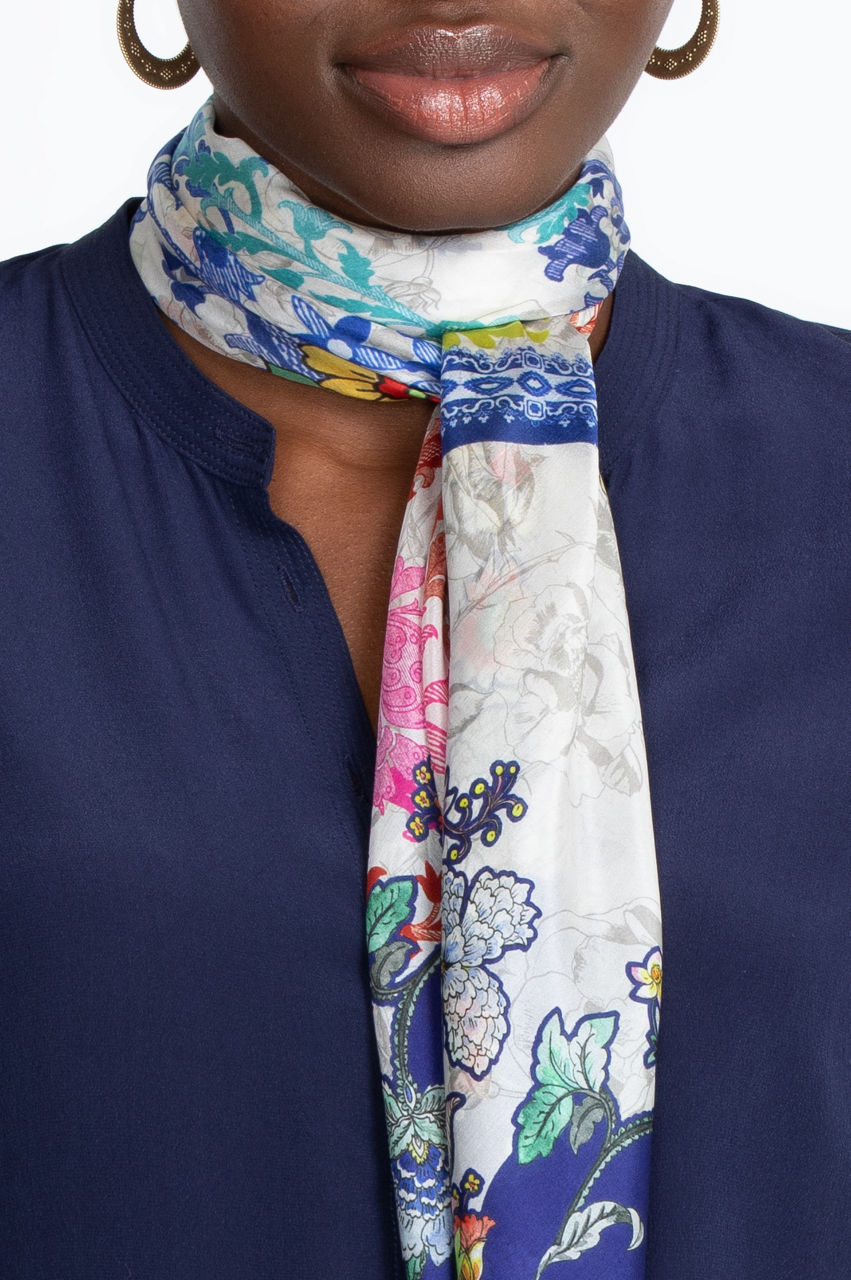 This delicate scarf stands out with its gorgeous floral and other nature-inspired motifs. It s the perfect accessory to introduce color and texture. The contrast between the center and borders of the scarf will create interesting color combinations when tying or draping the scarf. The blue motifs will go great with denim, but you can also use this scarf to add a pop of color to a neutral outfit.
