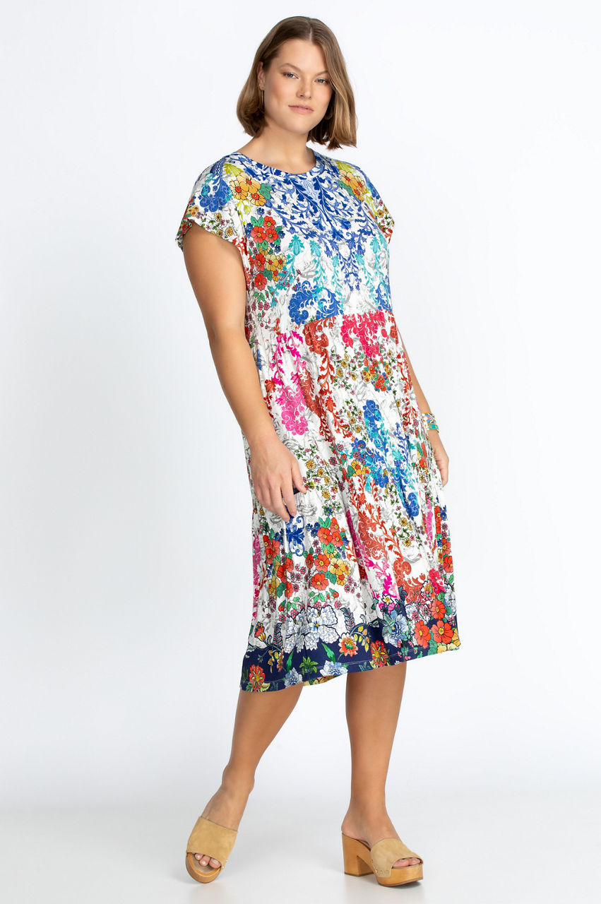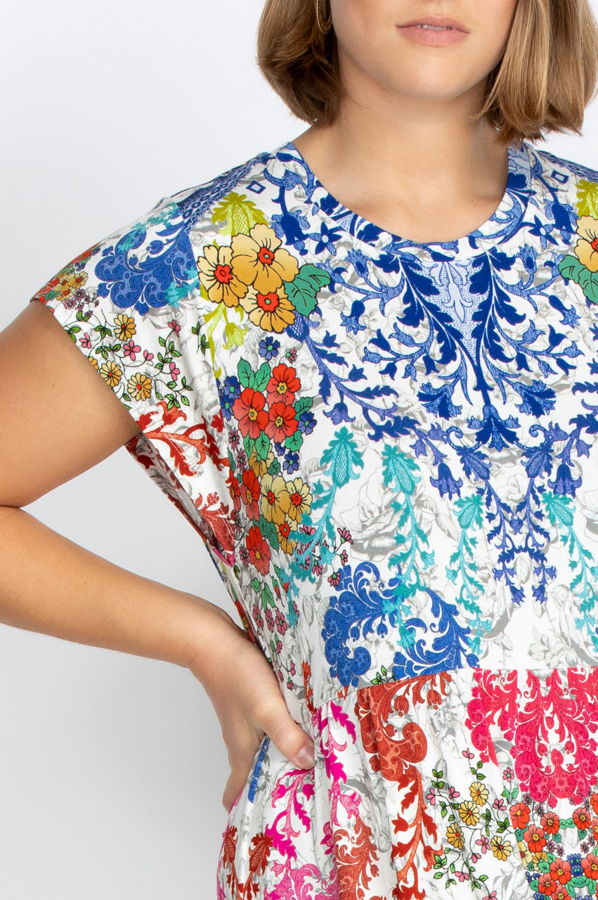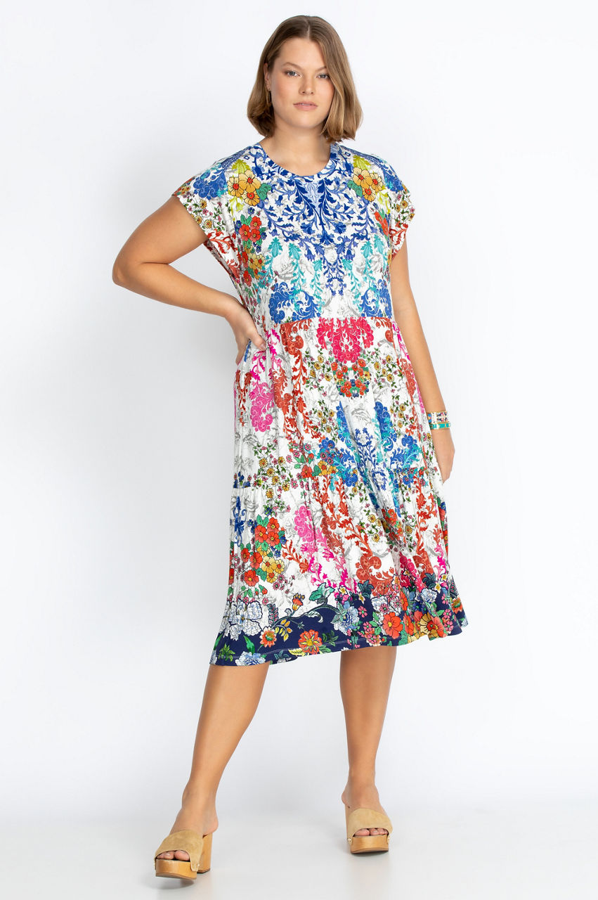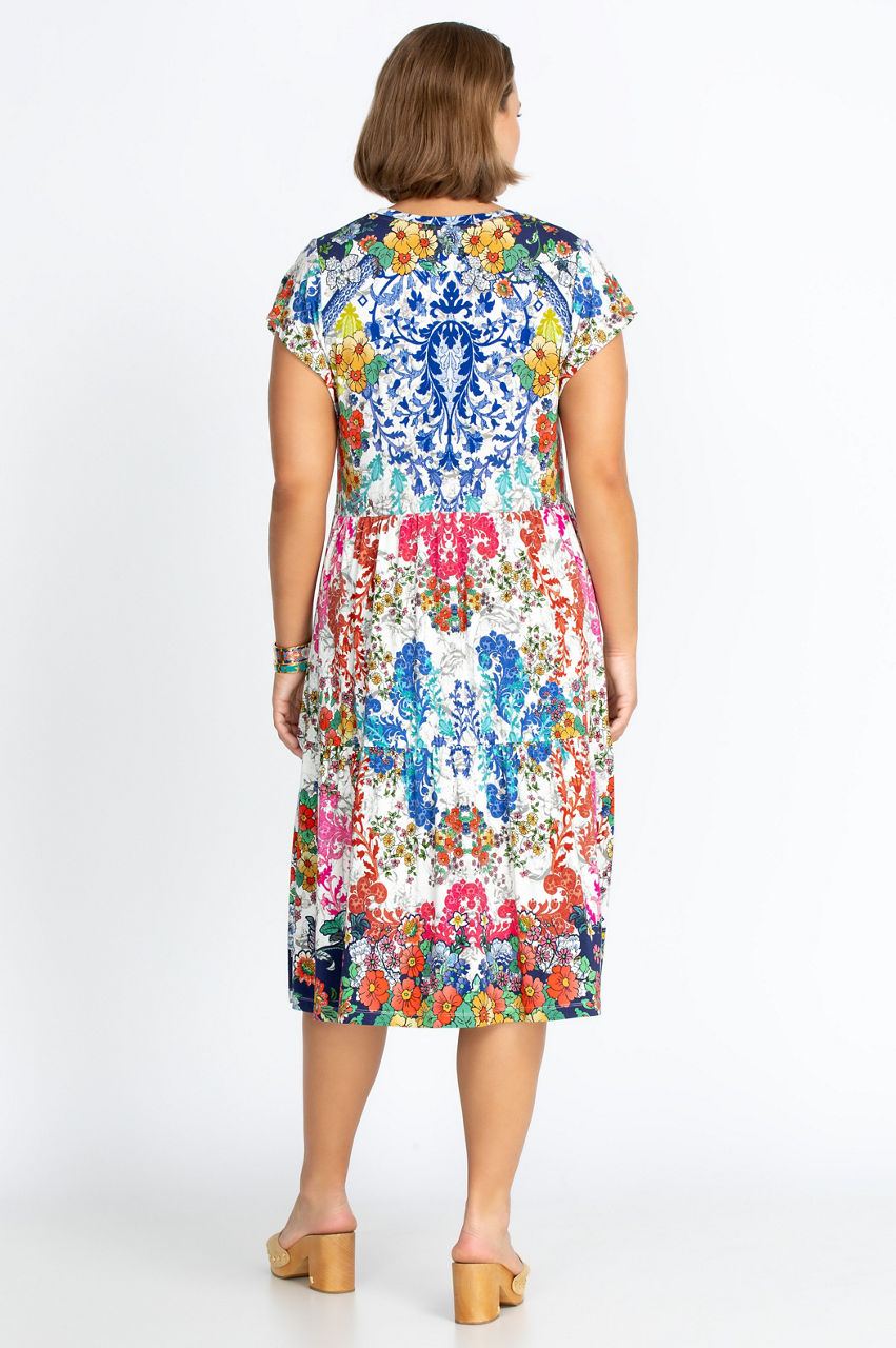 The tiered construction of this stunning tea-length dress creates an unmistakably boho-chic feel. The cap sleeves and rounded collar create a classic silhouette emphasized by the flow of the A-line cut. The print is also noteworthy with its colorful and vibrant details. Style this dress with some heels to dress it up, and add a small crossbody bag in a neutral color to create contrast.