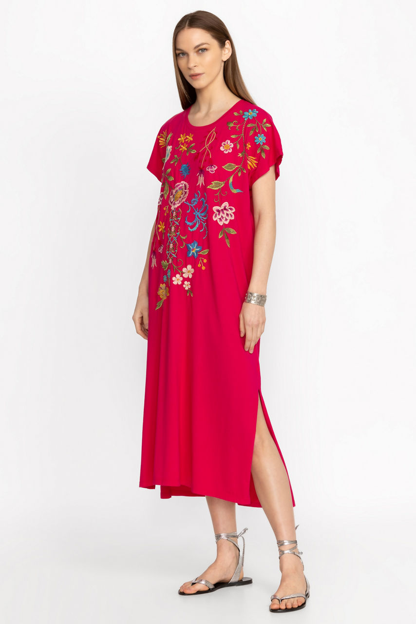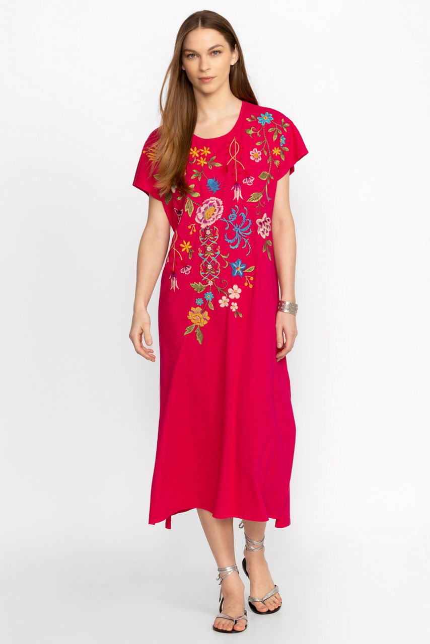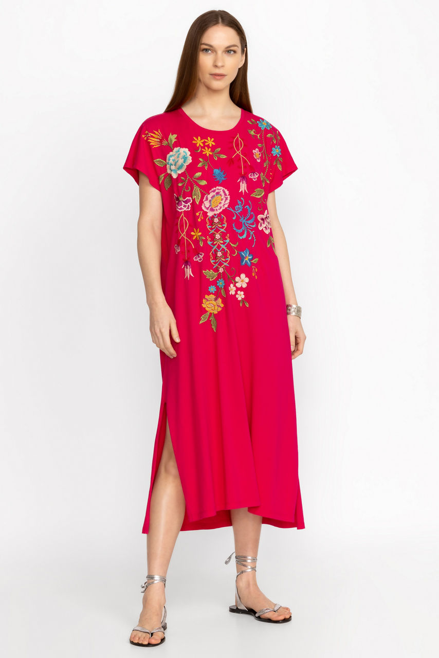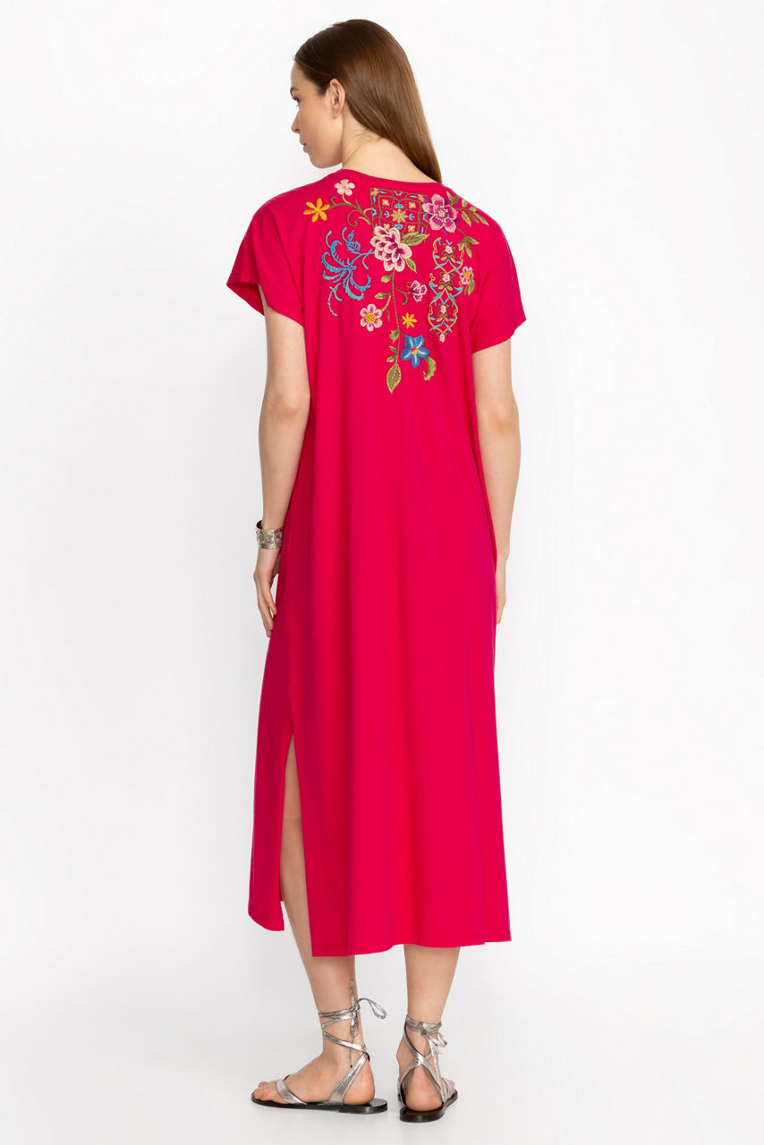Crafted from 100% cotton knit, the Sheri Relaxed Knit Dress is a fresh take on a classic t-shirt dress. Featuring a rounded neckline and capped raglan sleeves, this relaxed-fit dress offers side slits and vibrant placement embroidery at the front and back. Pair with fashion sneakers and a casual tote for a polished weekend vibe.