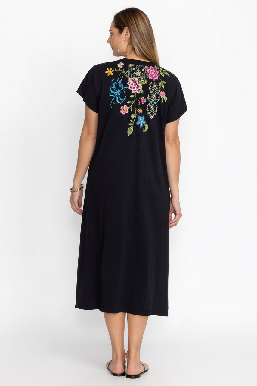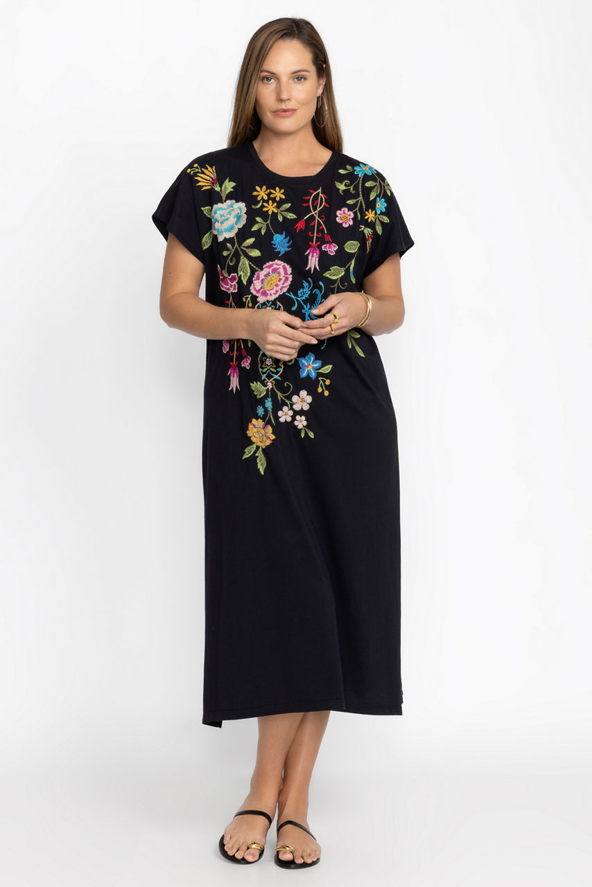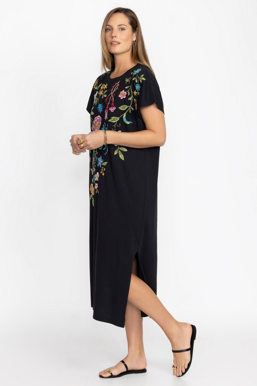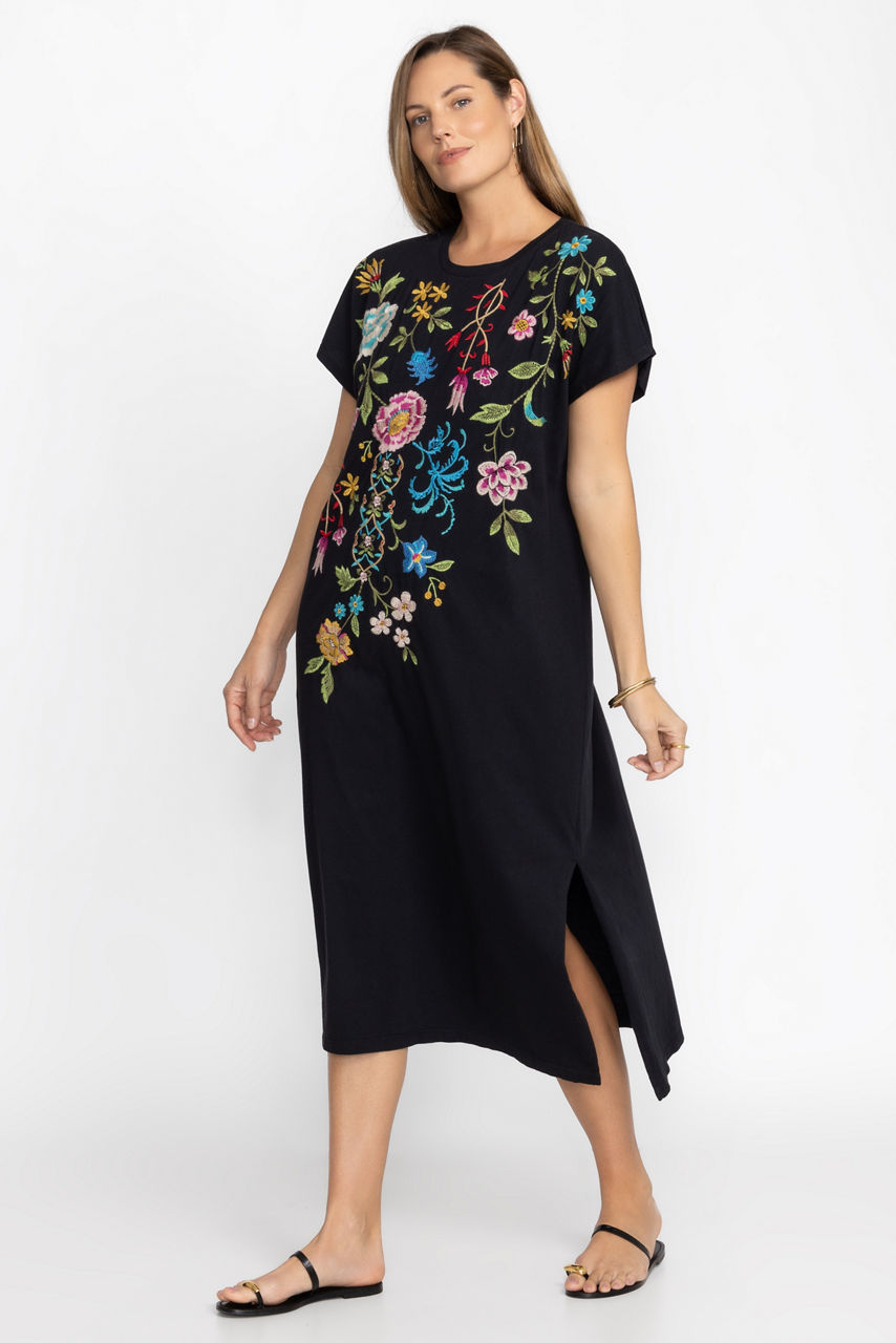 Crafted from 100% cotton knit, the Sheri Relaxed Knit Dress is a fresh take on a classic t-shirt dress. Featuring a rounded neckline and capped raglan sleeves, this relaxed-fit dress offers side slits and vibrant placement embroidery at the front and back. Pair with fashion sneakers and a casual tote for a polished weekend vibe.