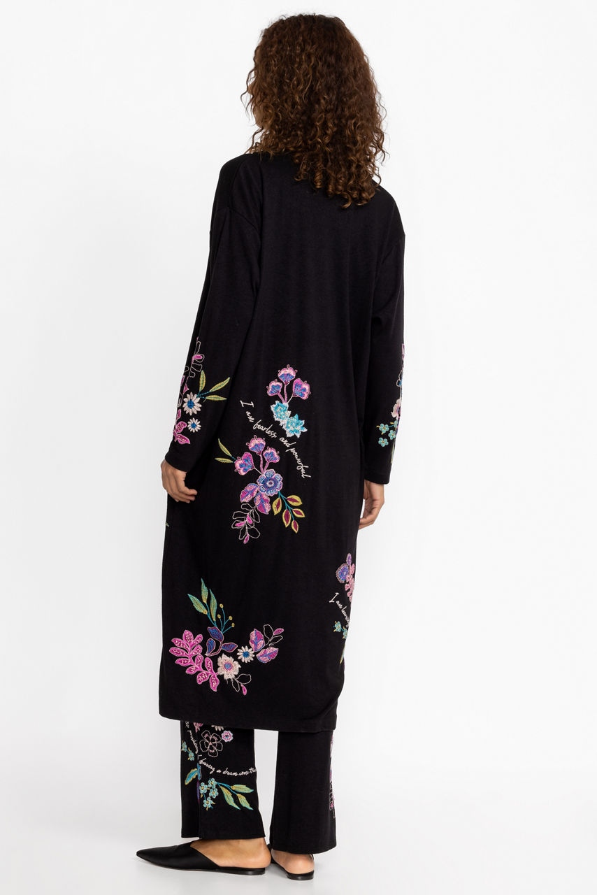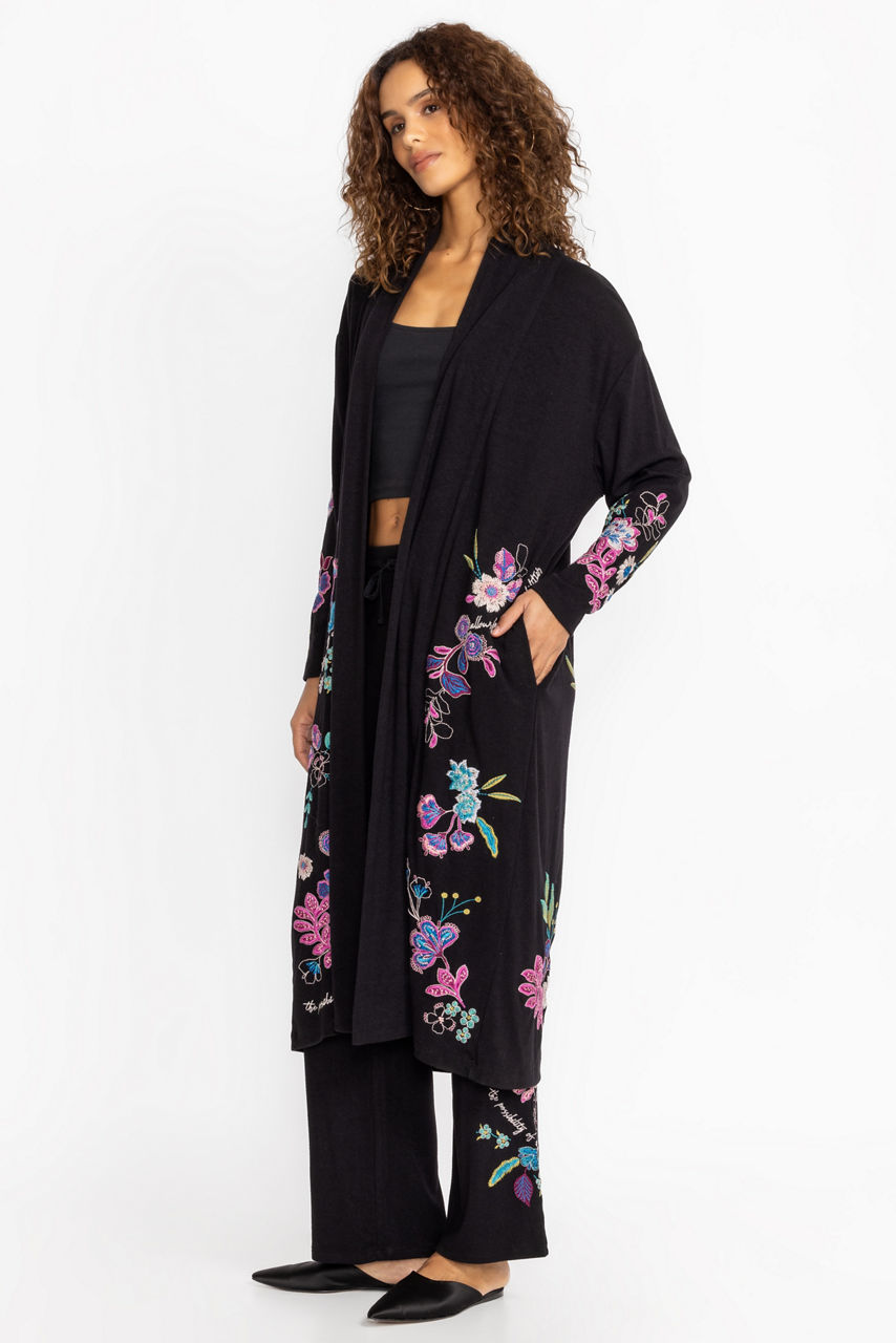 Adding a touch of drama to your casual look, the Shilo Cozy Duster is a chic layering look. Offering an open drape front and easy kimono style sleeves, this relaxed fit duster features brilliant floral embroidery on a rich backdrop for an elegant statement. Layer over a tee and relaxed fit jeans to elevate your casual style.