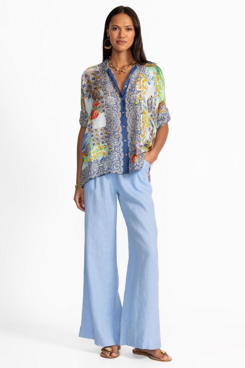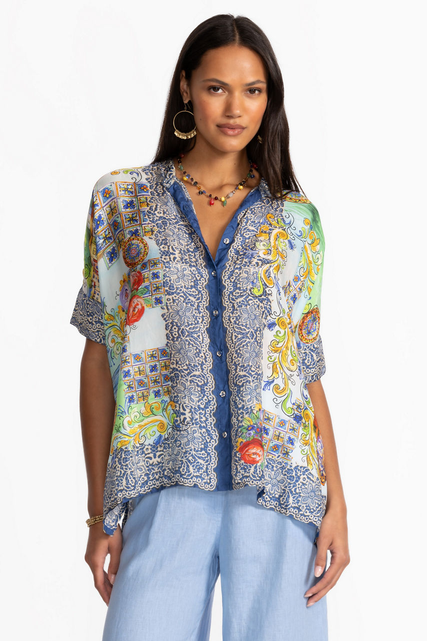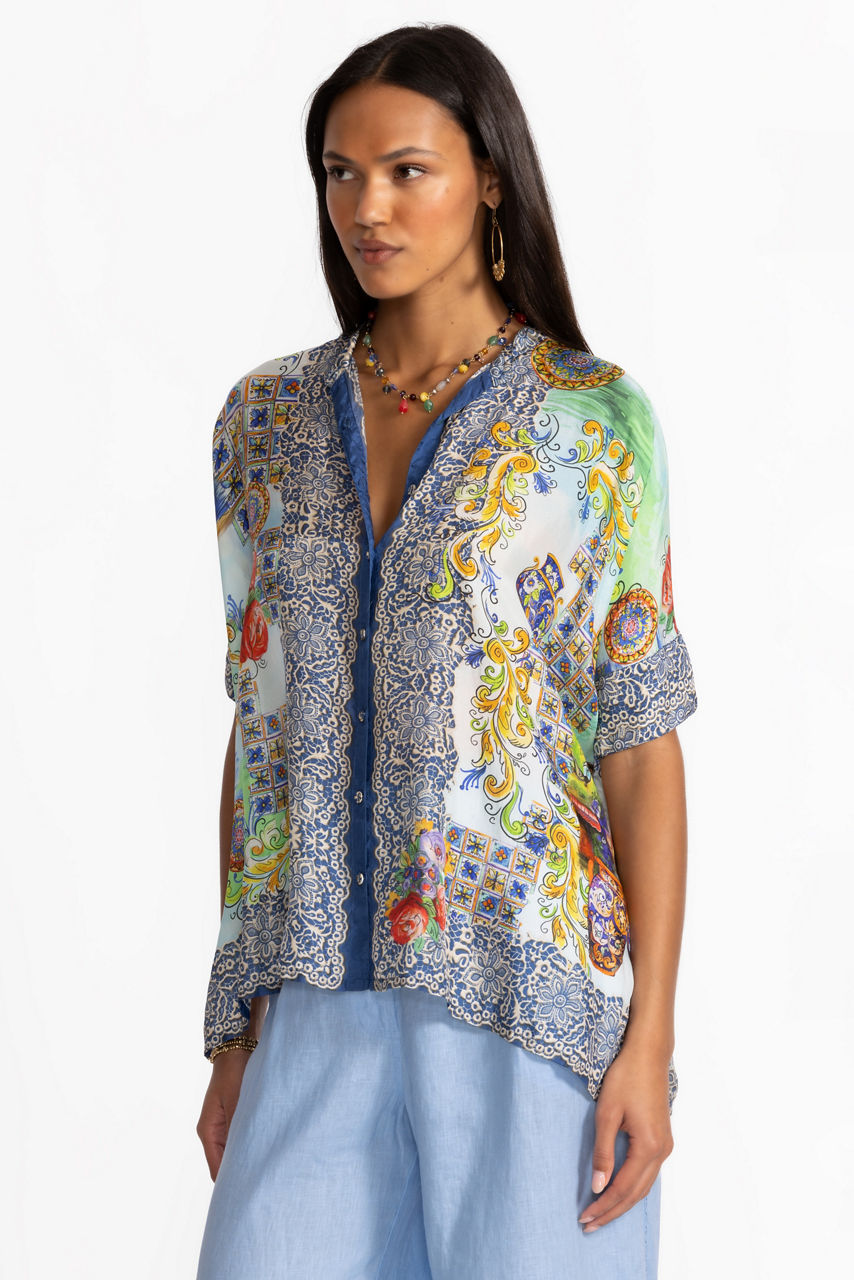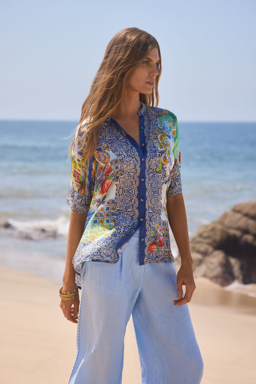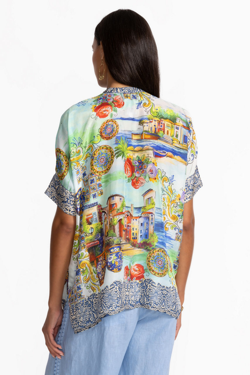 Crafted from 100% sumptuous silk, the Shiro Buttoned Down Shirt is adorned with a bold scenic pattern accented with vibrant color. Featuring a banded collar with a button-front, this relaxed-fit blouse offers Dolman sleeves and side slits. Pair with coordinating silk pants and kitten heels for a posh resort-ready ensemble.