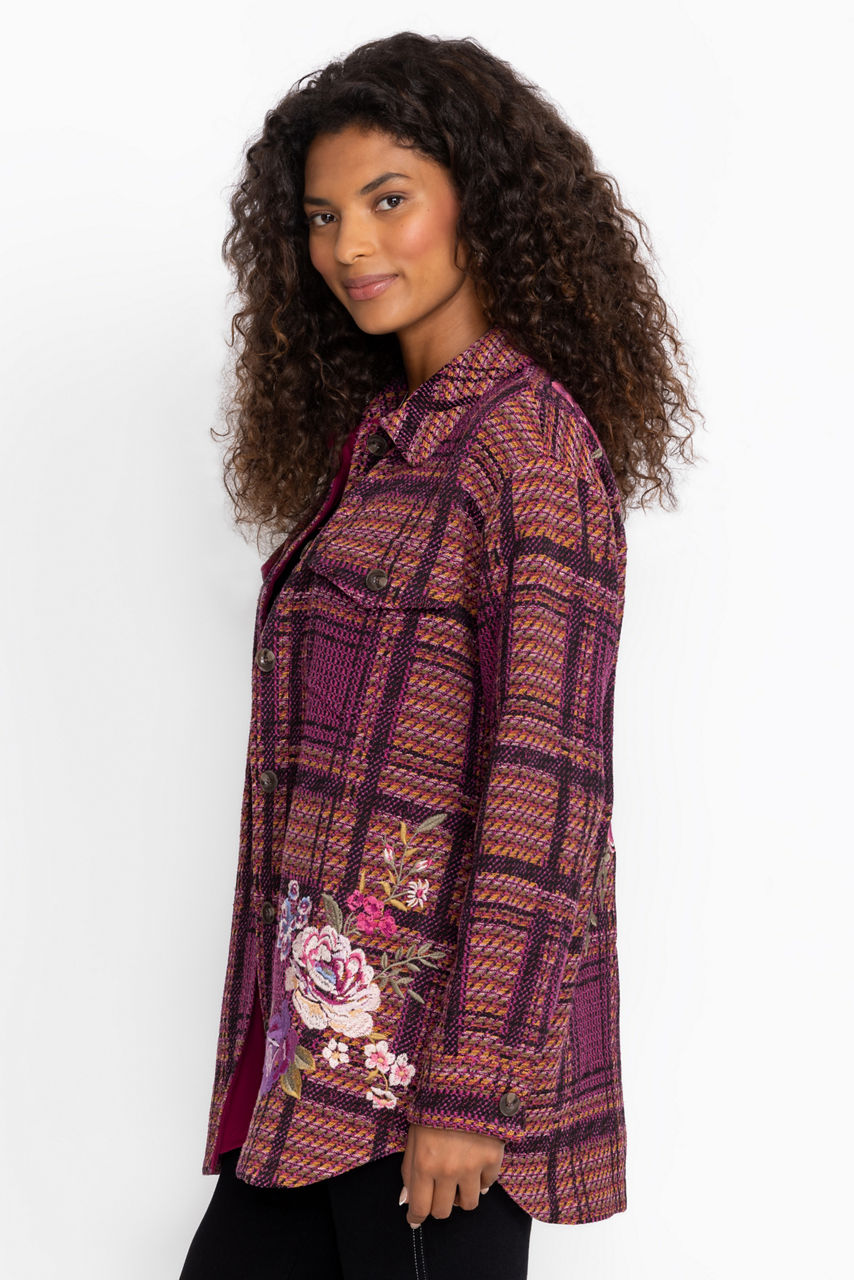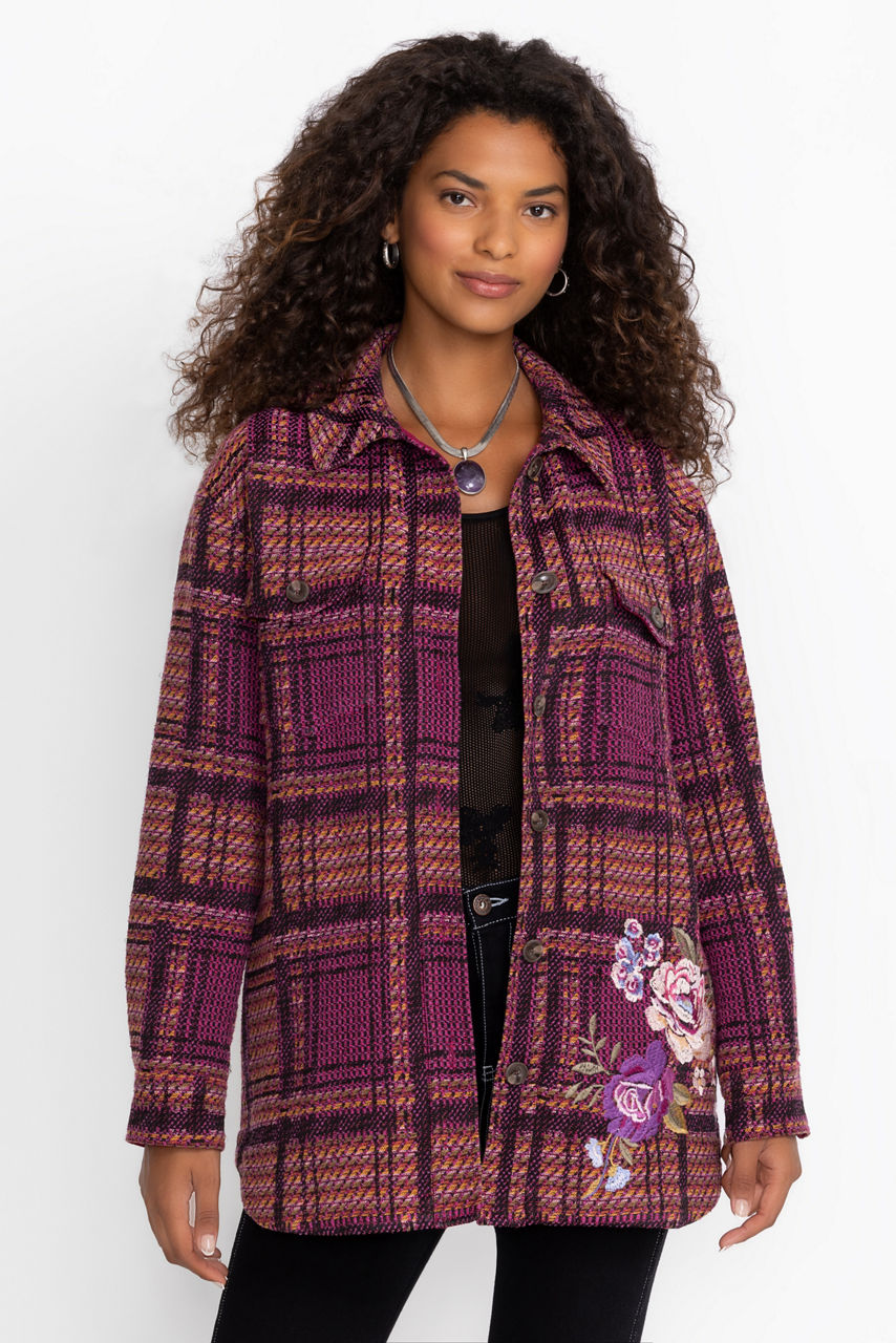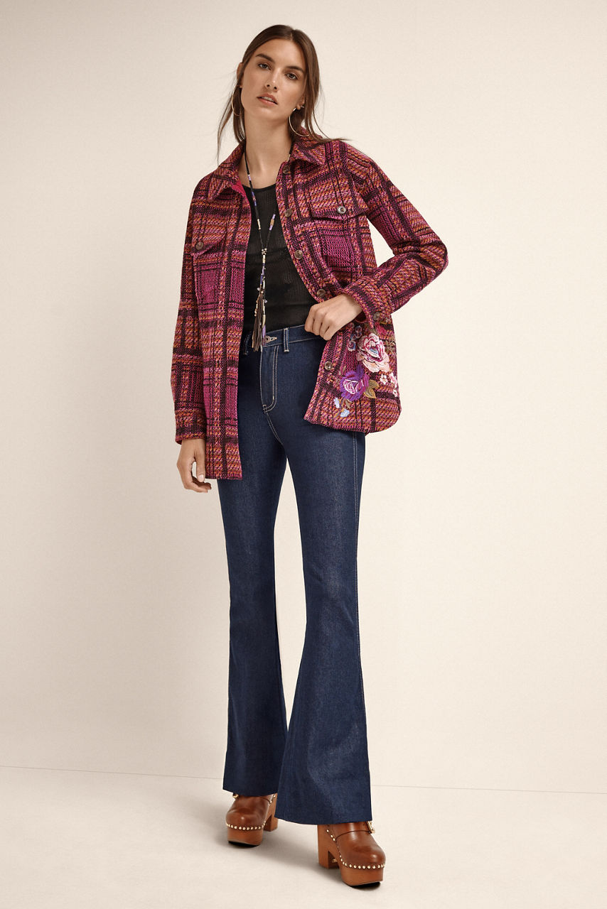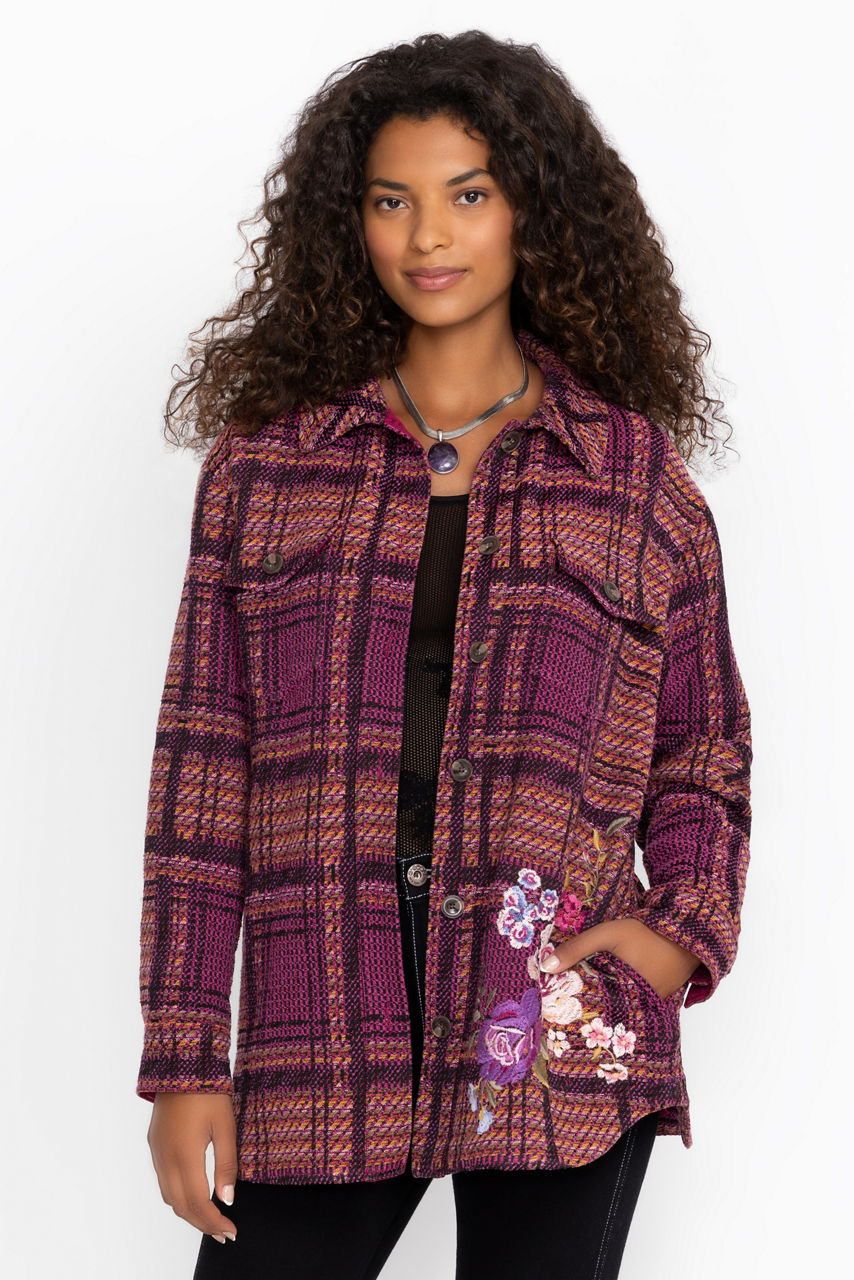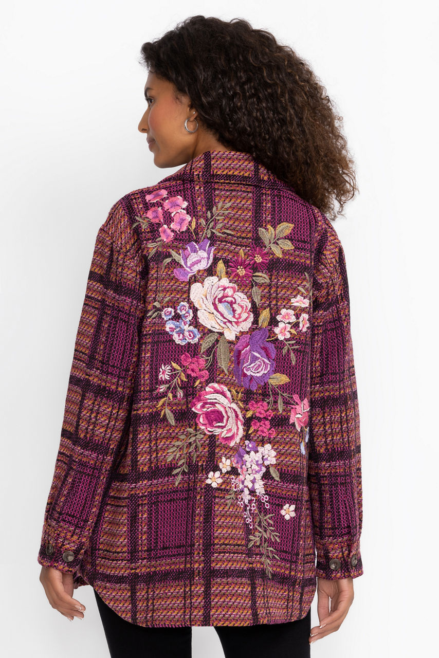 Crafted from a cozy cotton blend, the Shirt Jacket offers a fresh, feminine twist on a classic masculine staple. Featuring a traditional collared button-front, this rich plaid jacket is accented with bold floral embroidery at the front and back and is finished with practical pockets. Layer over a coordinating tee and pair with boyfriend jeans and ankle boots for a cool evening out.