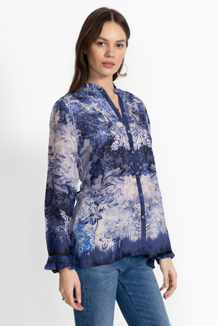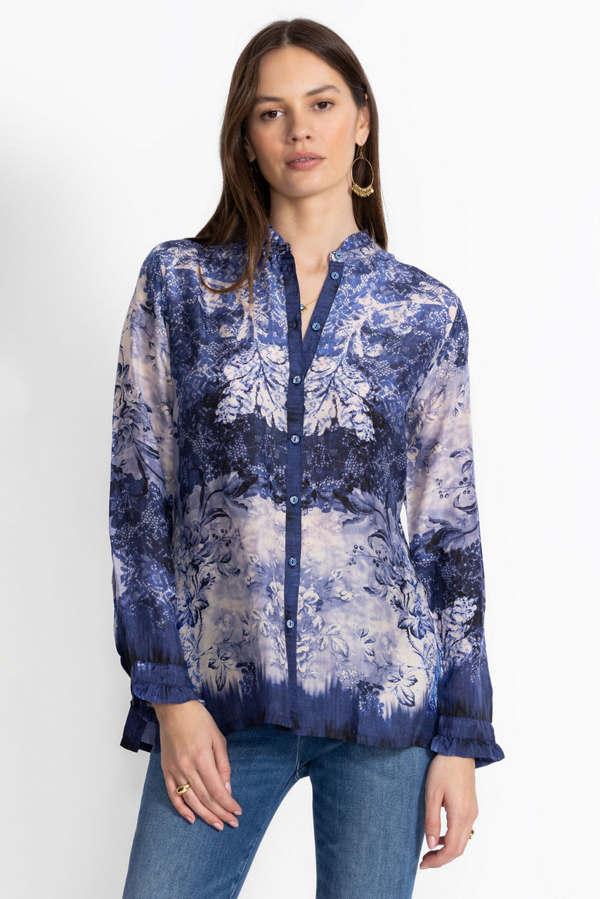 Delightfully embellished with a blue denim lace pattern, the Shivonne Shirt offers a fresh take on a classic button-down. Crafted from 100% sumptuous silk, this shirt features a ruffled collar and sleeve hems and is finished with unique gathers at the back for a more relaxed fit. Pair with a navy skirt and blazer for a modern work ensemble.