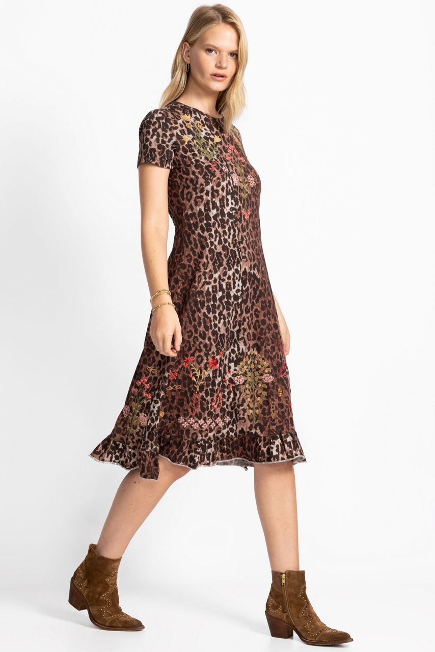 Thoughtfully crafted from breathable 100% cotton, the Short Sleeve Ruffle Hem Dress is embellished with a bold leopard print. Designed with a rounded neckline and short sleeves, this unique dress is accented with intricate floral embroidery for a pop of color. Wear for an evening out paired with coordinating flats and gold jewelry.