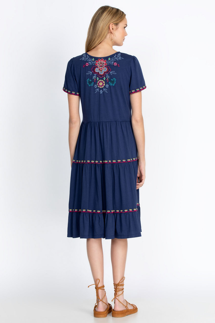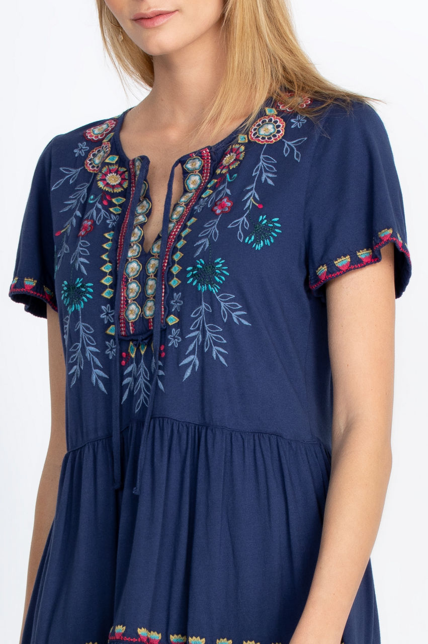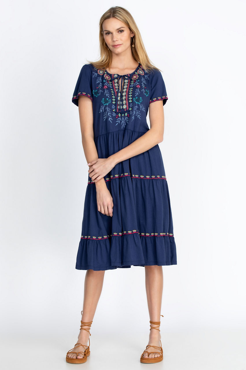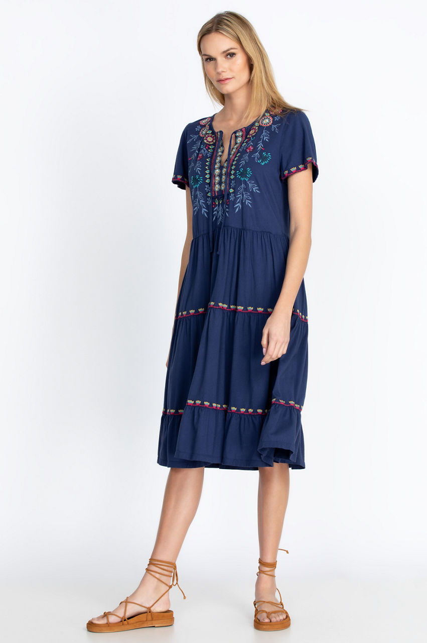 The Sicilia Tiered Knit Dress is a stylish bohemian piece that creates movement and fluidity. The tiered construction and embroidery detail adds structure to the dress, while the unique design of the collar will make this garment stand out. This versatile dress will work with some wedges for a summertime look, but you can also pair it with some knee-high boots and a leather jacket for an effortless fall look.
