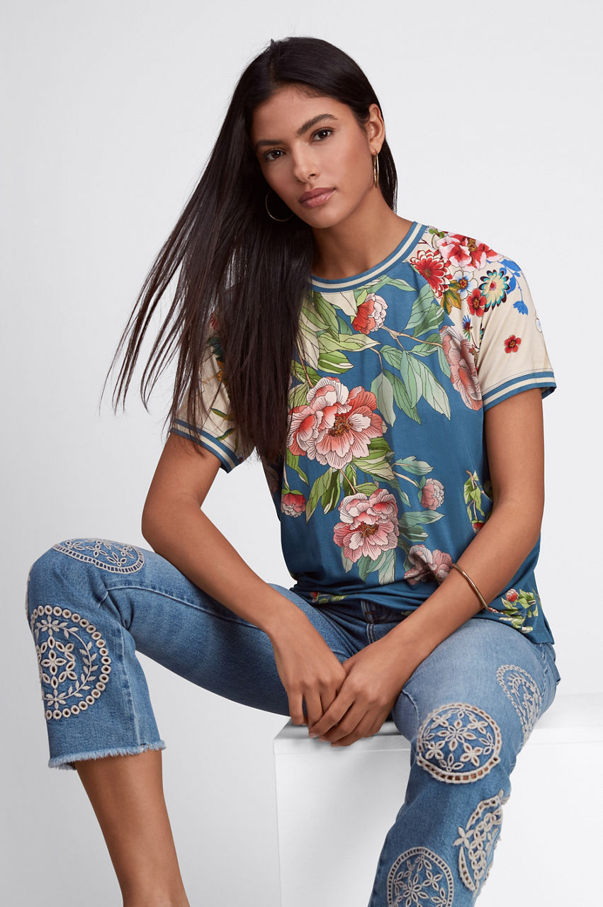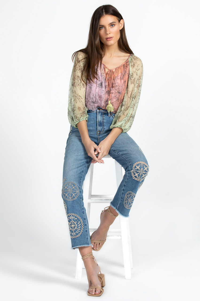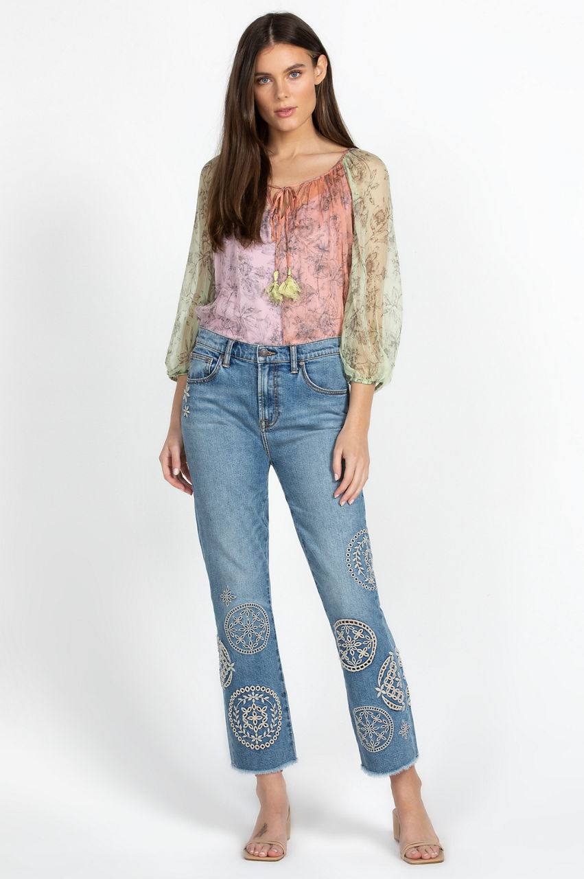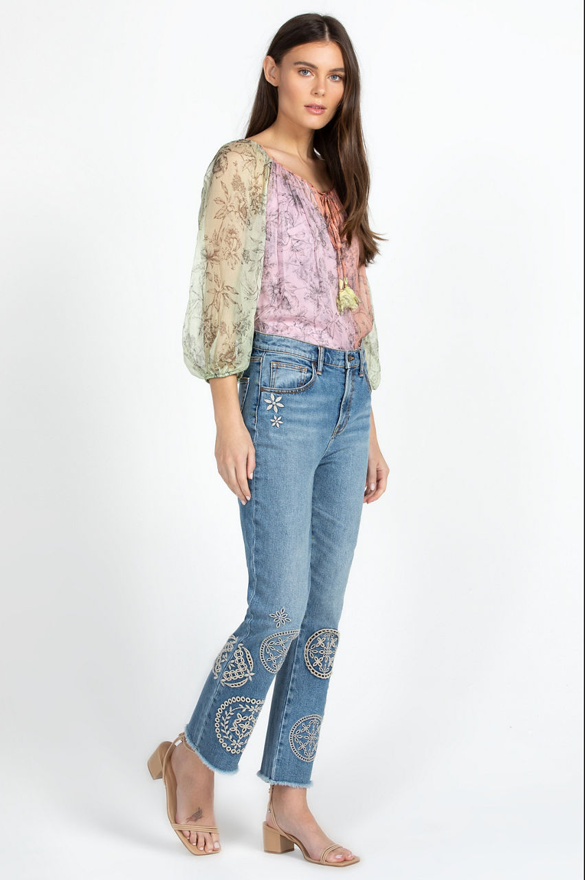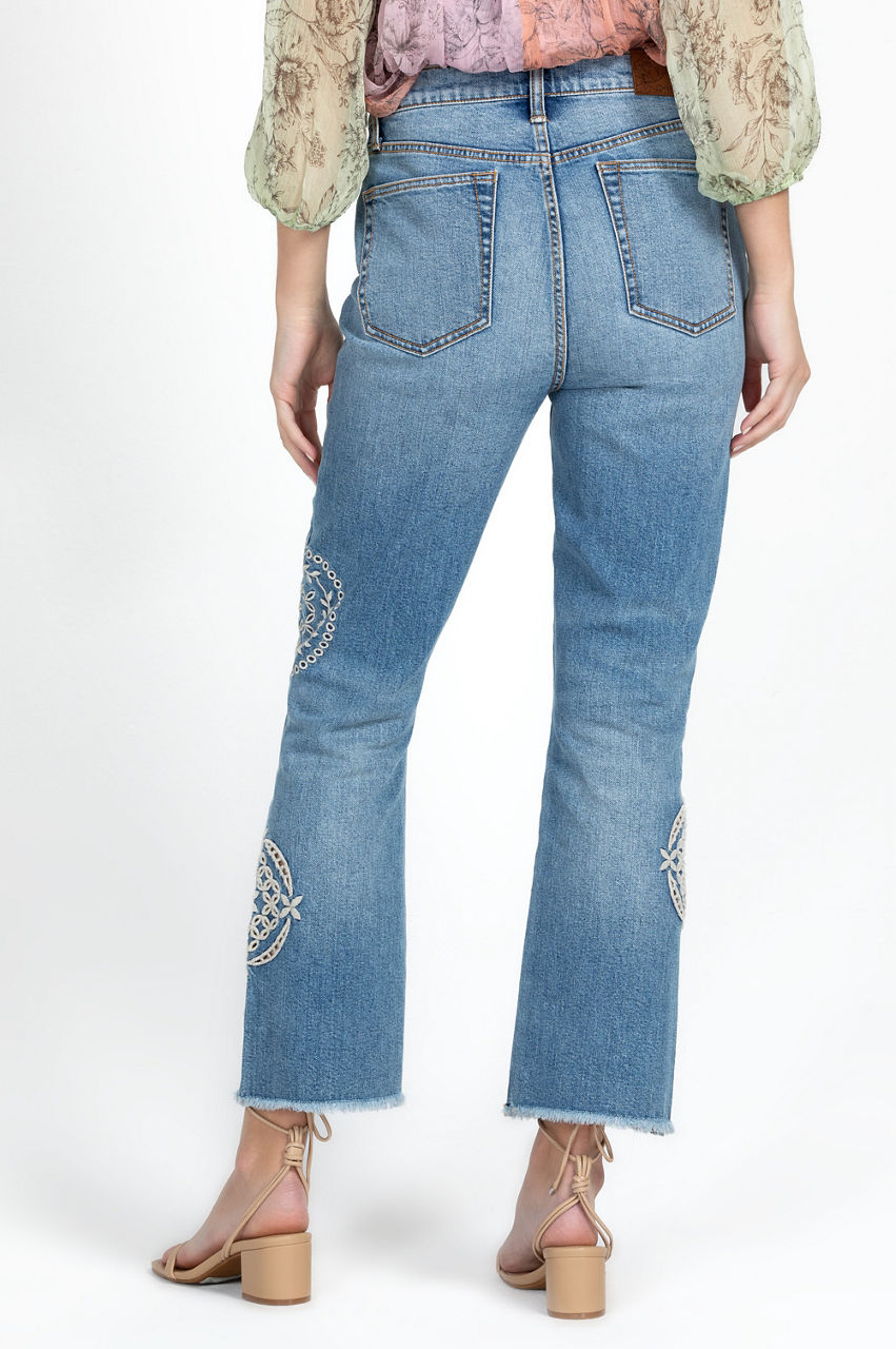 Adopting a free-spirited aesthetic, the Sidney Cropped Baby Boot Jeans are a statement-making rework of a timeless denim style. Crafted from a cotton blend with added stretch for comfort, these jeans feature a classic five-pocket design, a cropped leg, and a standout placement embroidery comprising circular floral motifs. Style with everything from blouses during the week to a pullover on weekends.