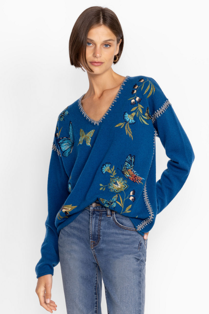 A vibrant take on a functional cold-weather staple, the Sidona Cashmere Whipstitch Pullover injects a shot of color to your new season wardrobe. Designed from a sumptuous wool cashmere blend, this pullover features a flattering V-neck, long sleeves, colorful embroidered flowers, and whipstitch detailing at the neckline and sleeves. Wear this pullover with jeans and boots for a versatile daytime look.