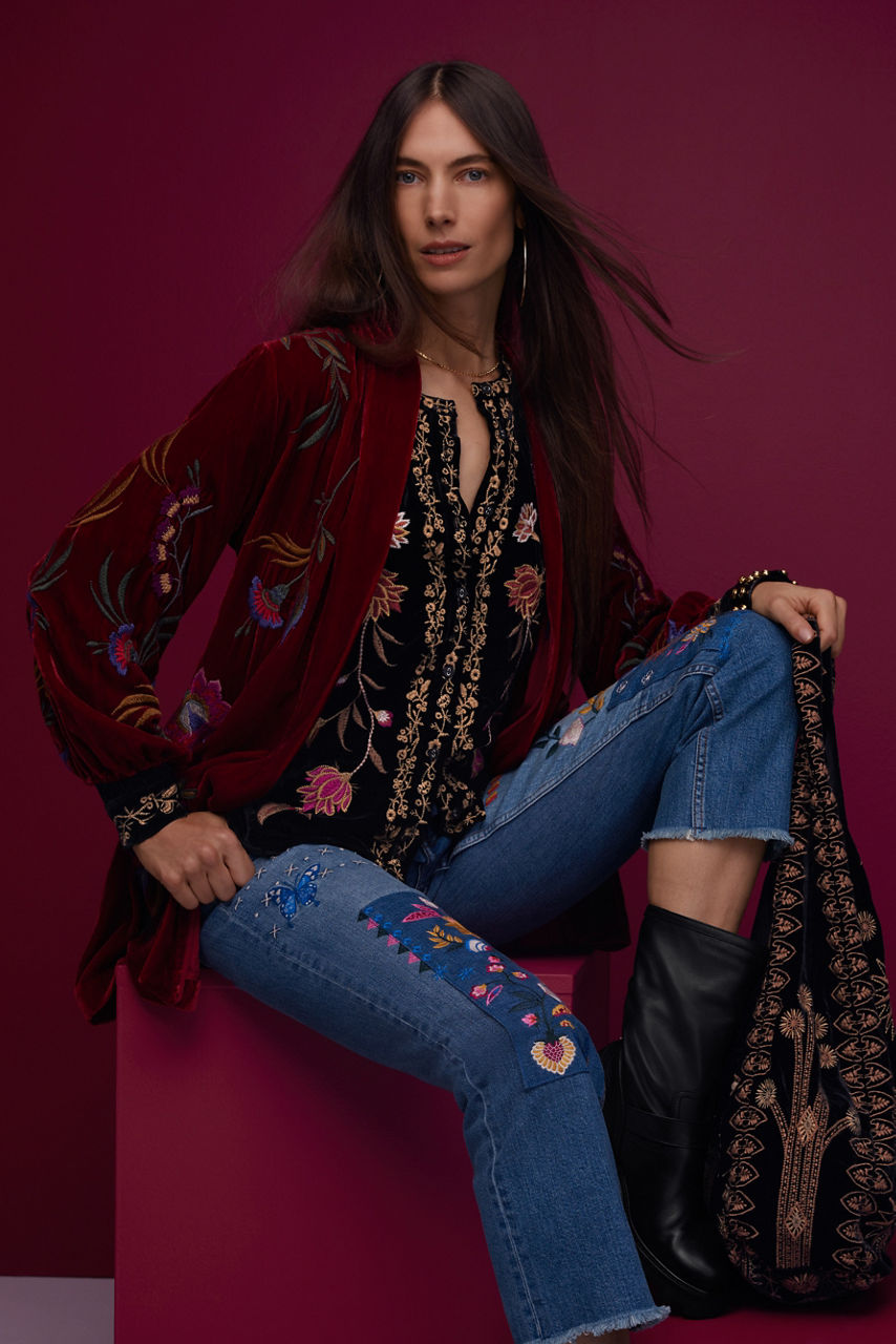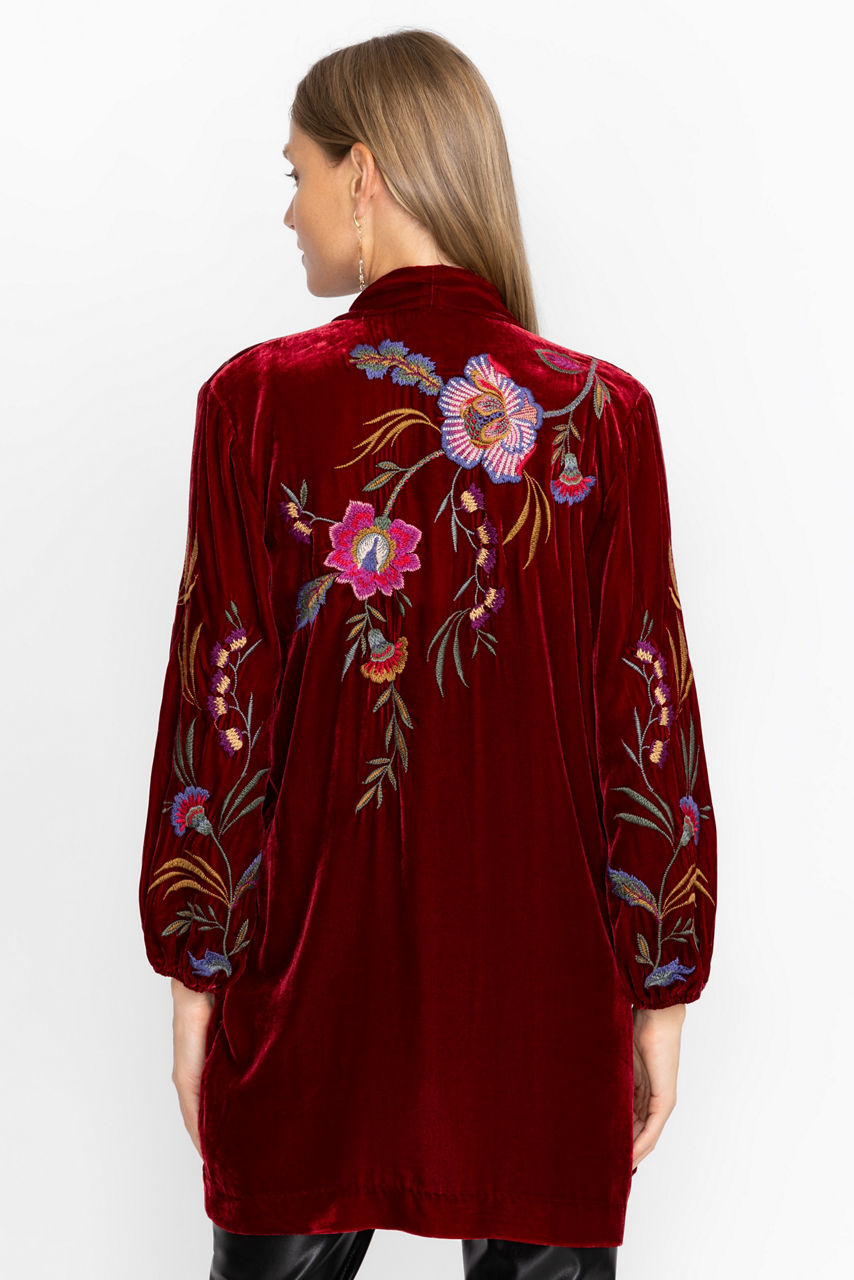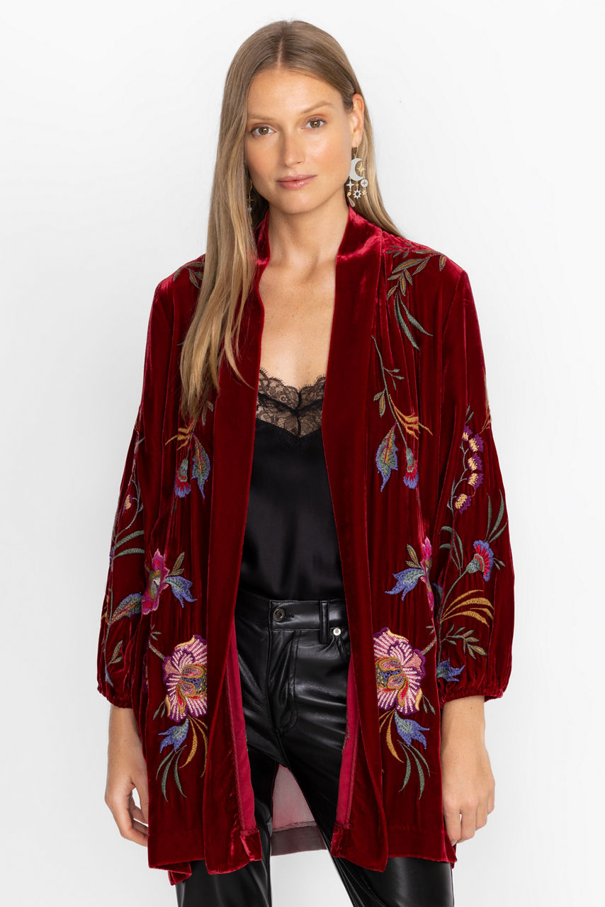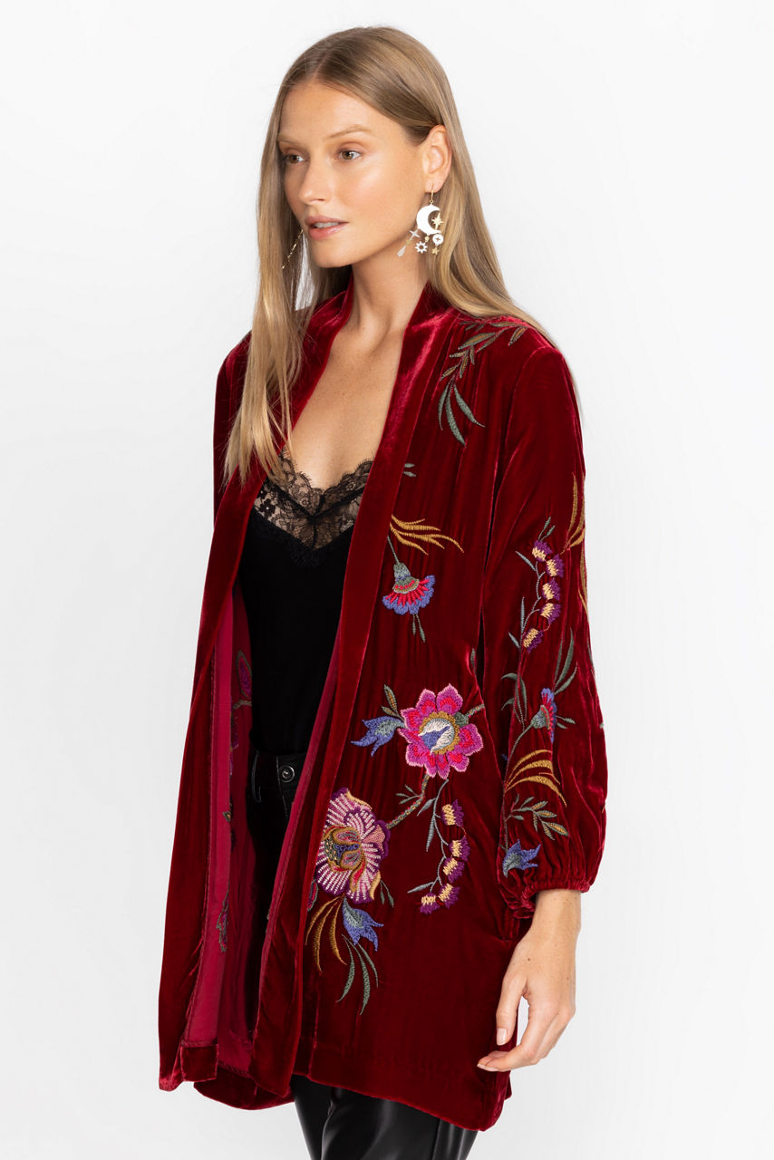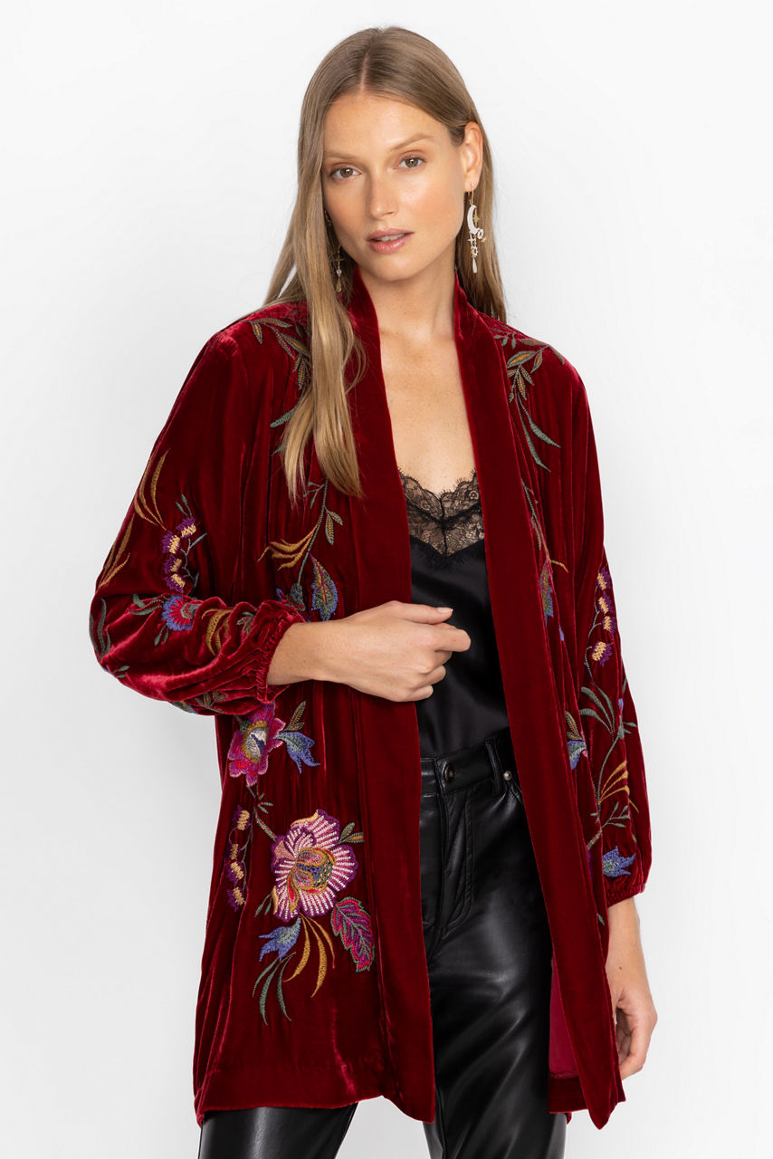 Delivering a divine layering piece, the Sidonia Bishop Sleeve Kimono is a dramatic alternative to a traditional cardigan. Featuring bold embroidered blossoms on a rich backdrop, this open-front kimono features elastic cuff bishop sleeves and pockets. Layer over a vibrant blouse and add a classic pencil skirt for a completed look perfect for the office.